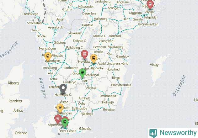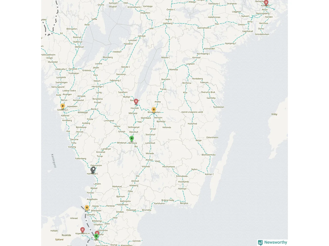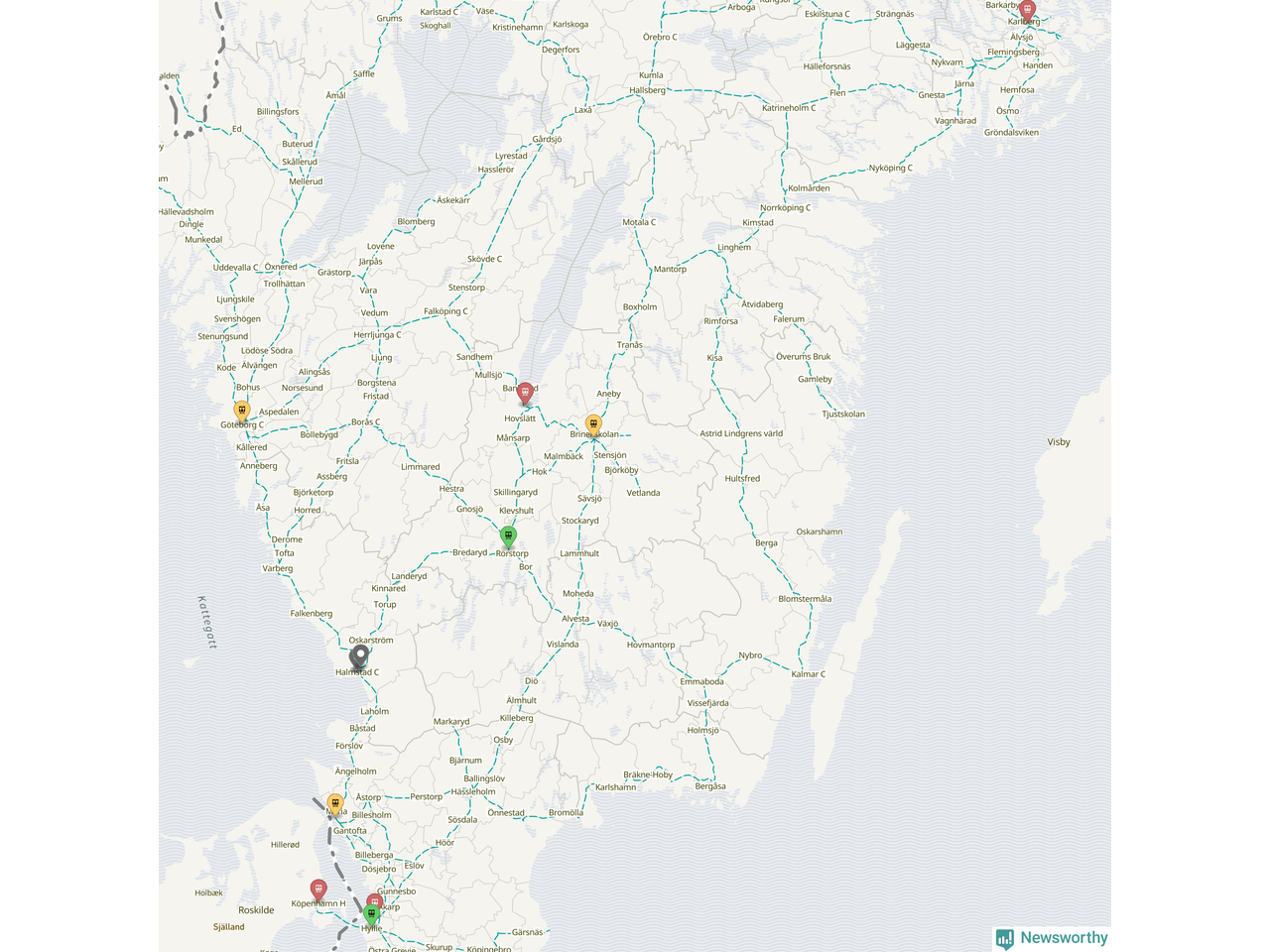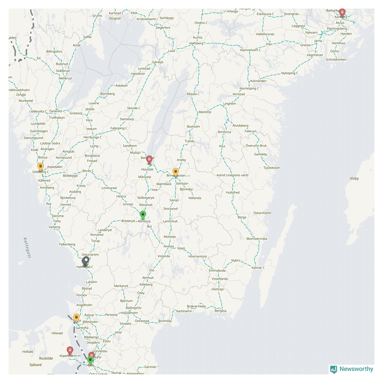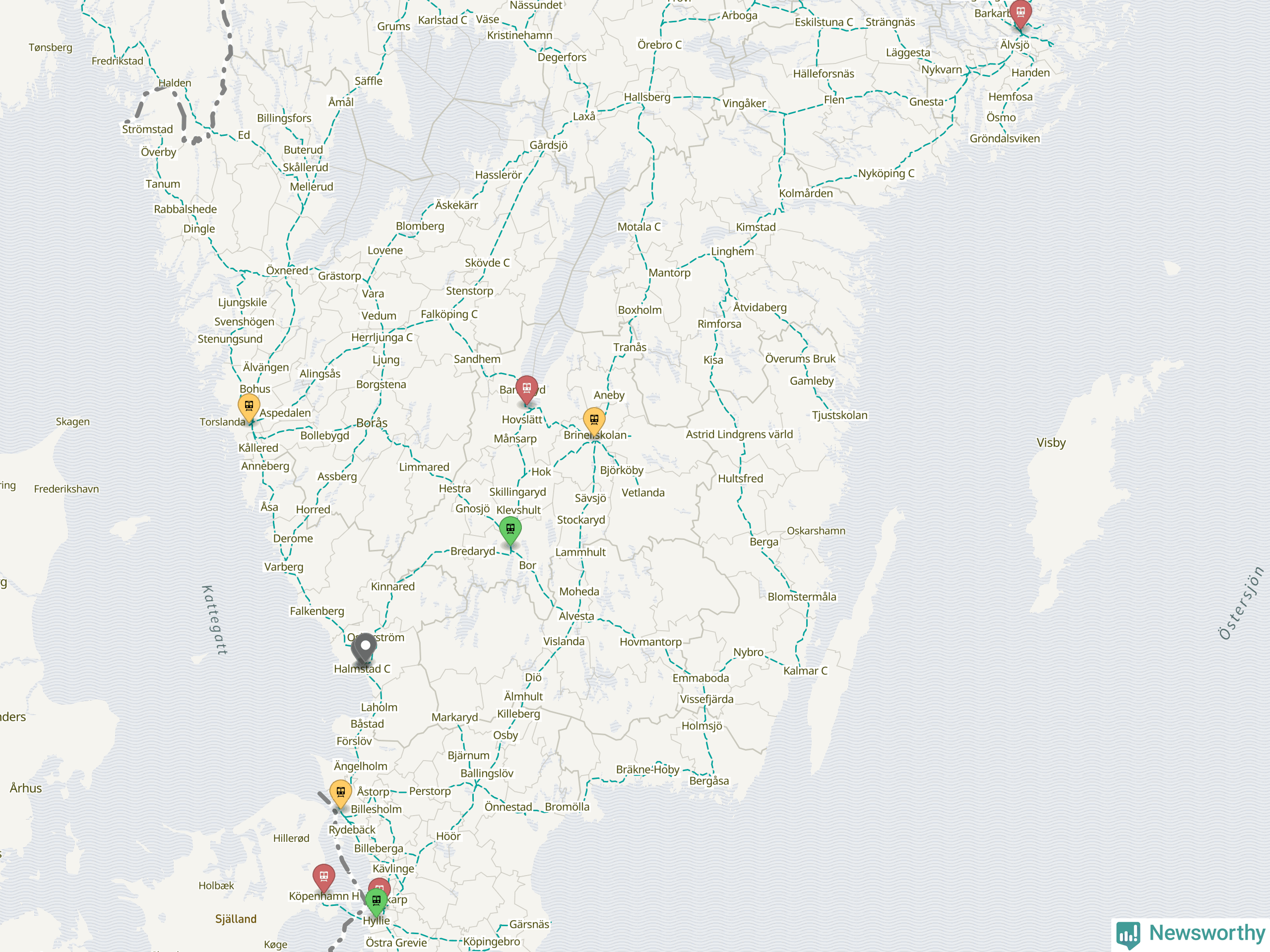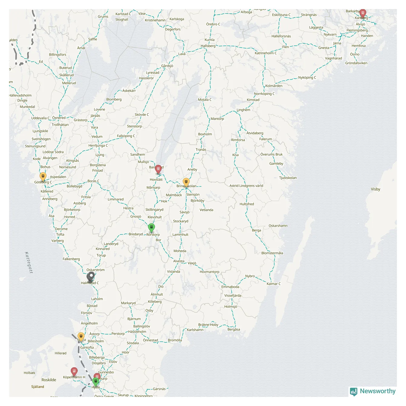 Kartdata från Mapbox, Newsworthy, OpenStreetMap och Trafikverket. Uppgifter om sträckor med passagerartrafik från jarnvag.net.
