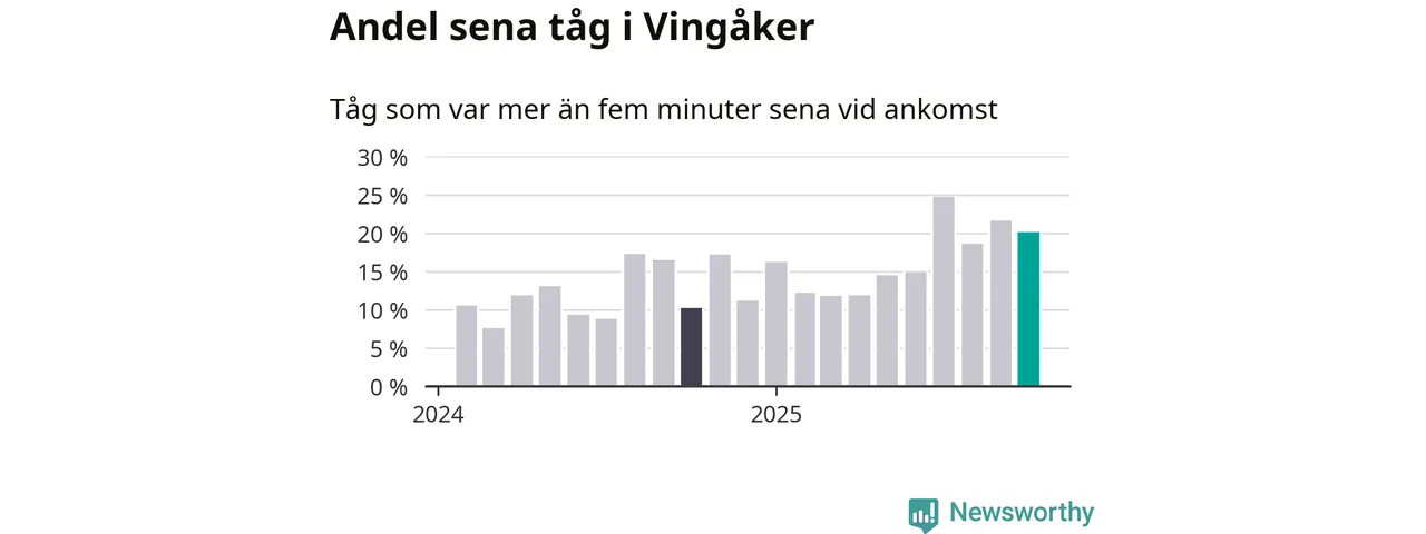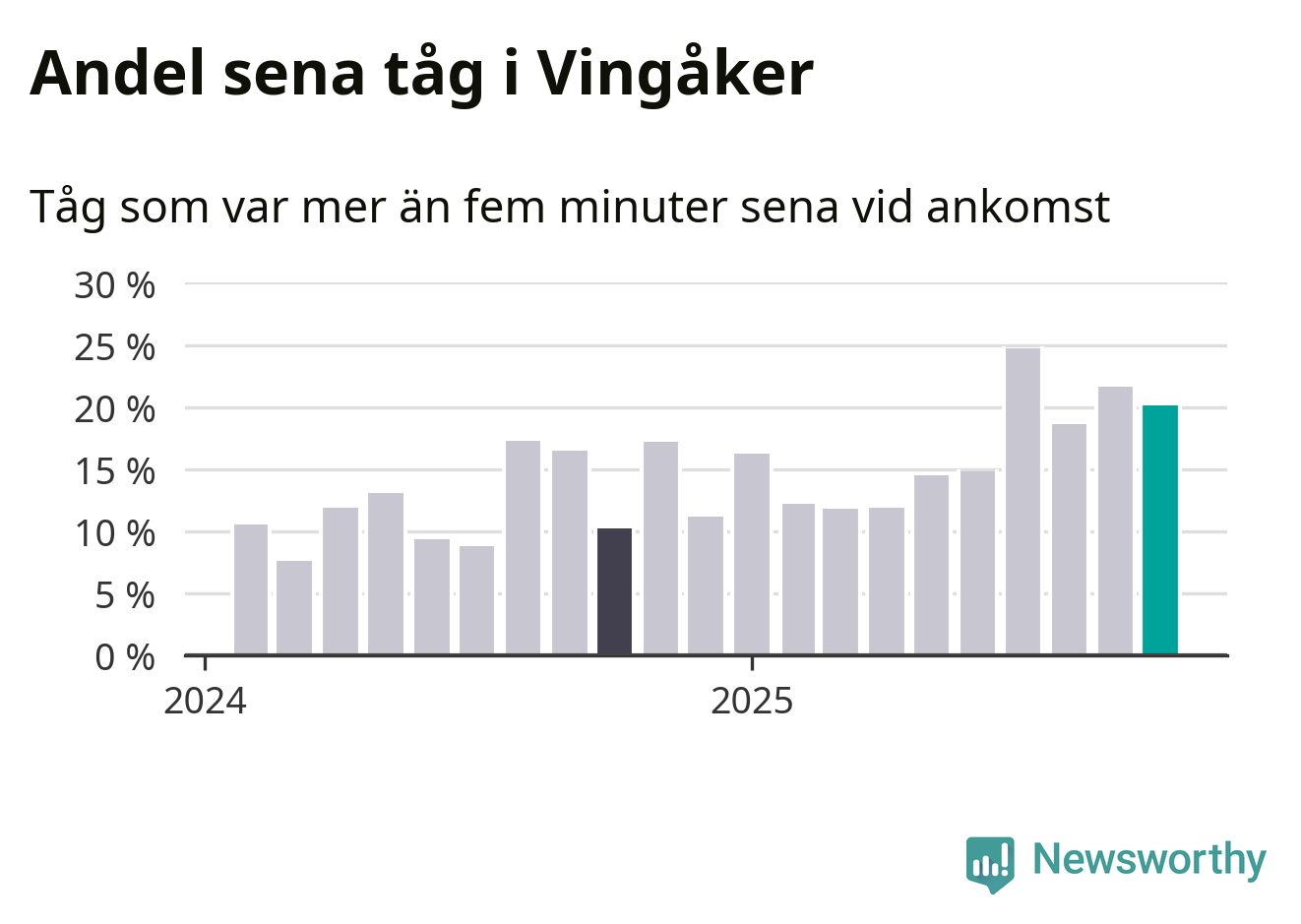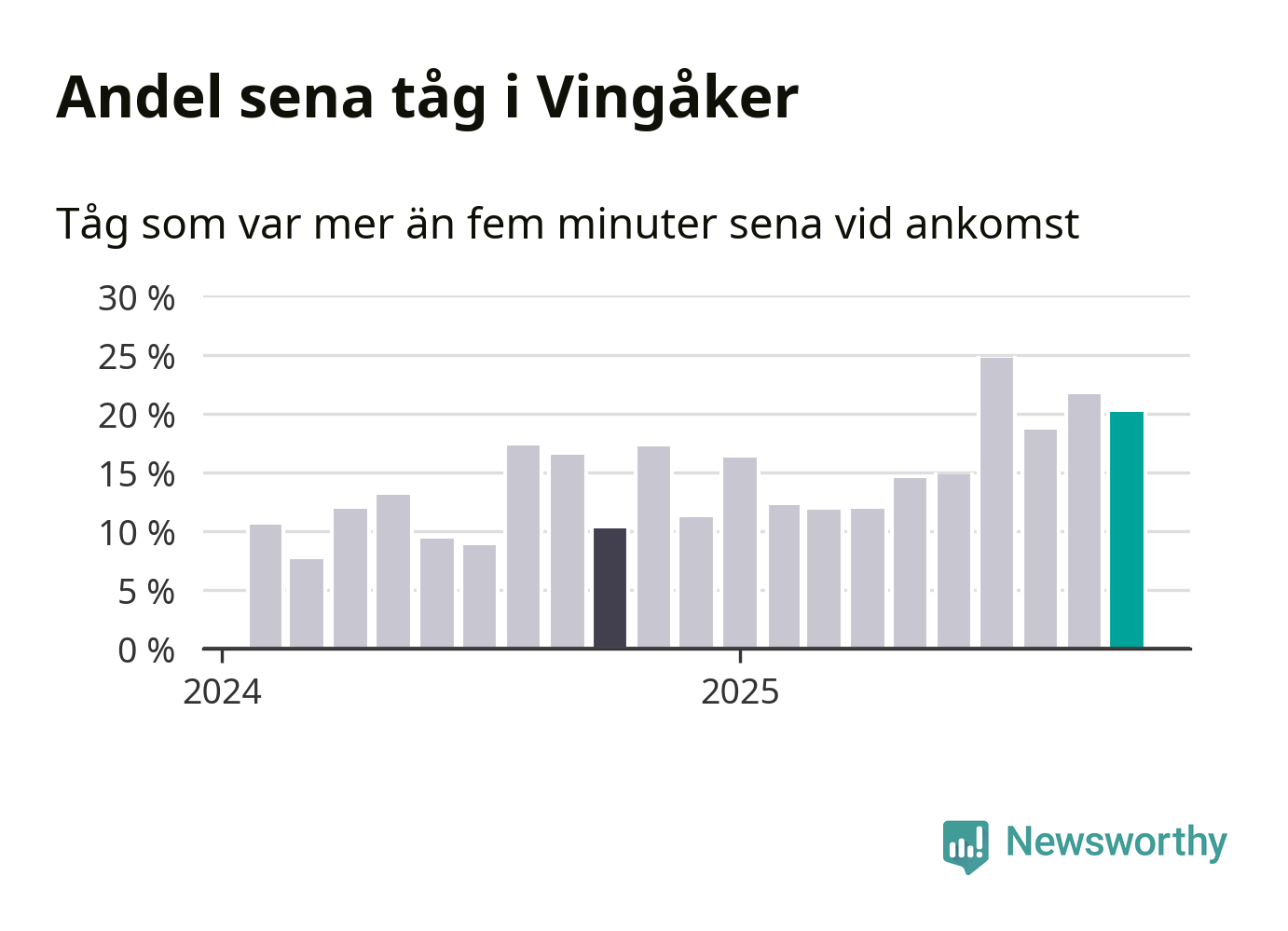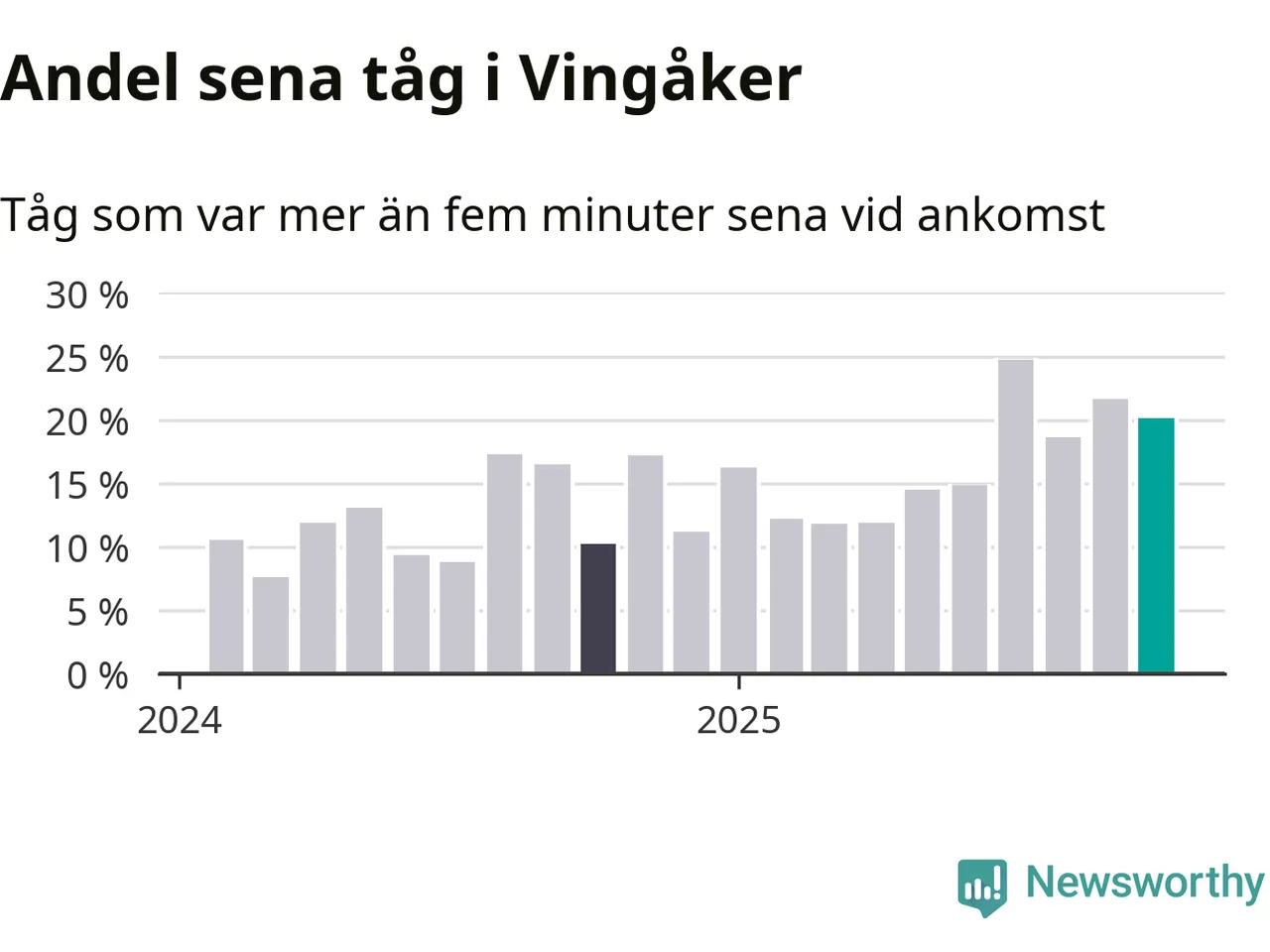 20 procent kan jämföras med 22 procent månaden innan, och tio procent i oktober 2024. Siffrorna bygger på realtidsinformation om tågavgångar och ankomster från Trafikverket, som Newsworthy löpande samlar in.
