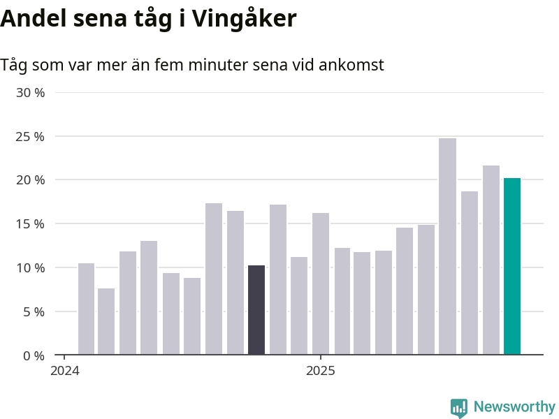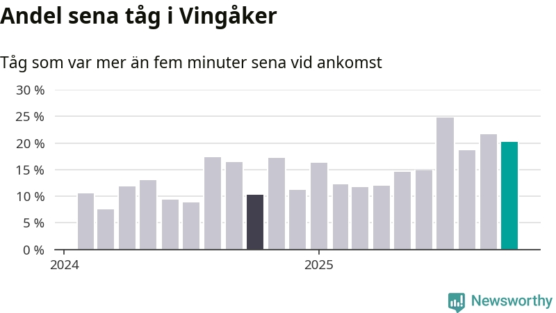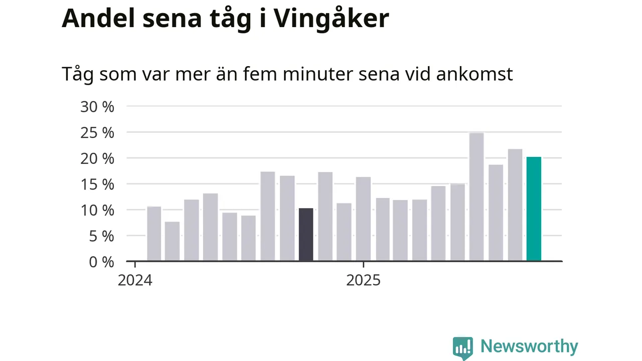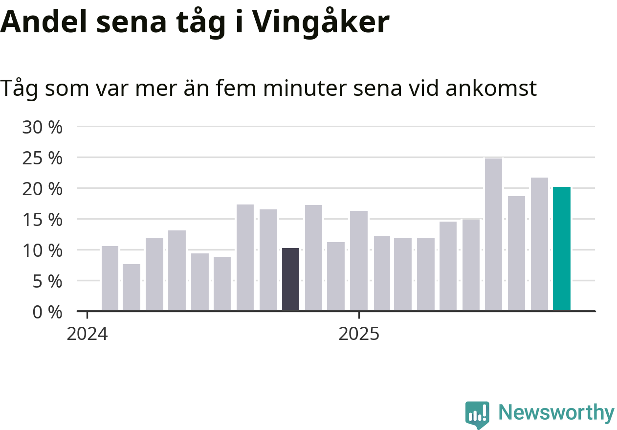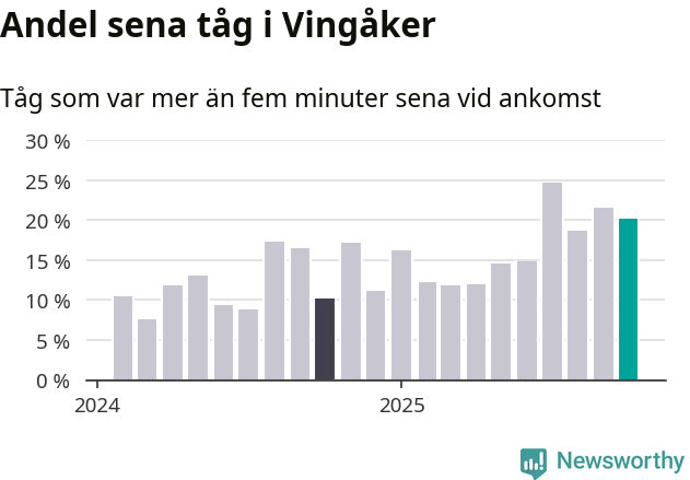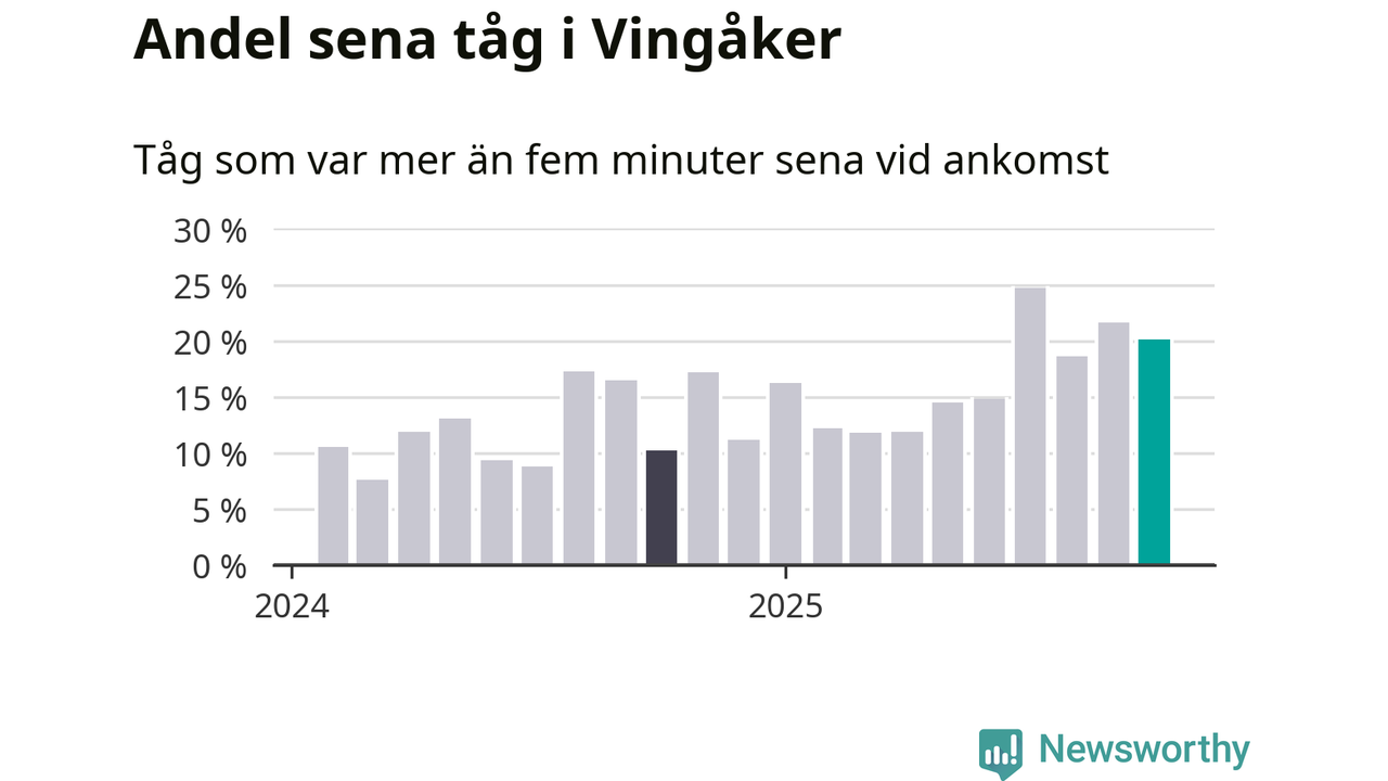 20 procent kan jämföras med 22 procent månaden innan, och tio procent i oktober 2024. Siffrorna bygger på realtidsinformation om tågavgångar och ankomster från Trafikverket, som Newsworthy löpande samlar in.