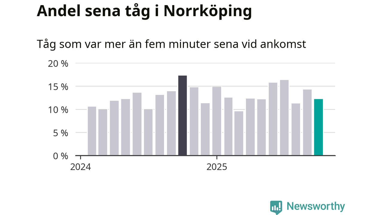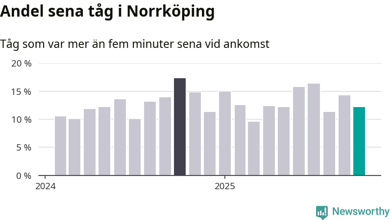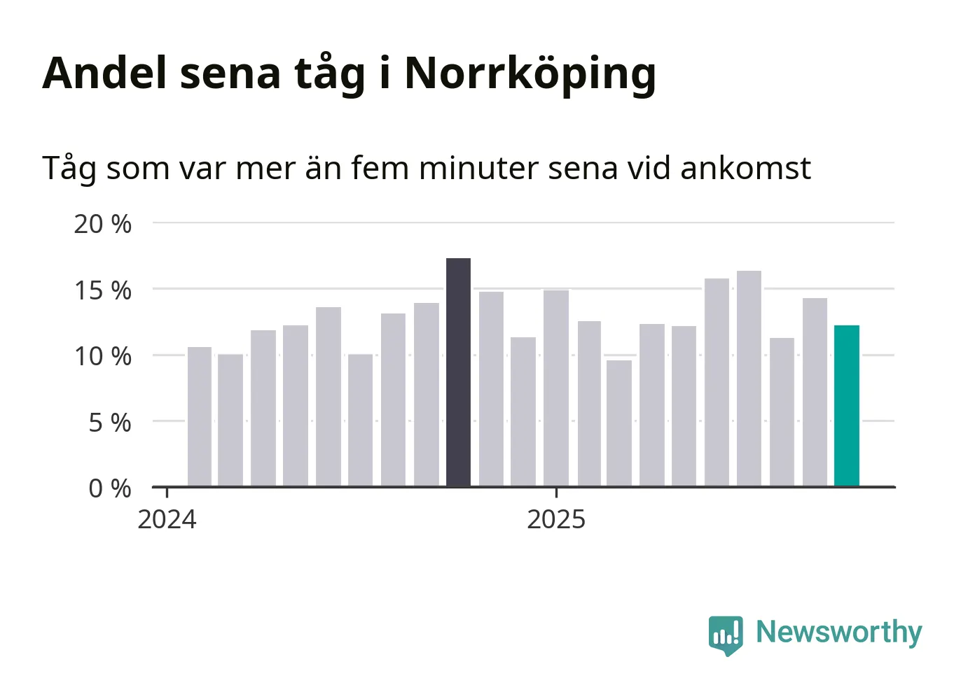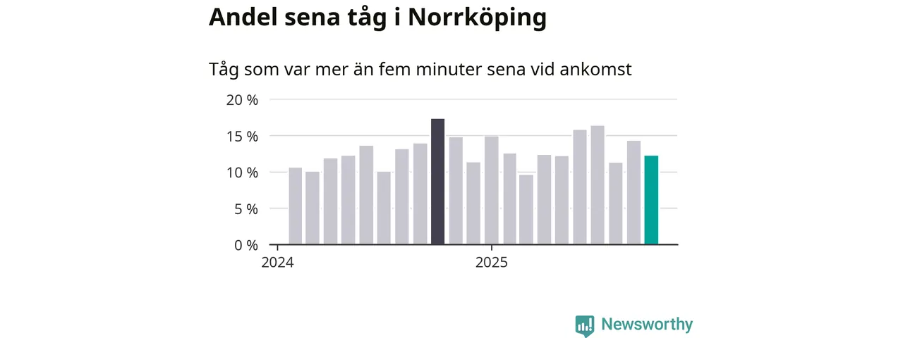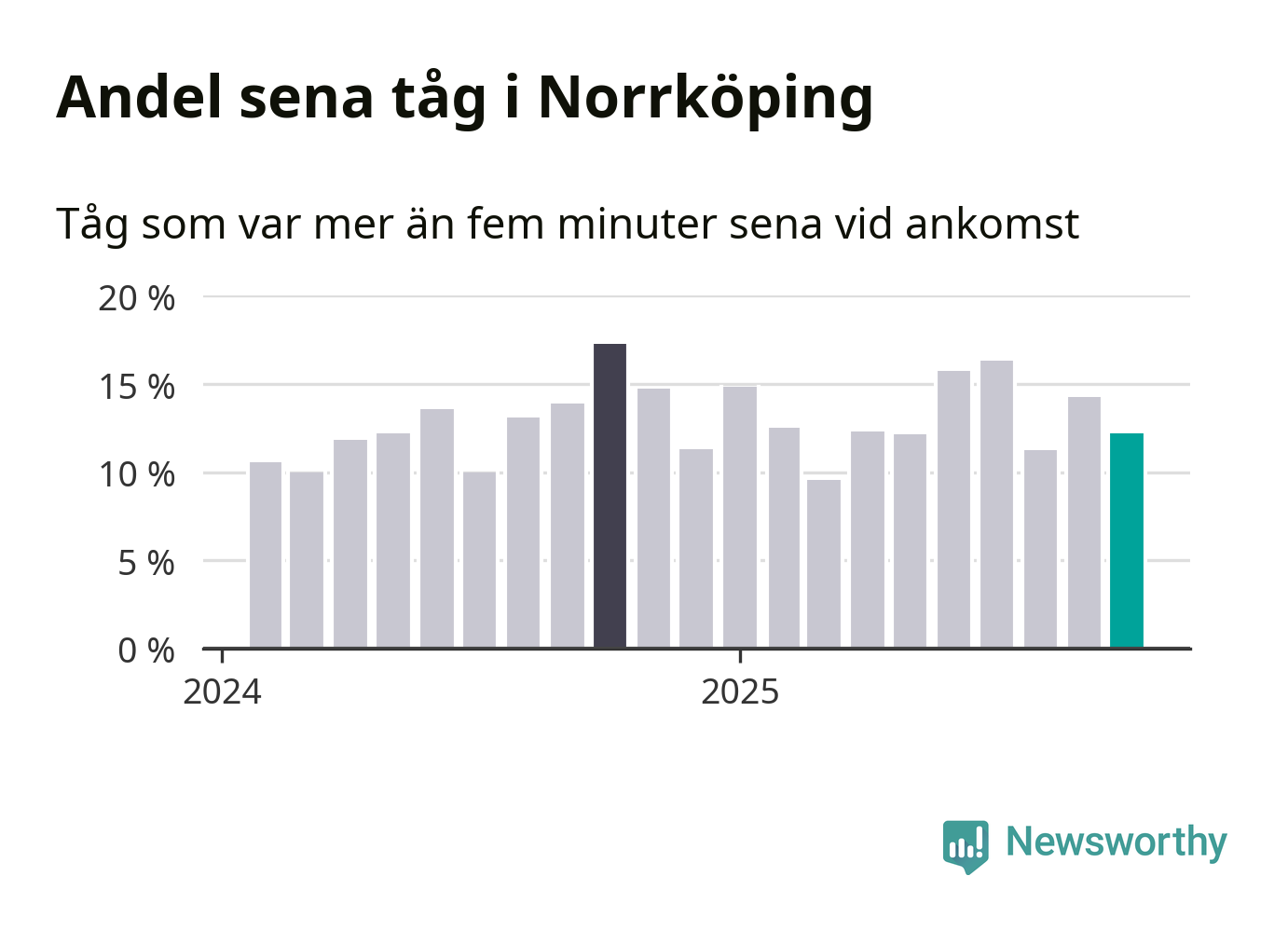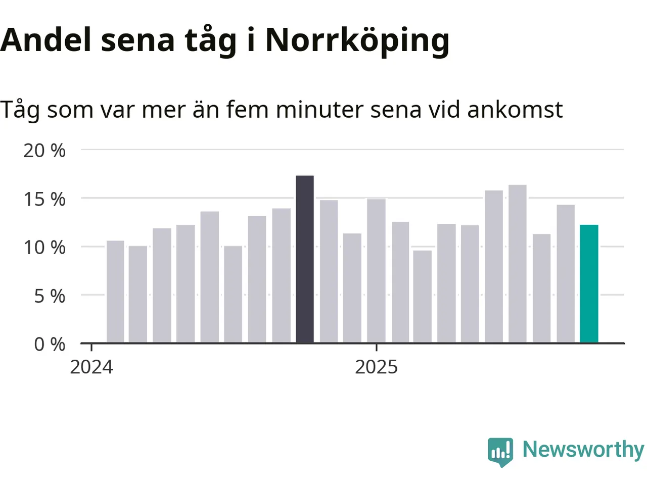 Tolv procent kan jämföras med 14 procent månaden innan, och 17 procent i oktober 2024. Siffrorna bygger på realtidsinformation om tågavgångar och ankomster från Trafikverket, som Newsworthy löpande samlar in.