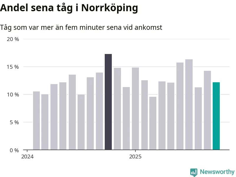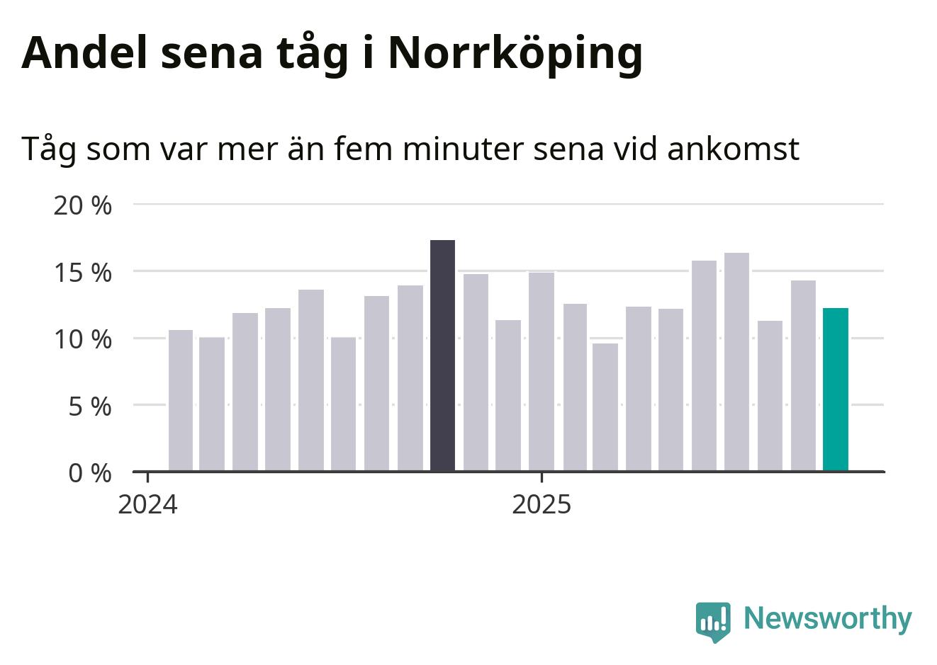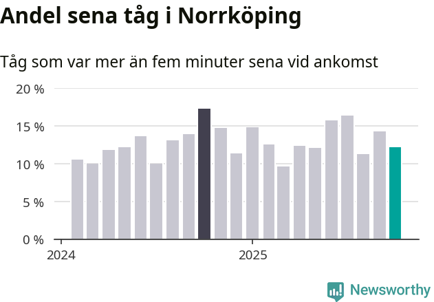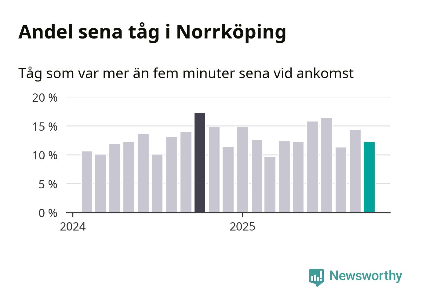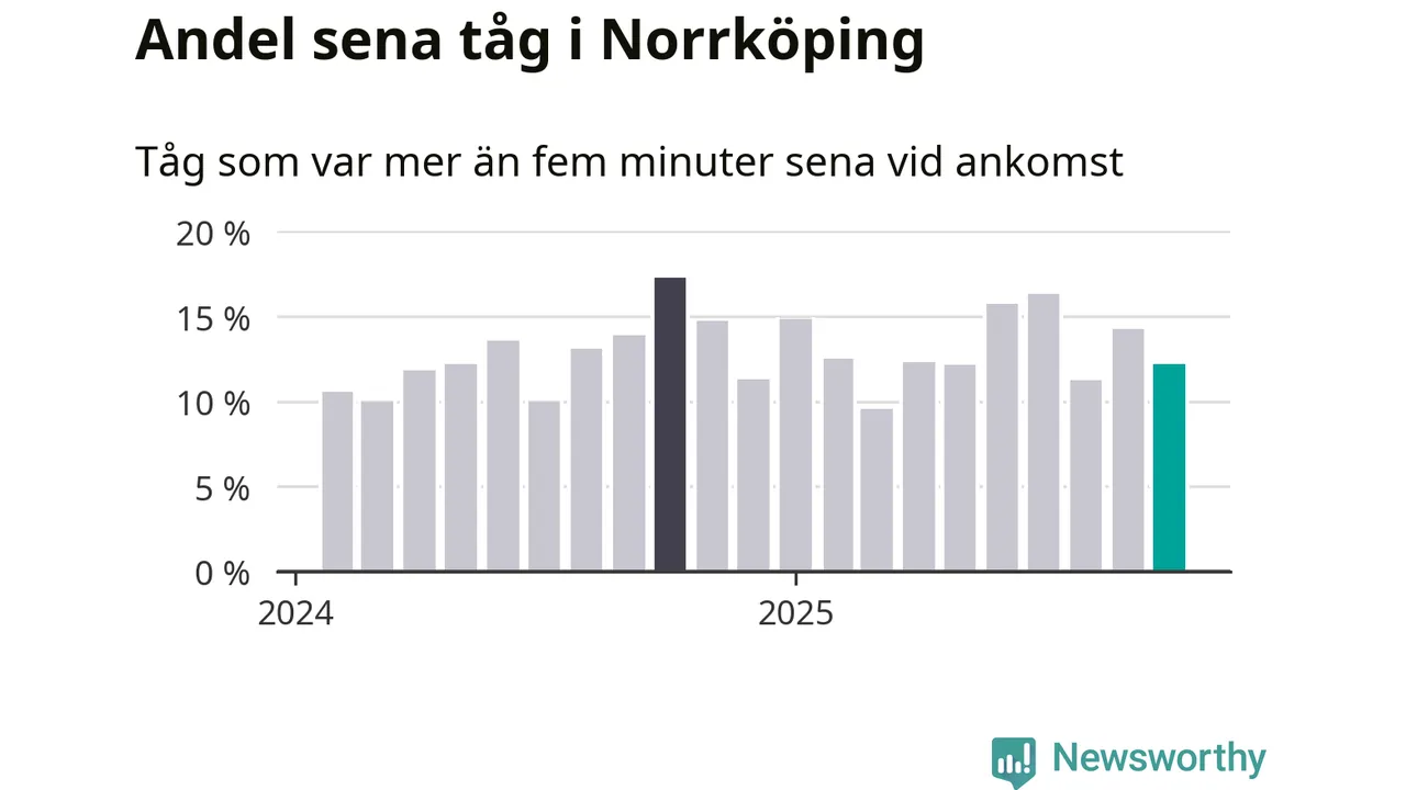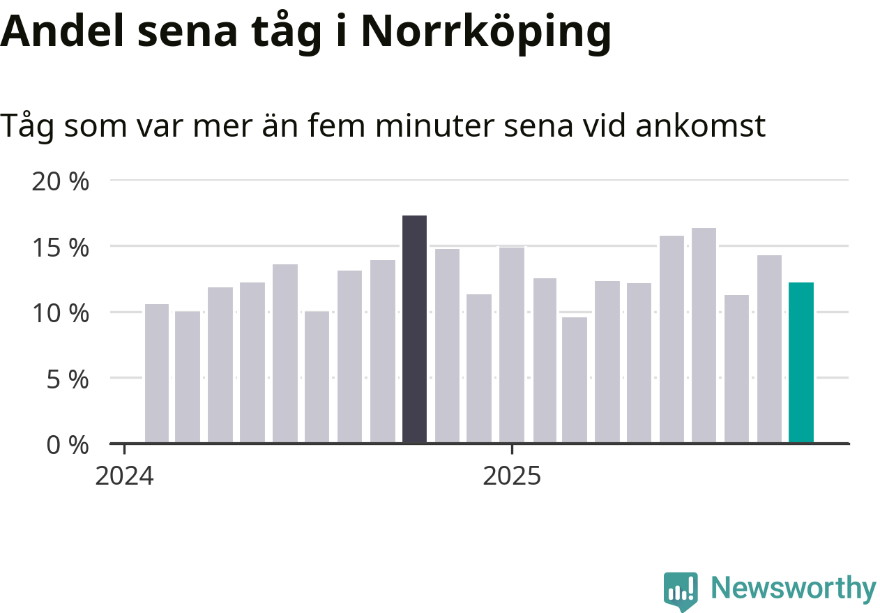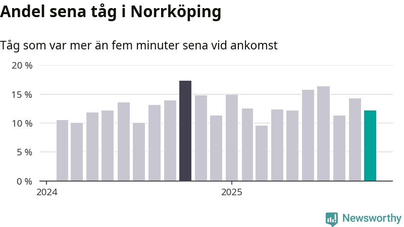 Tolv procent kan jämföras med 14 procent månaden innan, och 17 procent i oktober 2024. Siffrorna bygger på realtidsinformation om tågavgångar och ankomster från Trafikverket, som Newsworthy löpande samlar in.