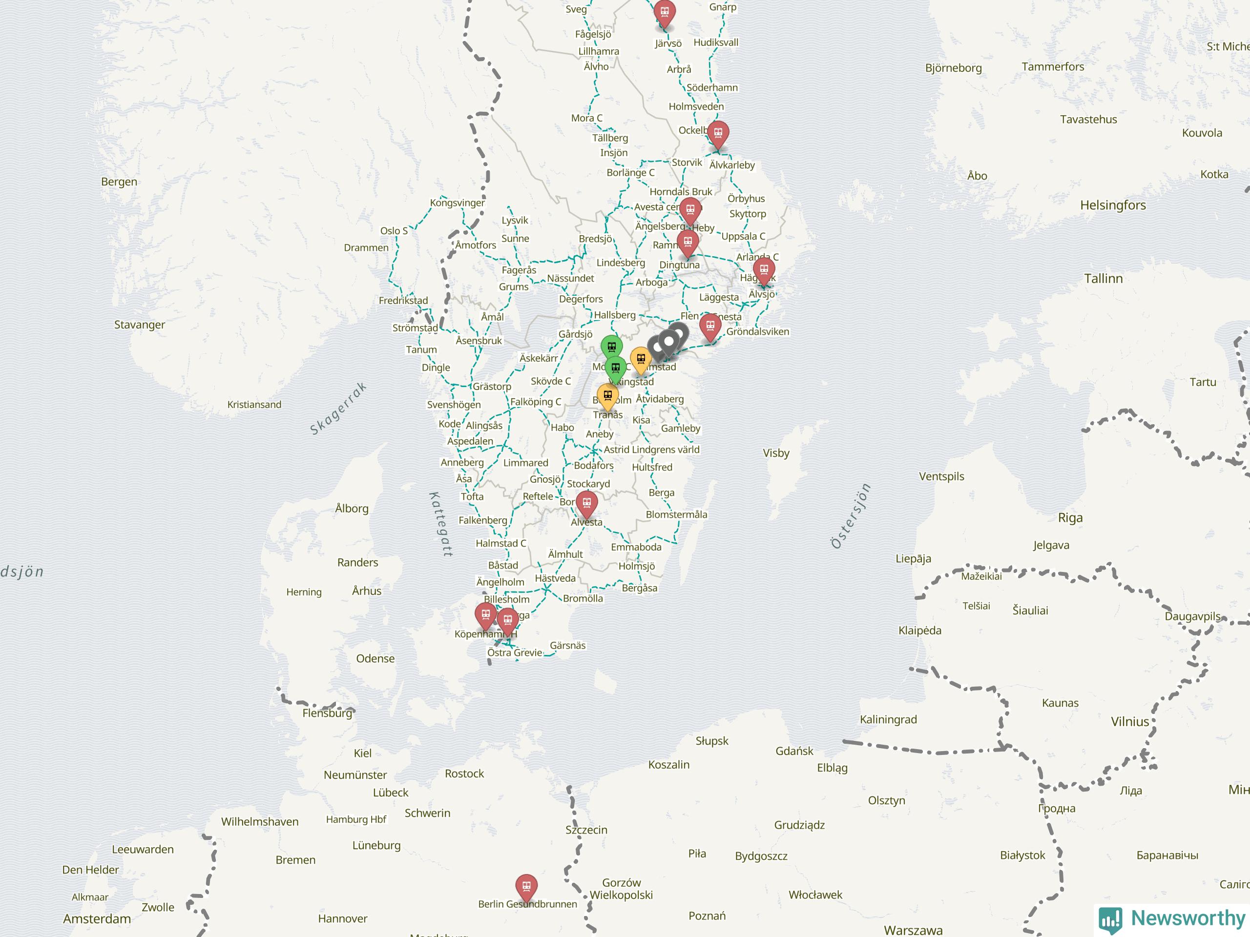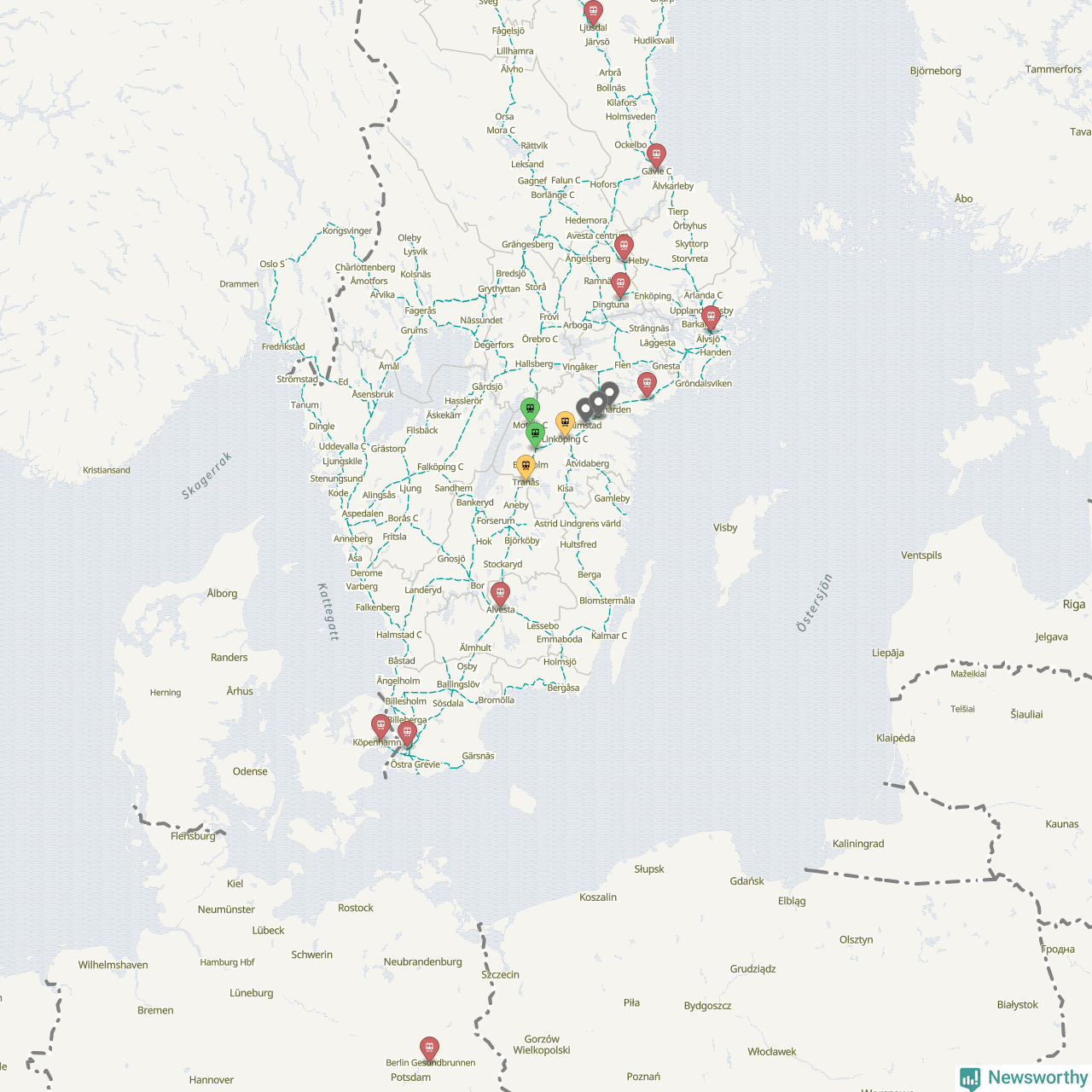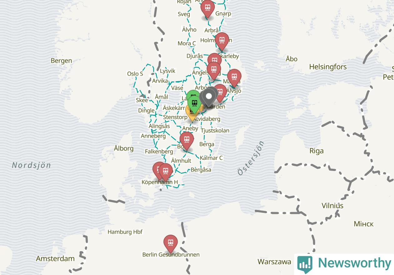 Kartdata från Mapbox, Newsworthy, OpenStreetMap och Trafikverket. Uppgifter om sträckor med passagerartrafik från jarnvag.net.