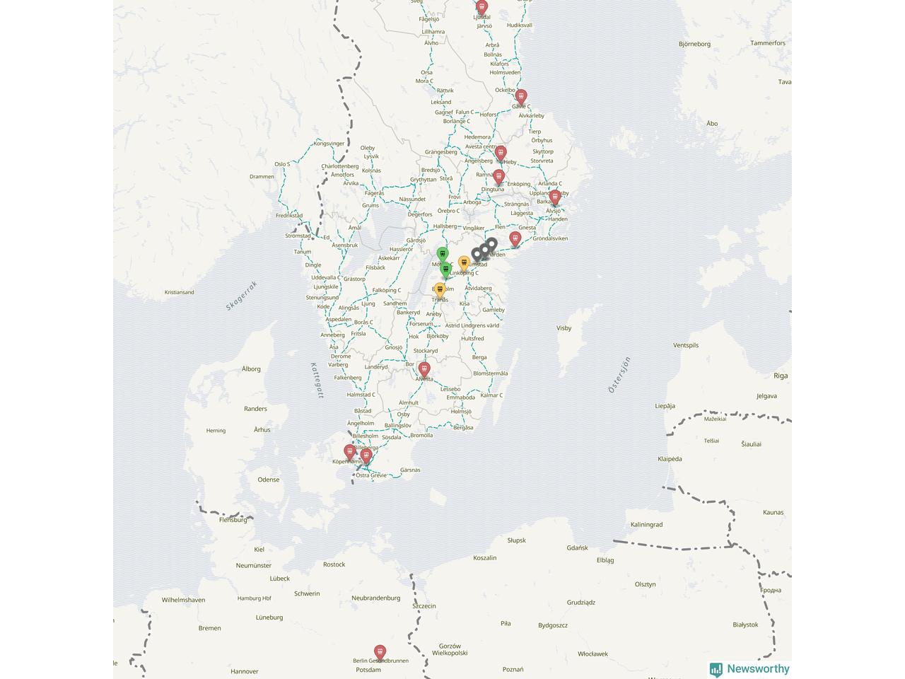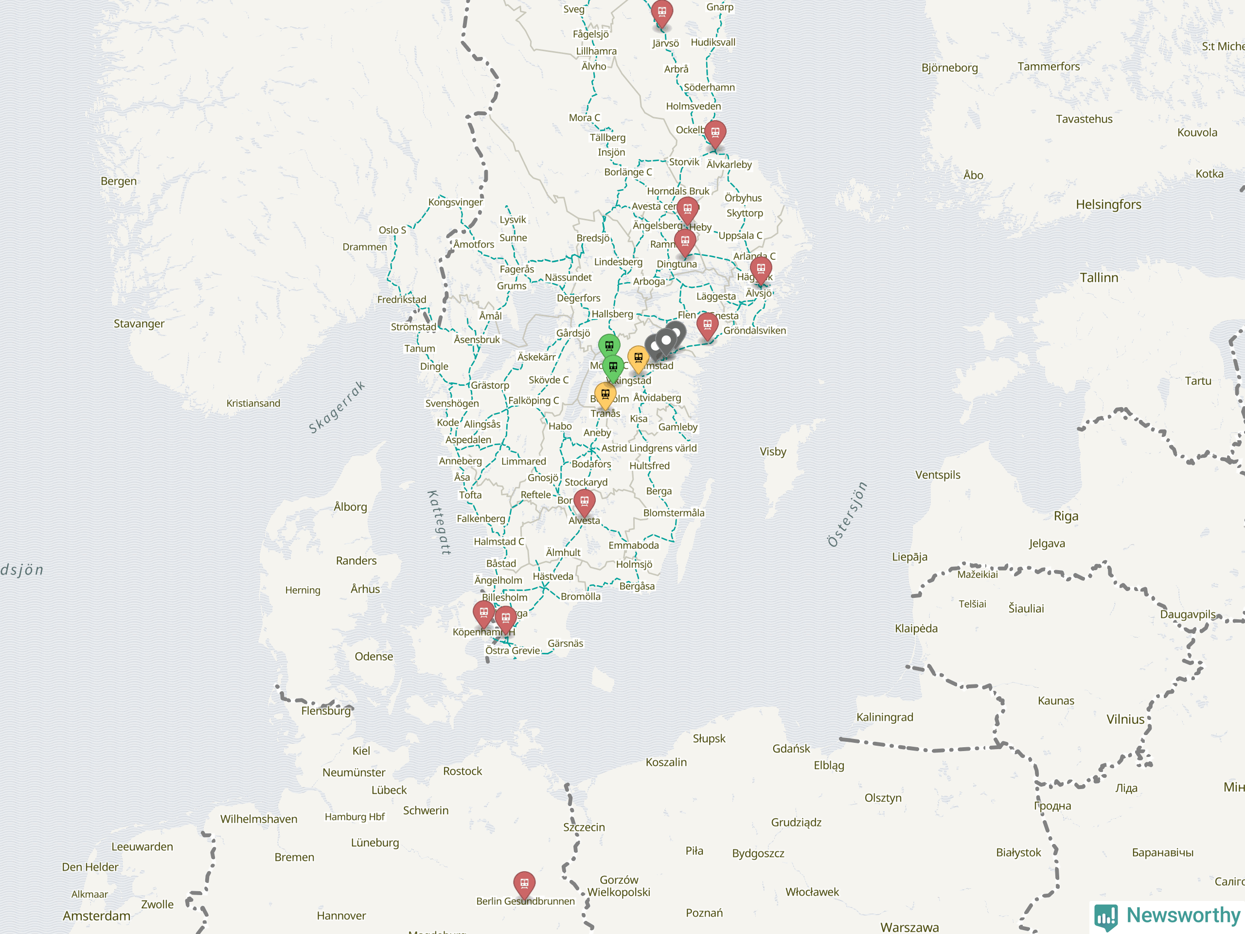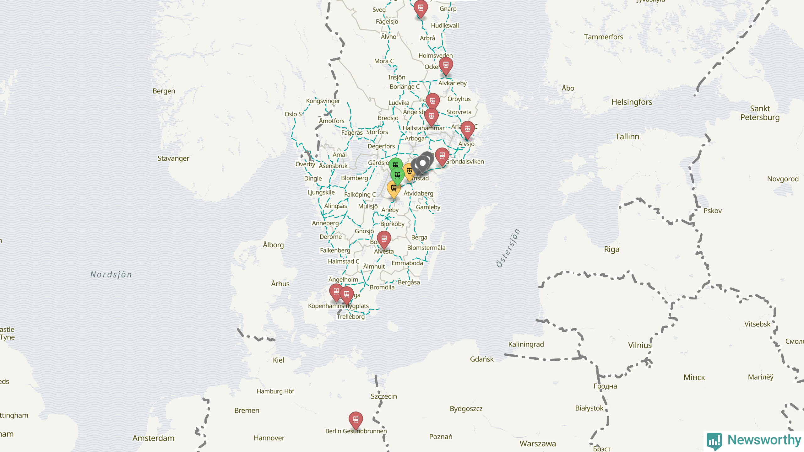 Kartdata från Mapbox, Newsworthy, OpenStreetMap och Trafikverket. Uppgifter om sträckor med passagerartrafik från jarnvag.net.