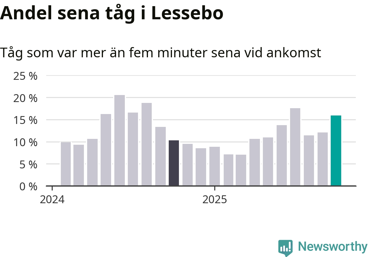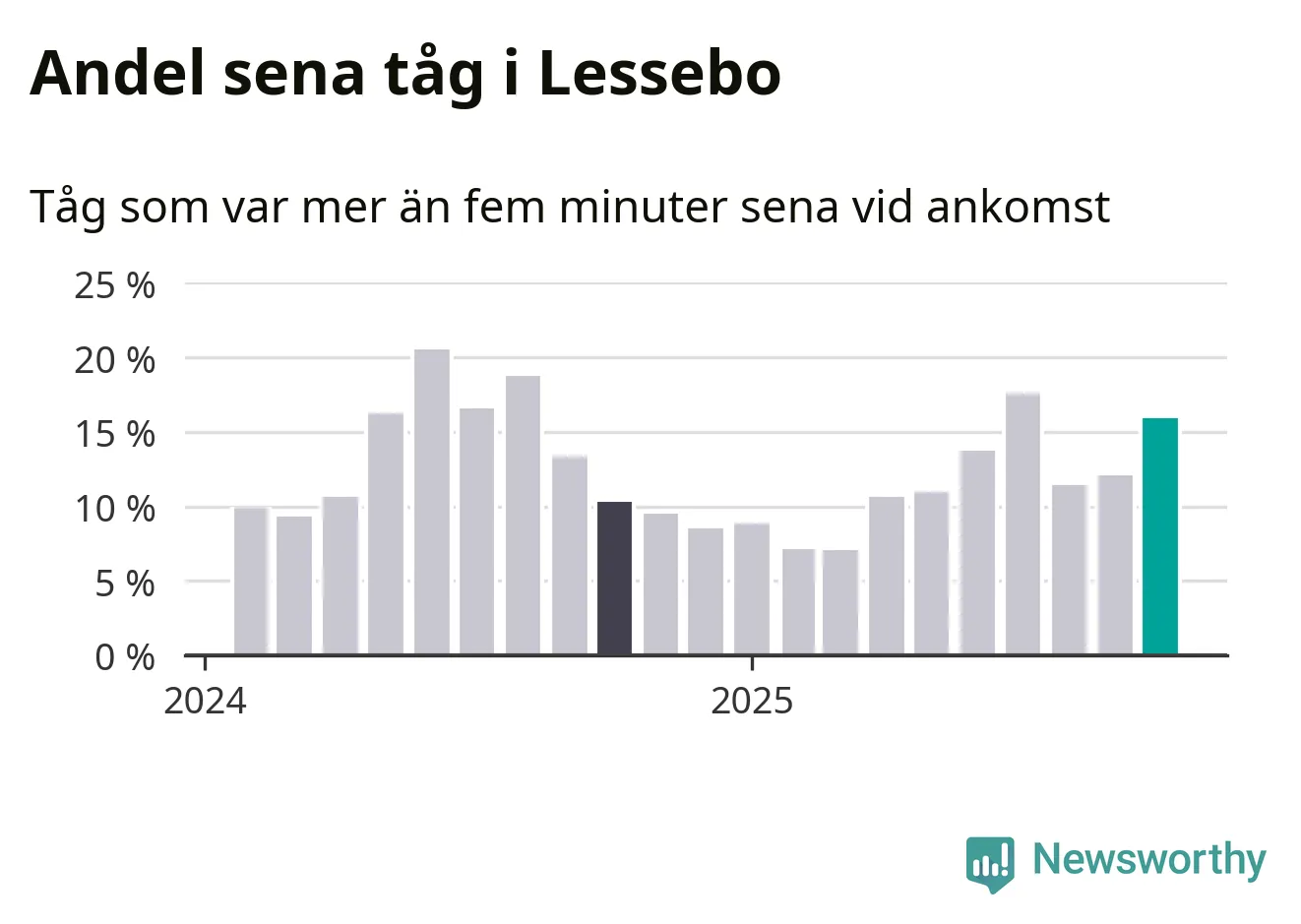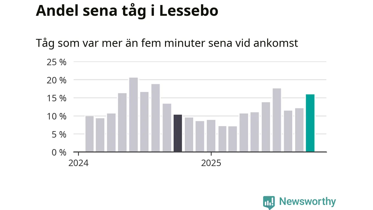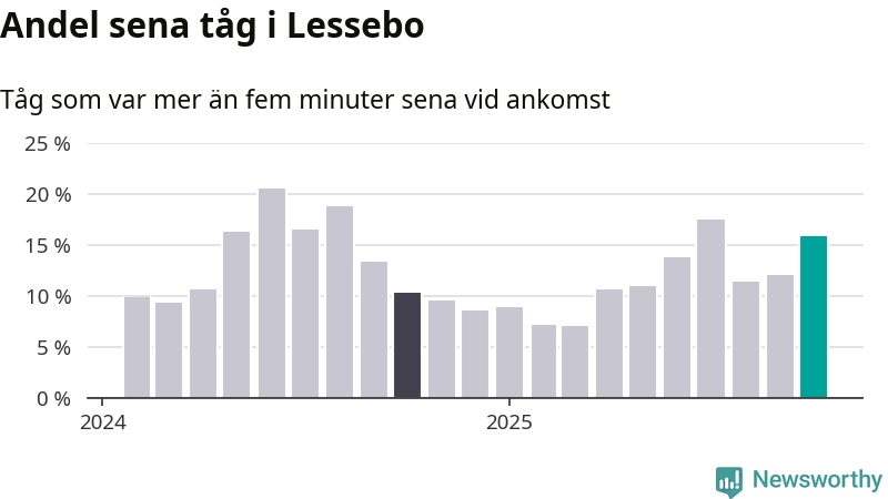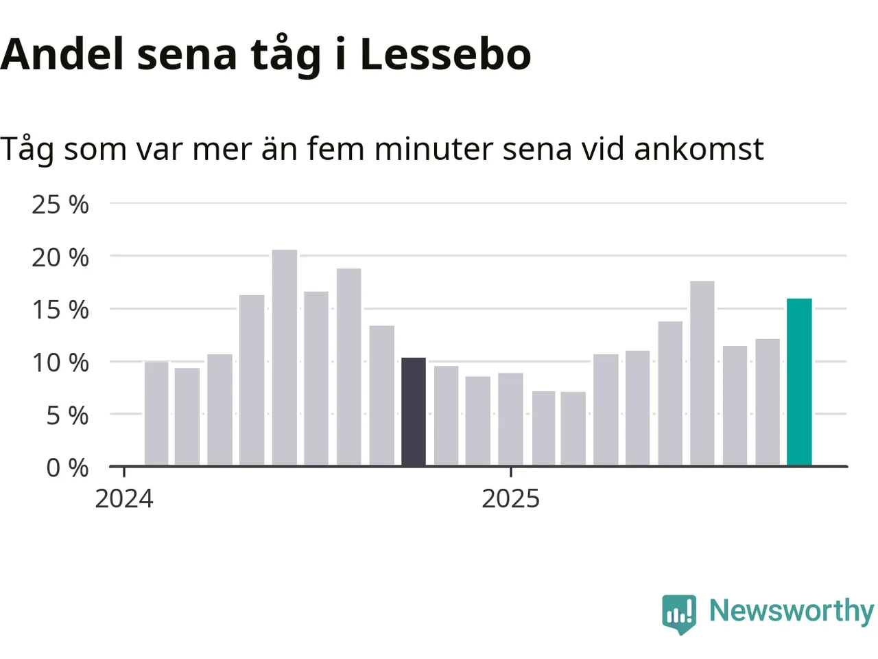 16 procent kan jämföras med tolv procent månaden innan, och tio procent i oktober 2024. Siffrorna bygger på realtidsinformation om tågavgångar och ankomster från Trafikverket, som Newsworthy löpande samlar in.