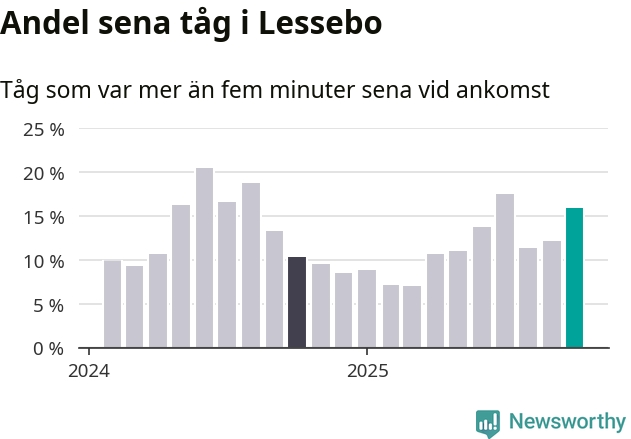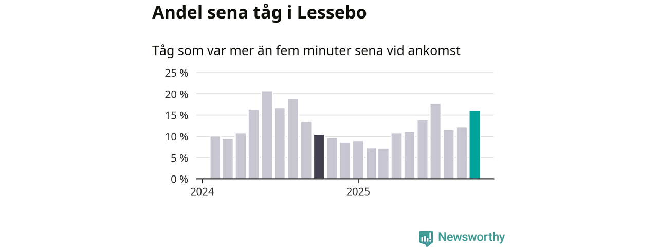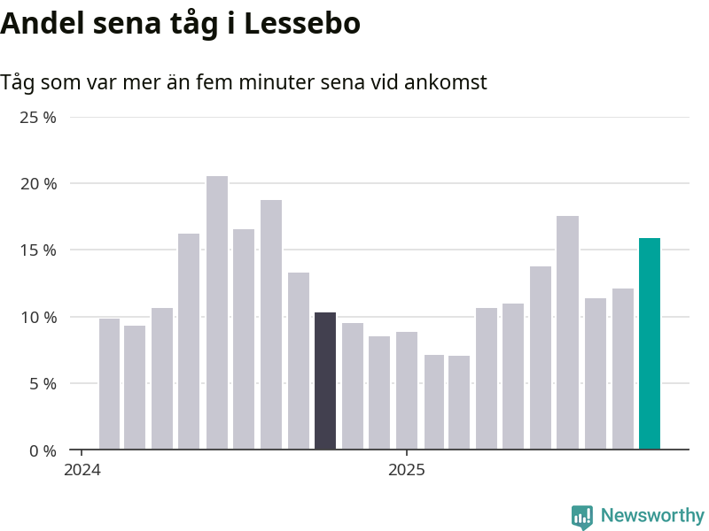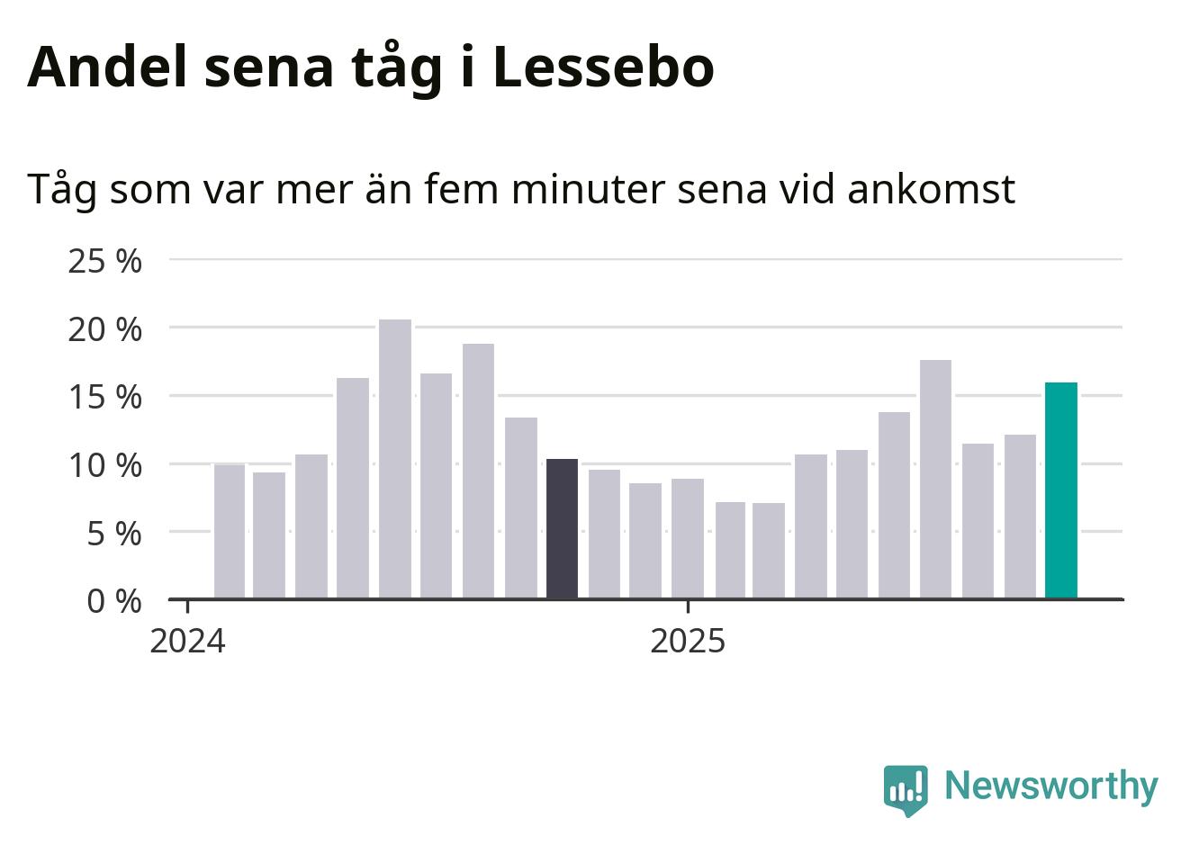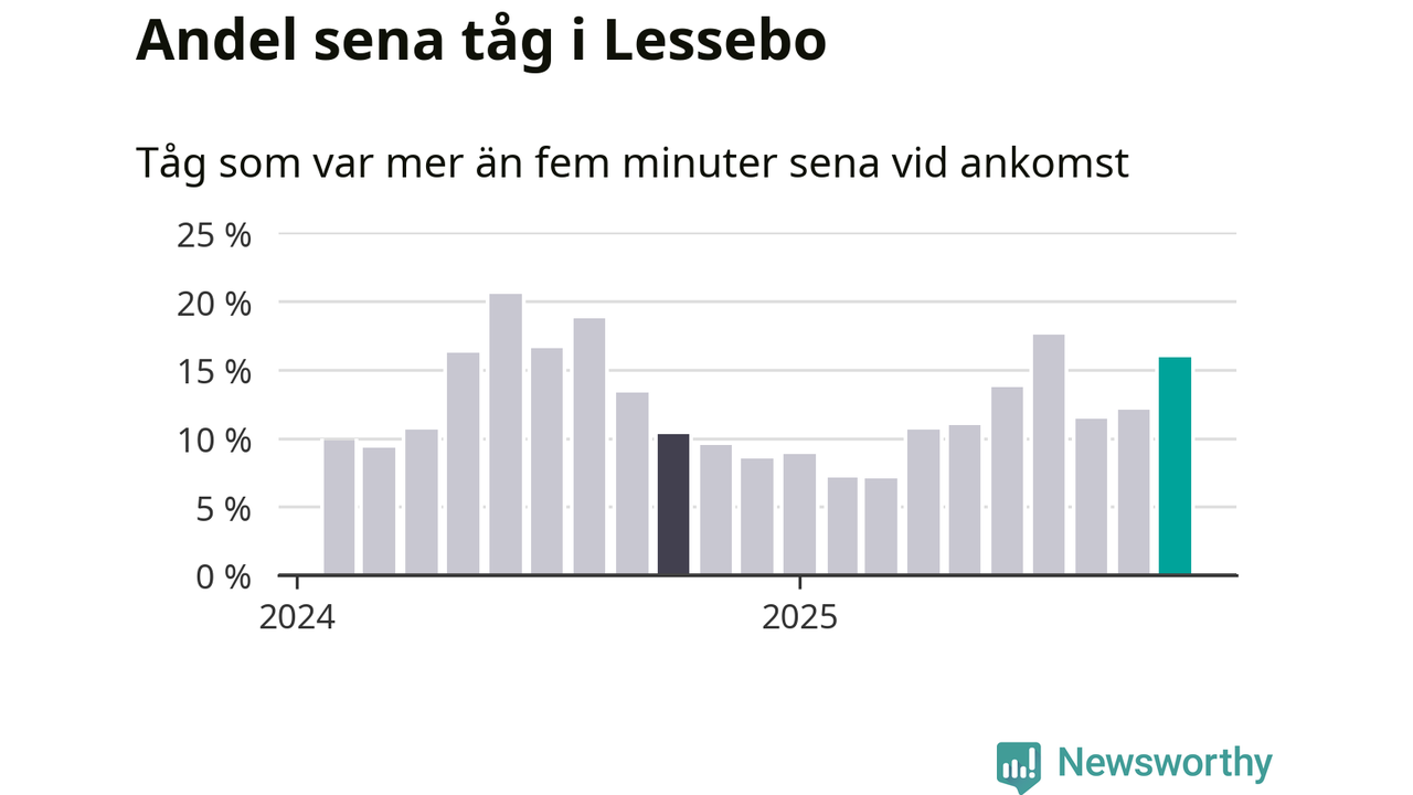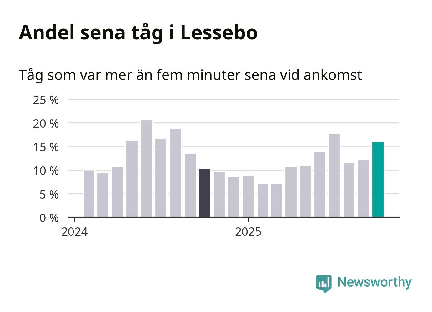 16 procent kan jämföras med tolv procent månaden innan, och tio procent i oktober 2024. Siffrorna bygger på realtidsinformation om tågavgångar och ankomster från Trafikverket, som Newsworthy löpande samlar in.