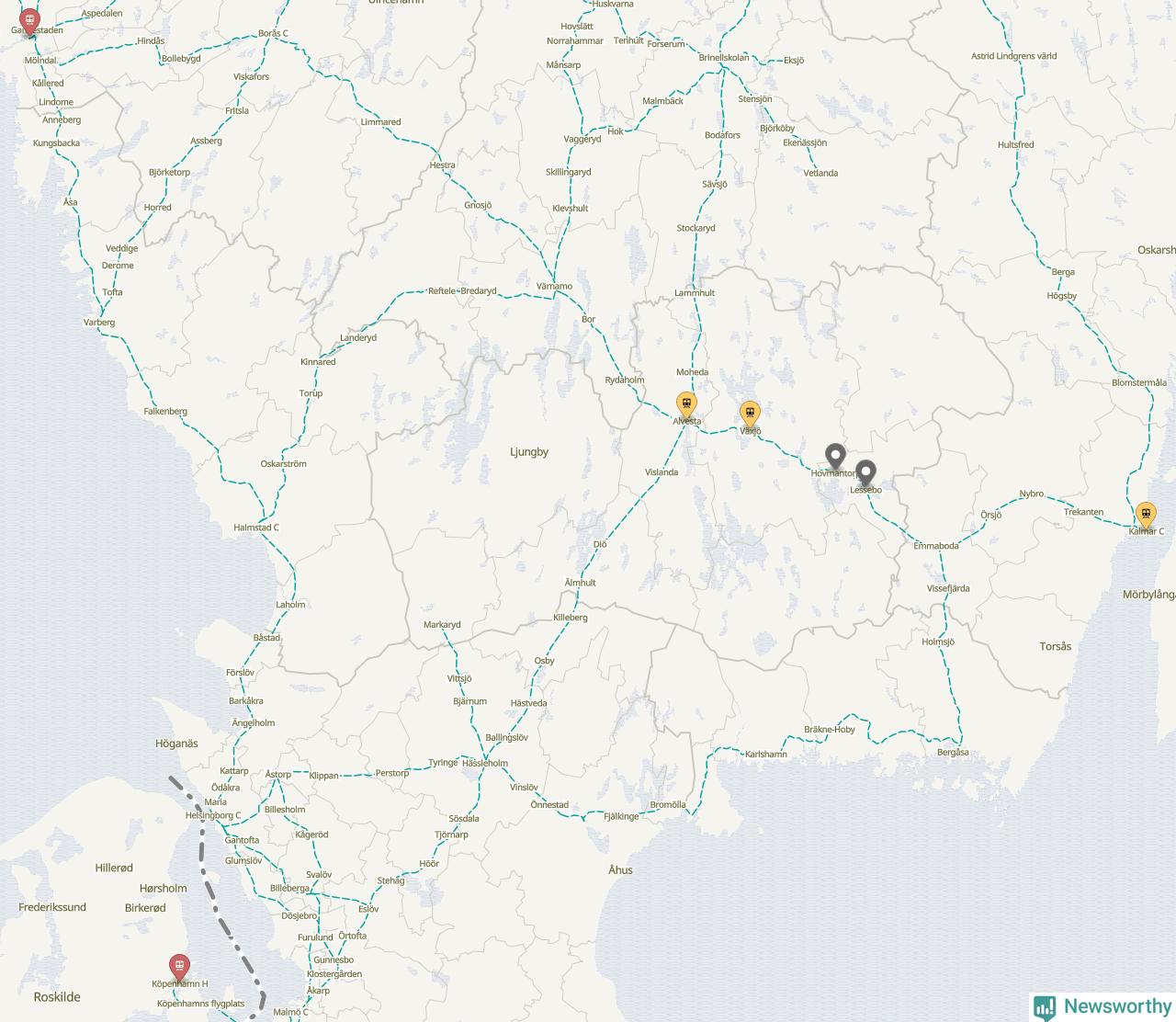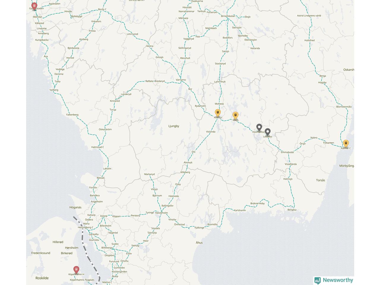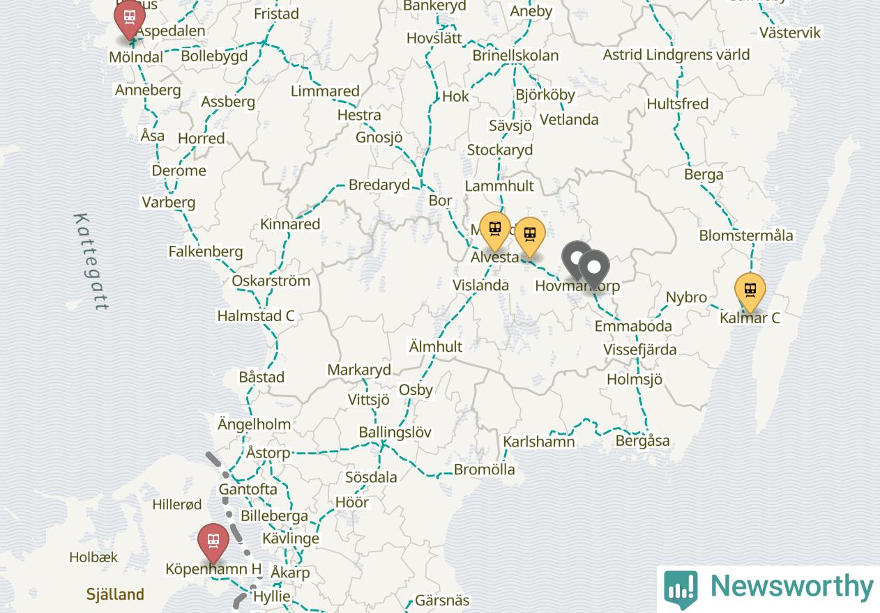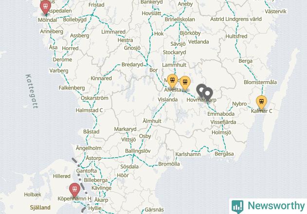 Kartdata från Mapbox, Newsworthy, OpenStreetMap och Trafikverket. Uppgifter om sträckor med passagerartrafik från jarnvag.net.