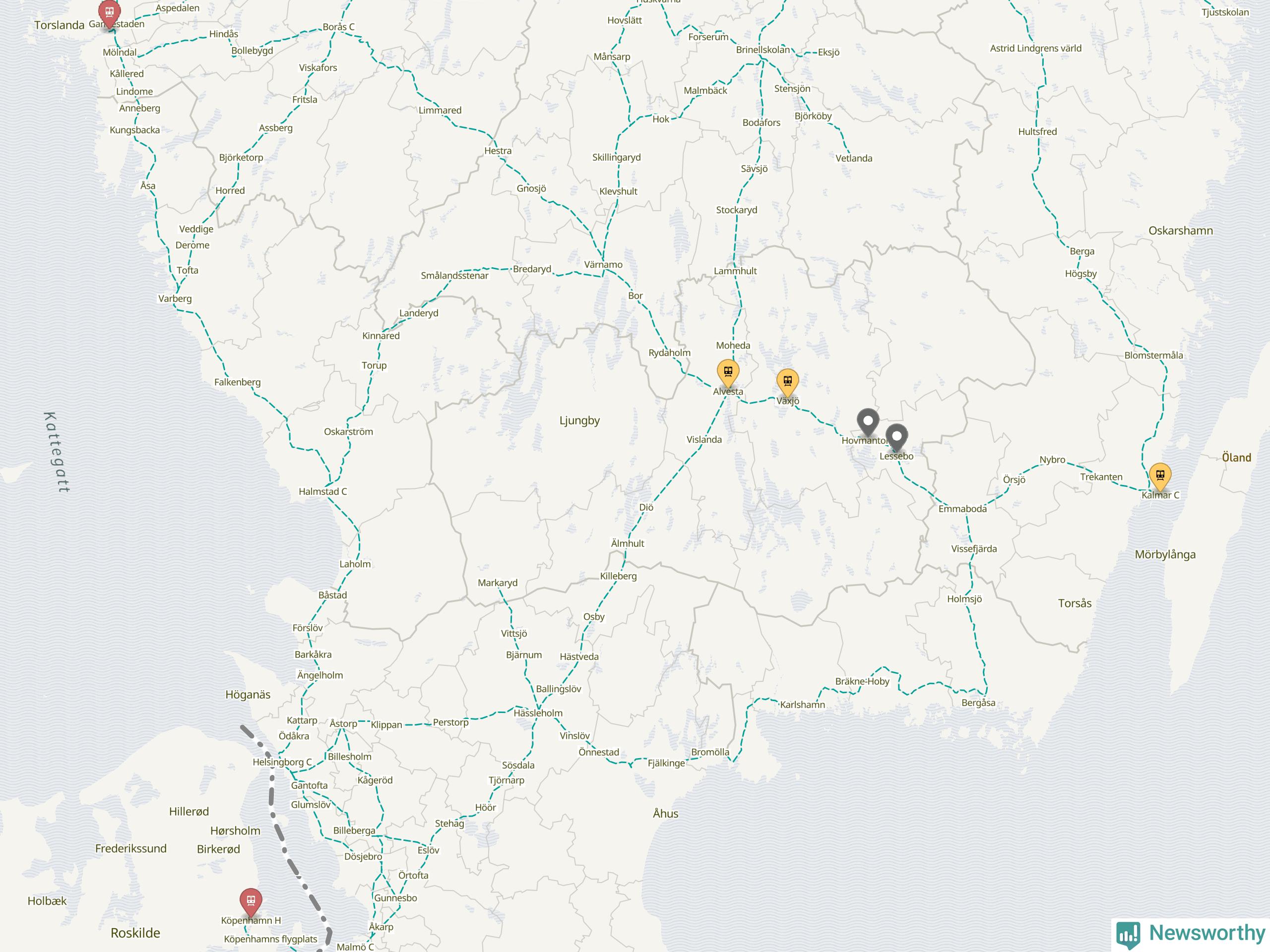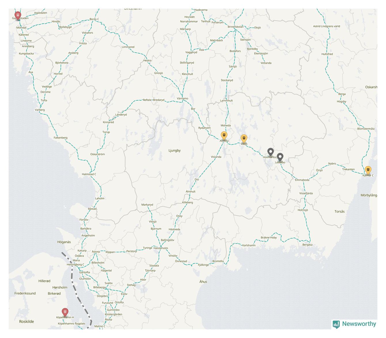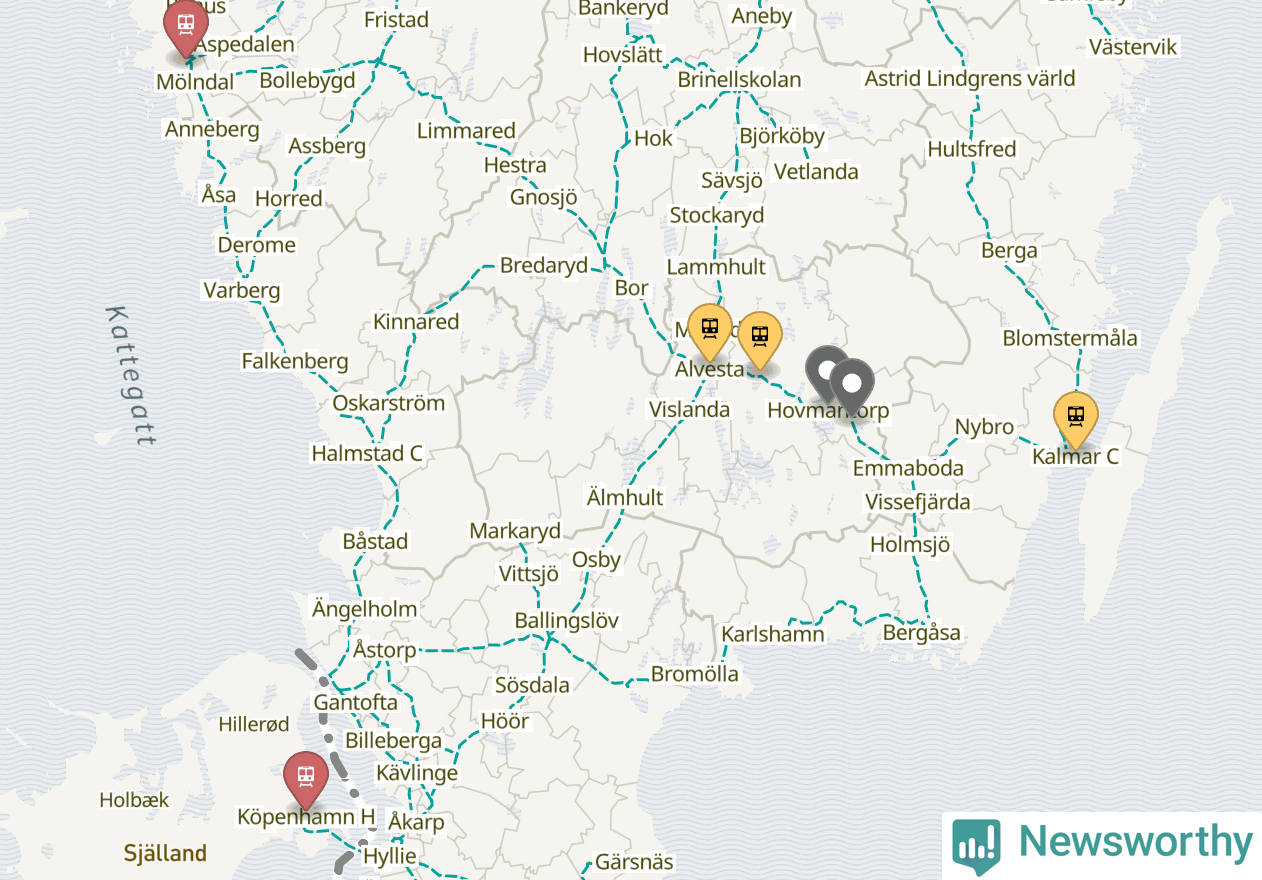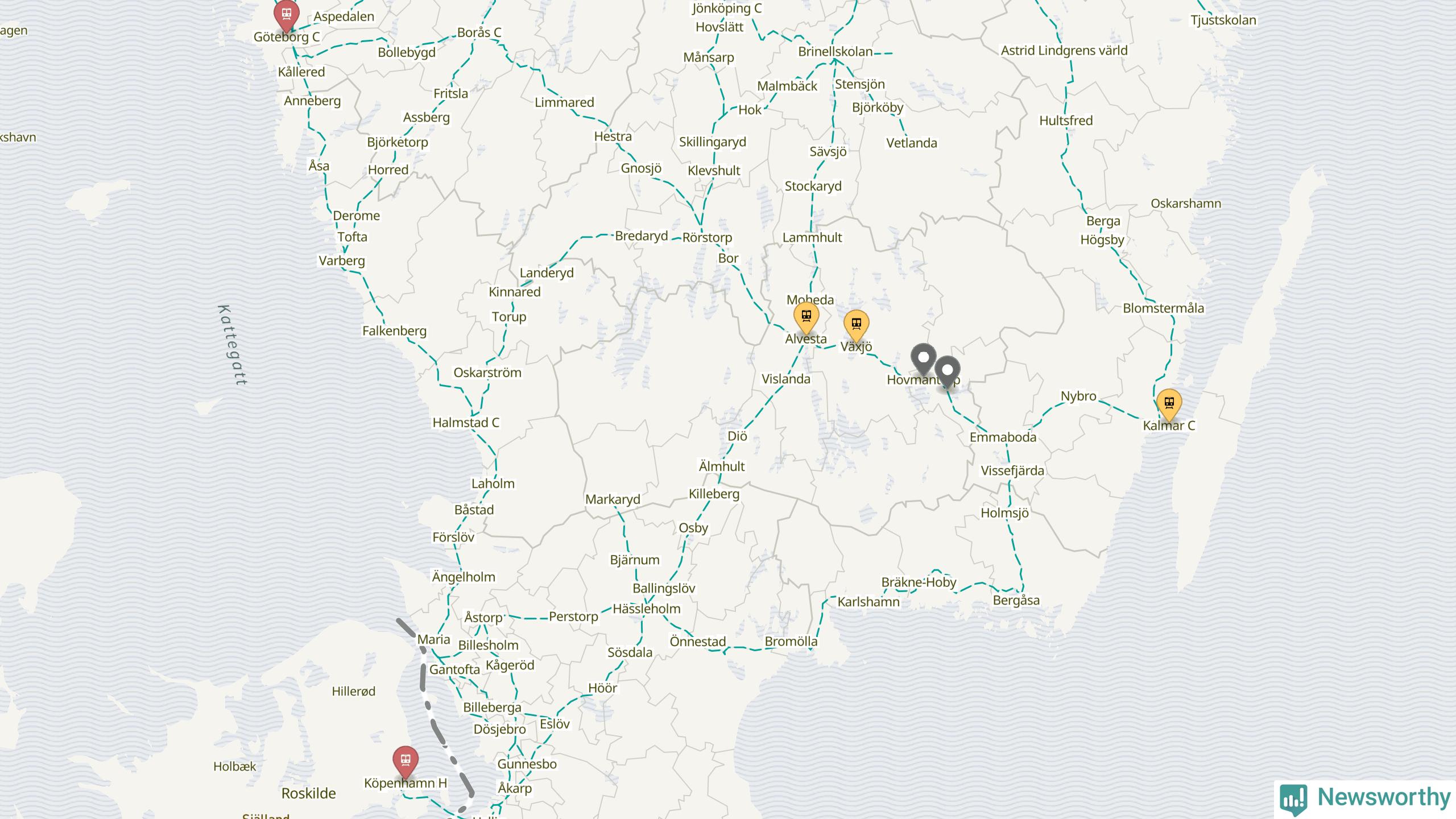 Kartdata från Mapbox, Newsworthy, OpenStreetMap och Trafikverket. Uppgifter om sträckor med passagerartrafik från jarnvag.net.