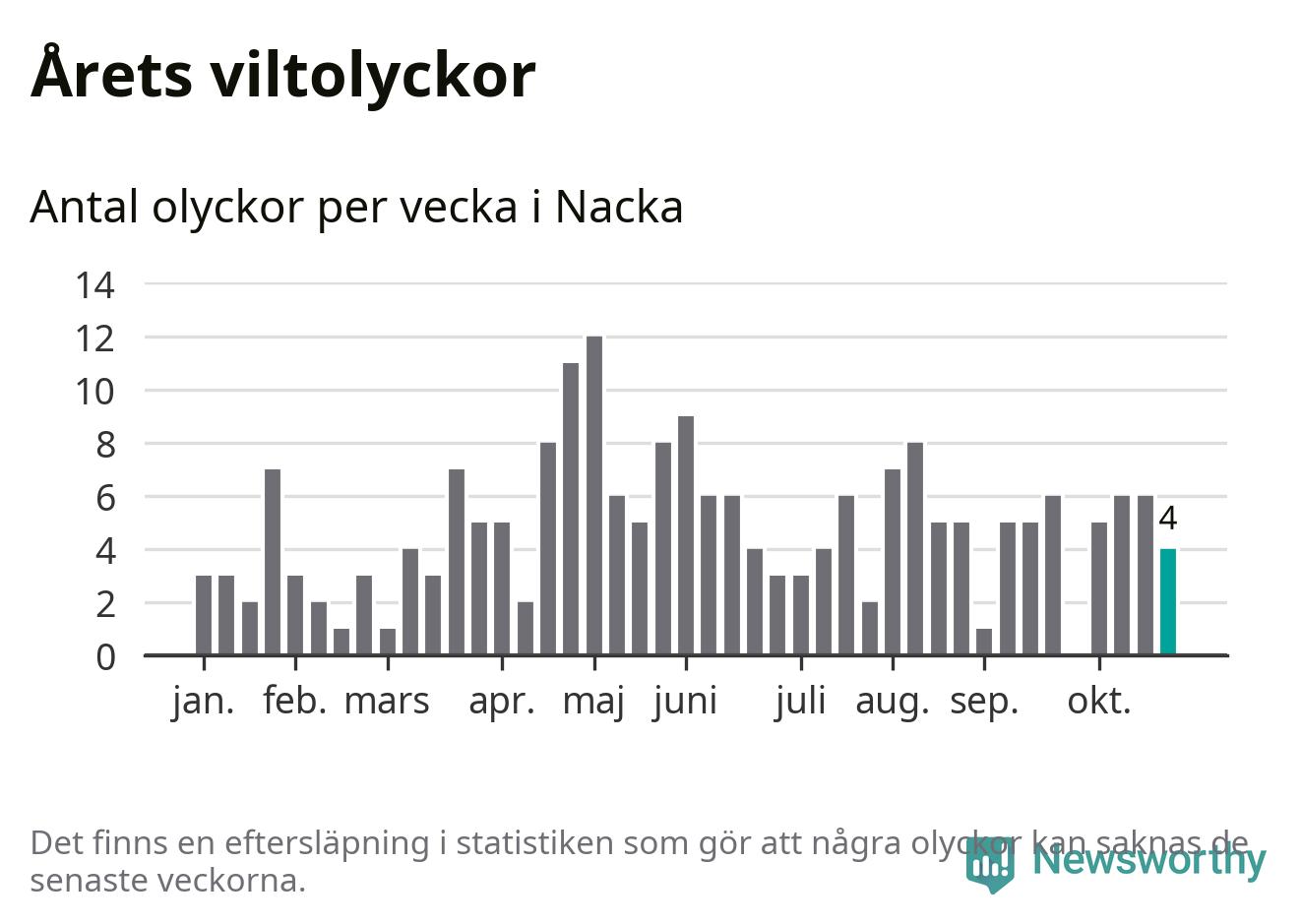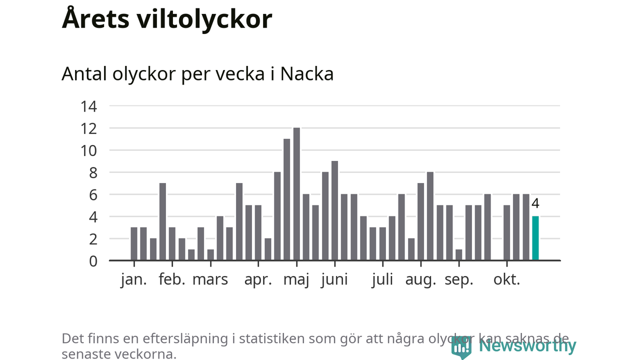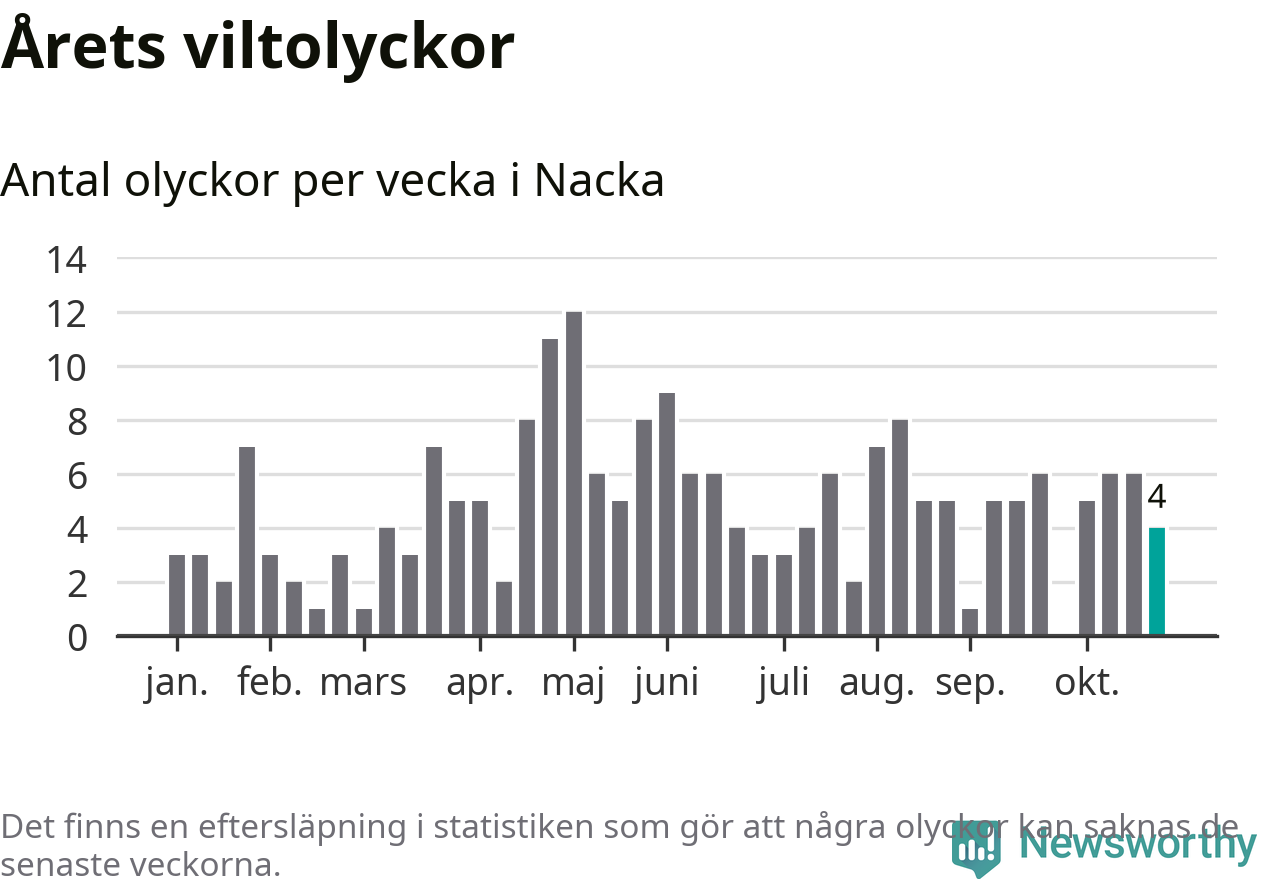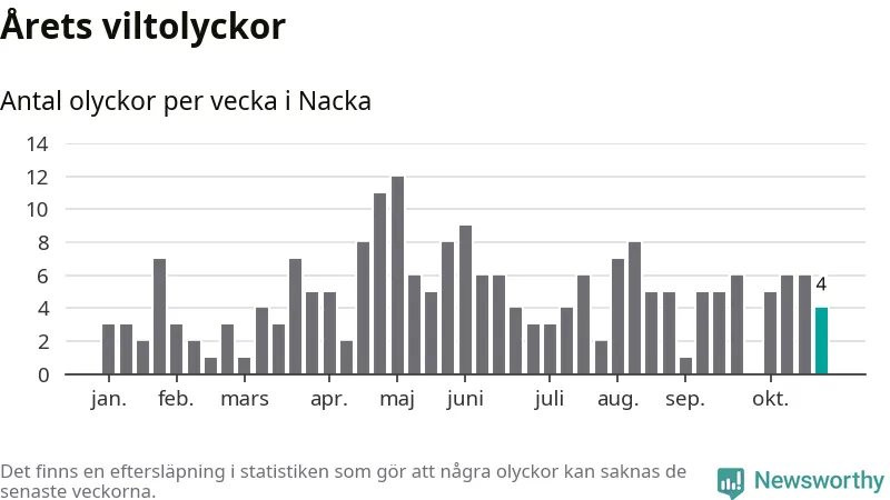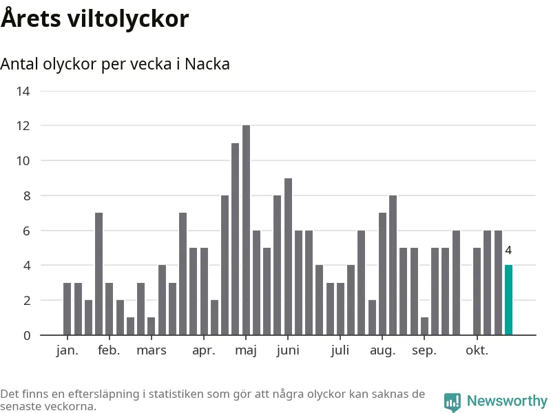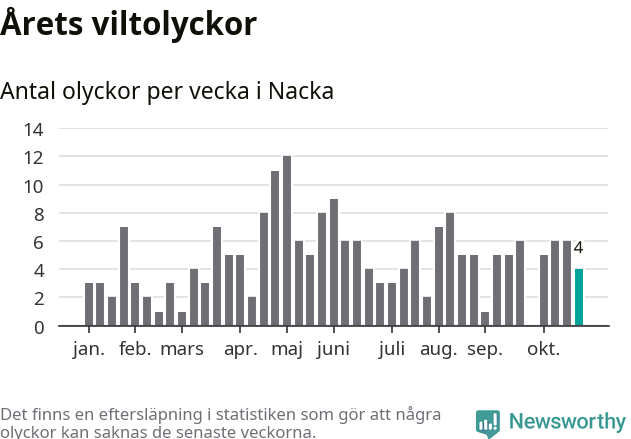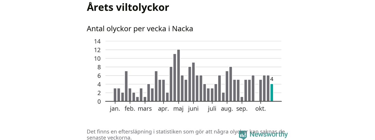 Hittills har fyra viltolyckor rapporterats in i Nacka kommun från vecka 44. Se listan här.