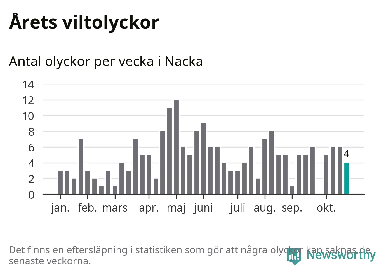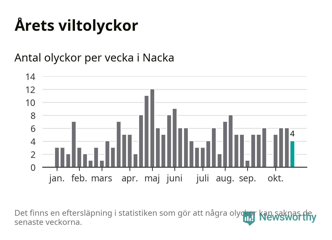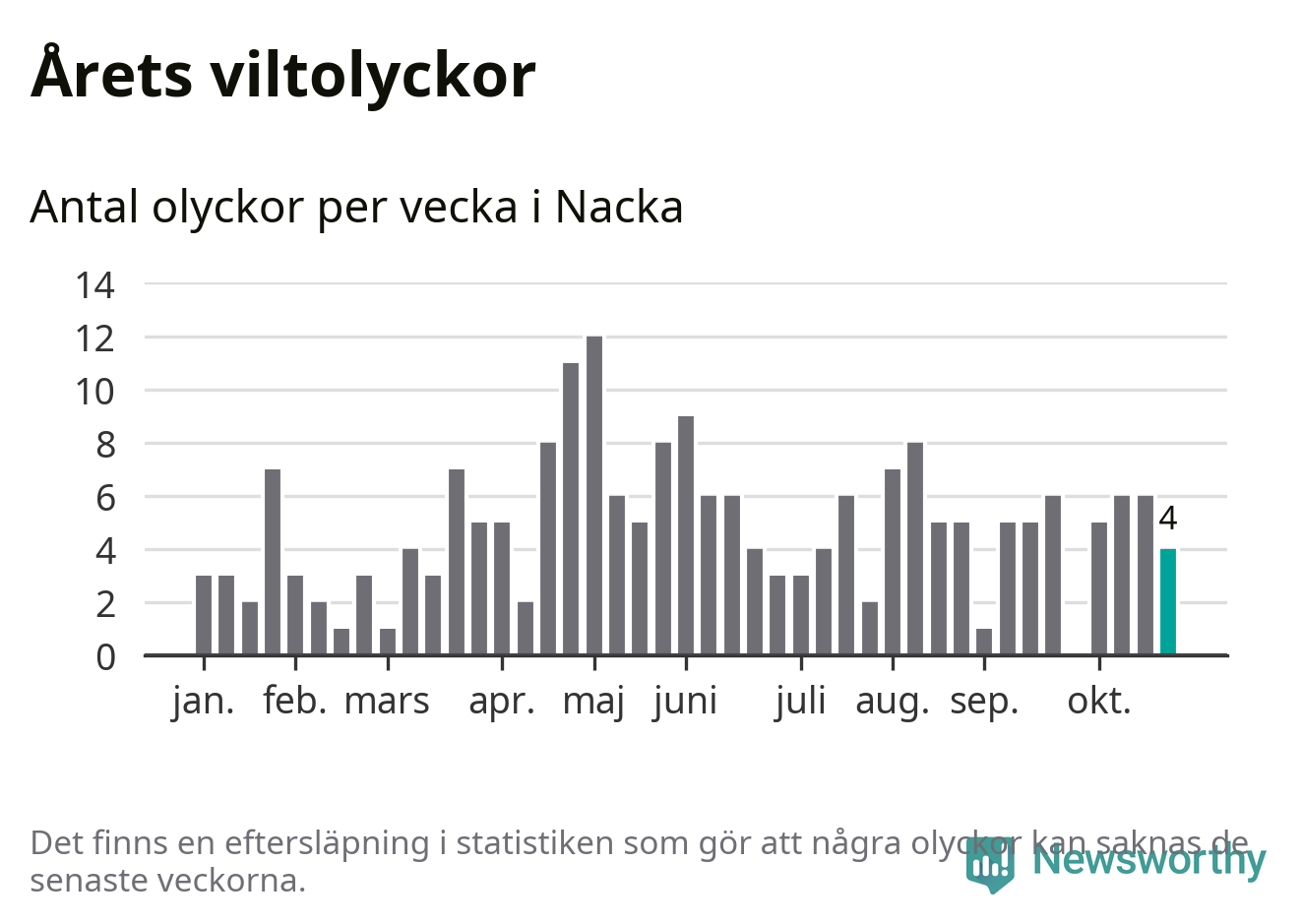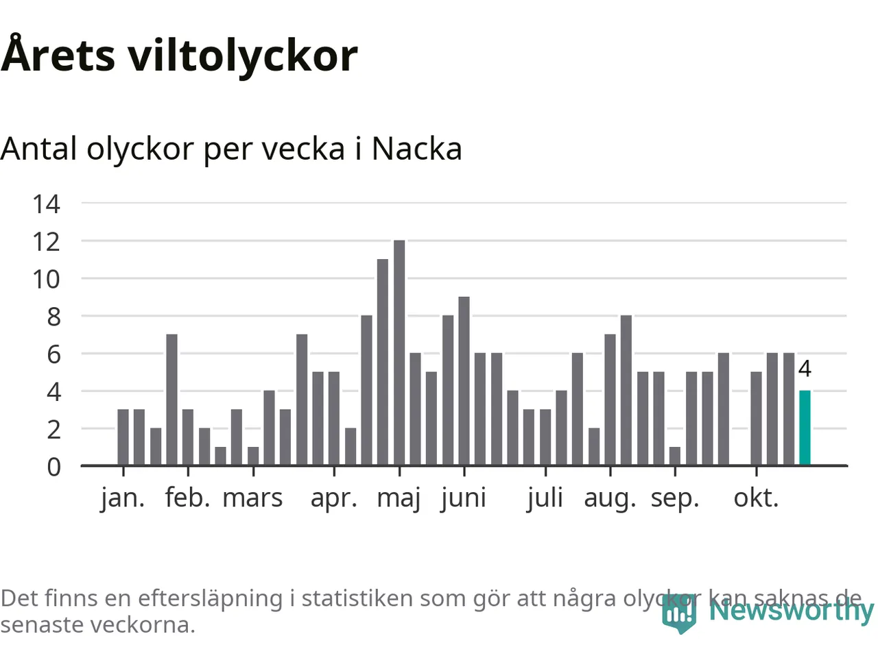 Totalt det här året har det inträffat 210 viltolyckor i kommunen. Det är mer än genomsnittet för motsvarande period (omkring 168) de senaste tio åren.