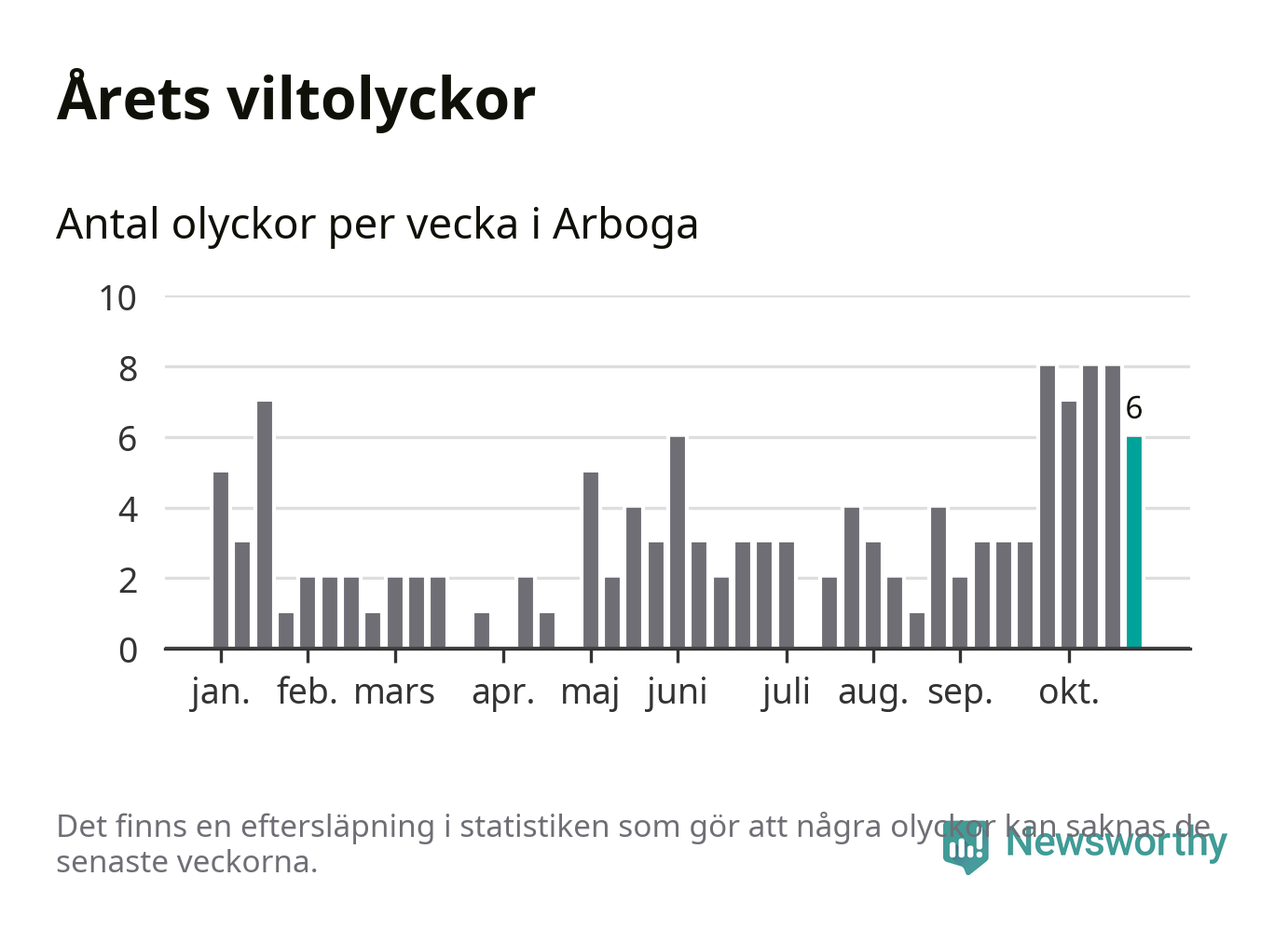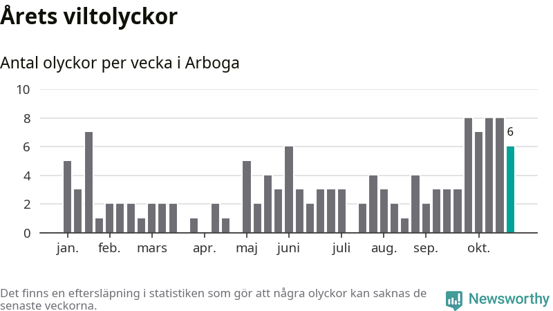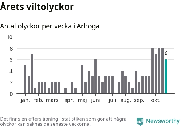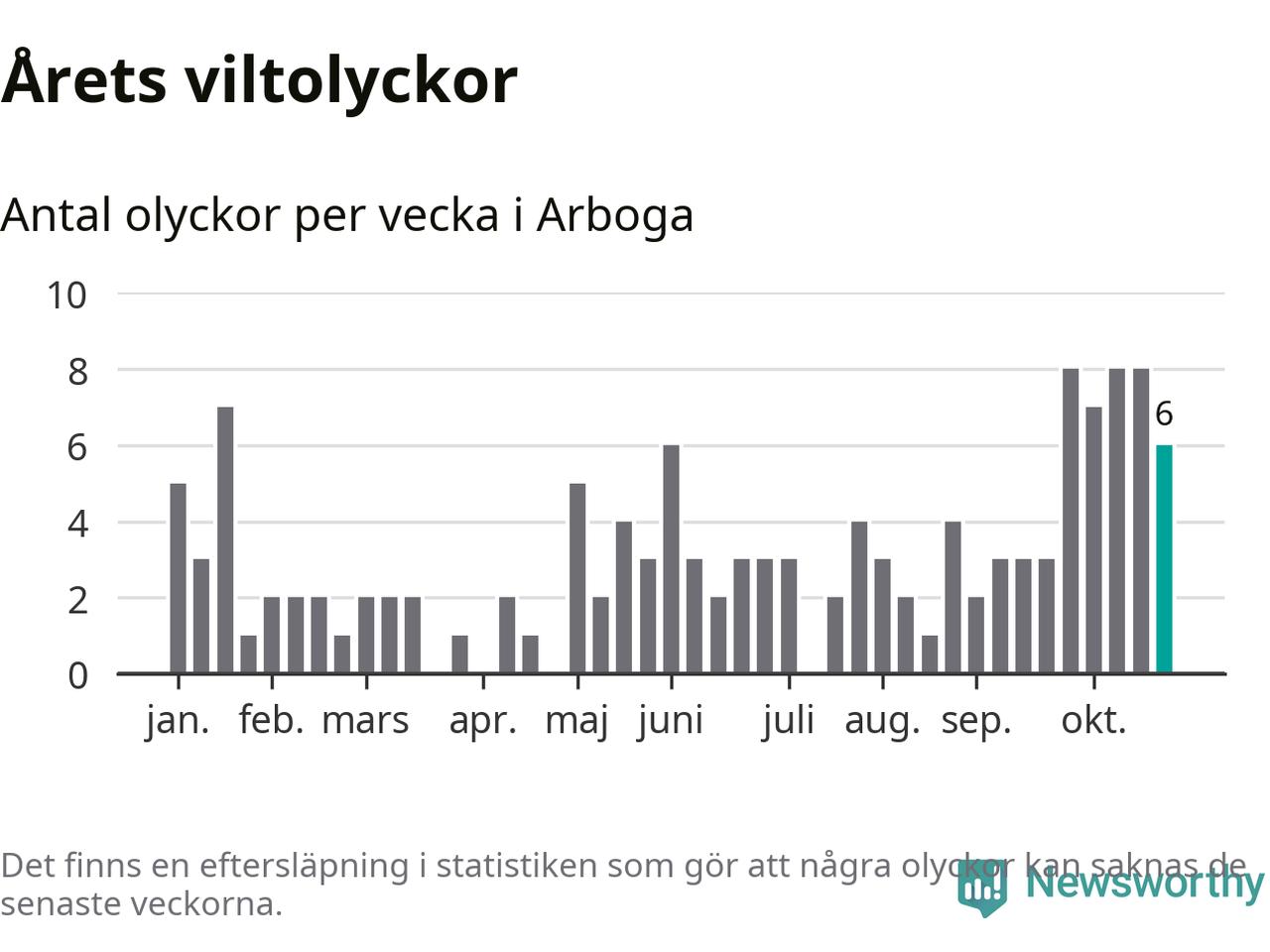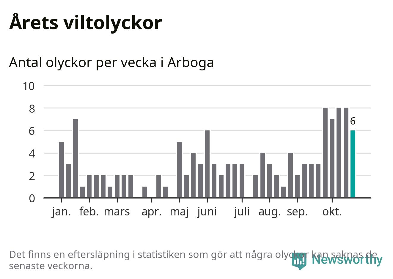 Hittills har sex viltolyckor rapporterats in i Arboga kommun från vecka 44. Se listan här.