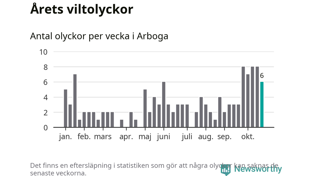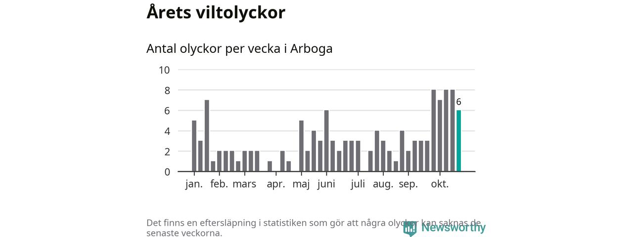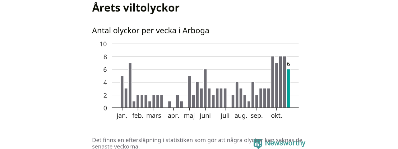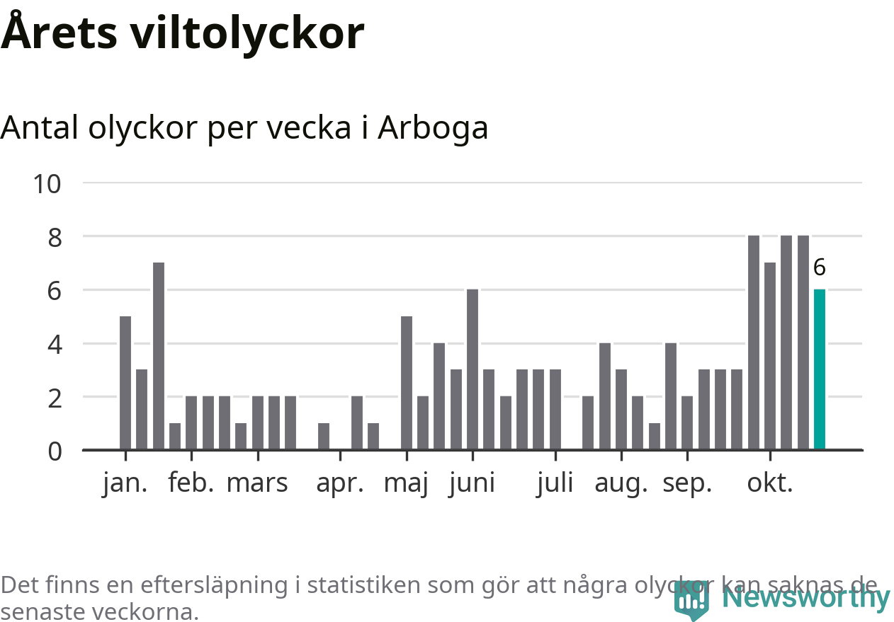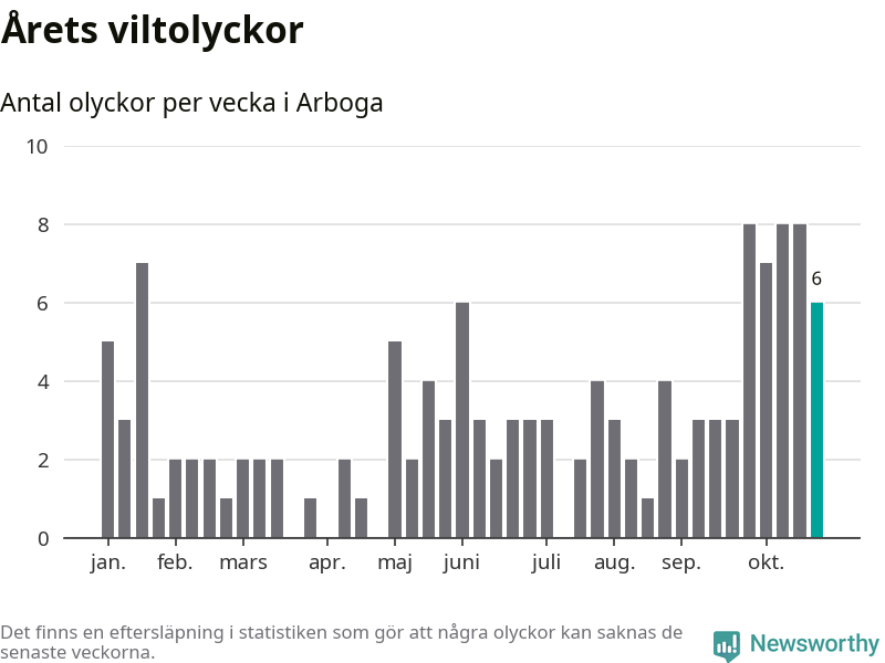 Hittills har sex viltolyckor rapporterats in i Arboga kommun från vecka 44. Se listan här.