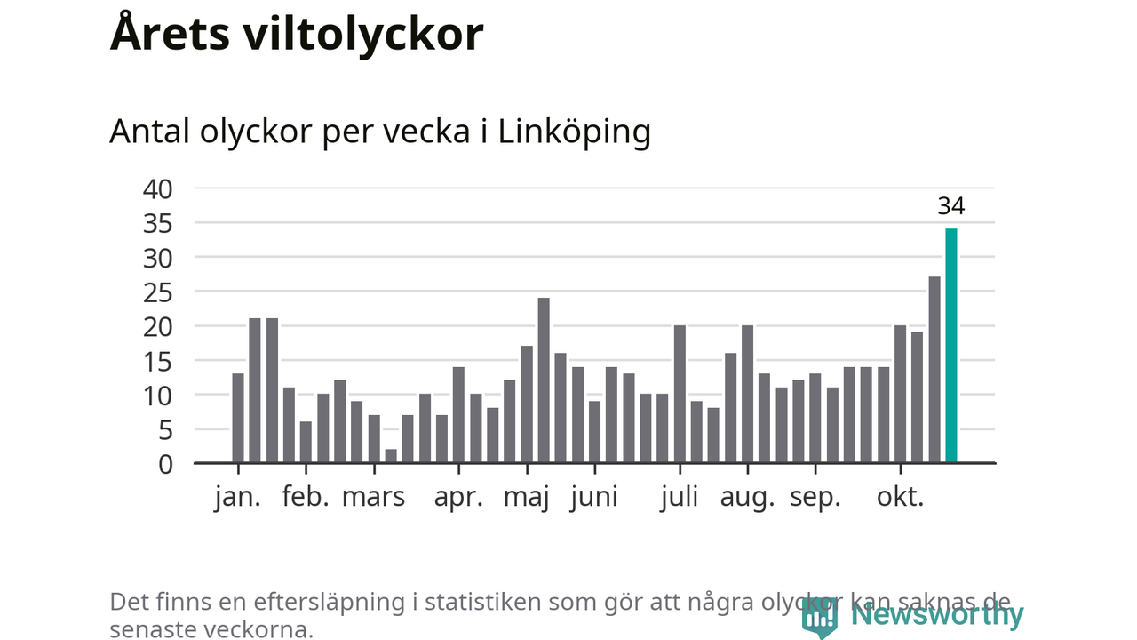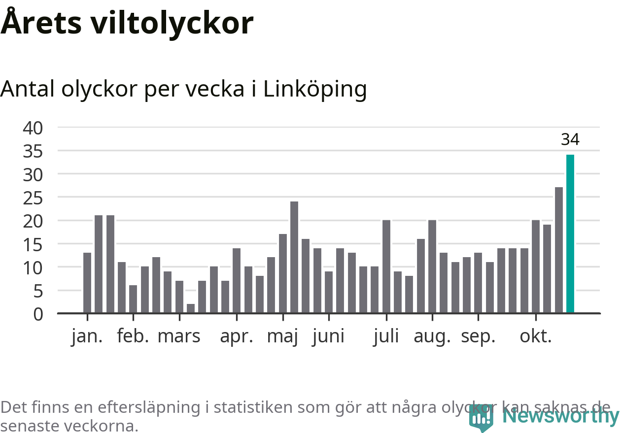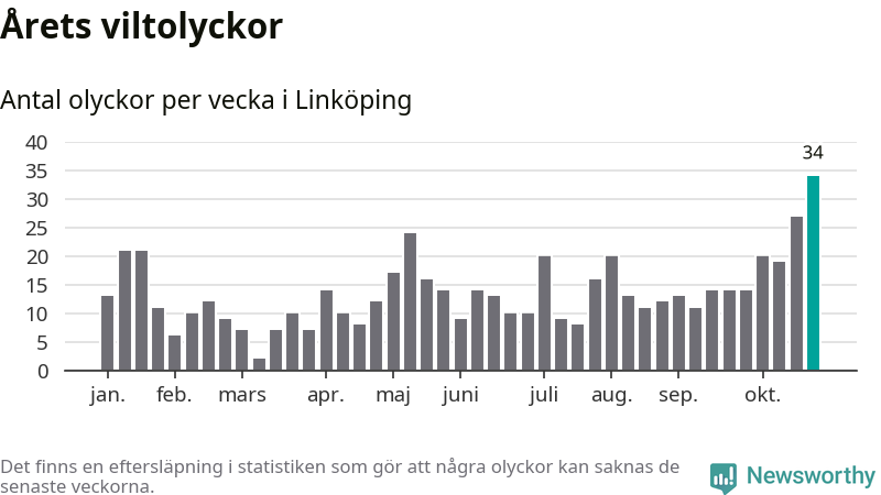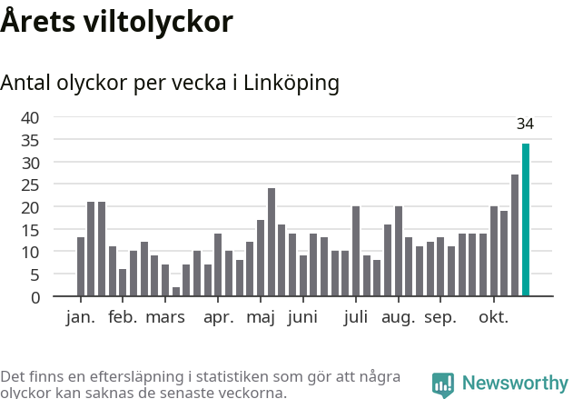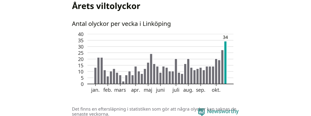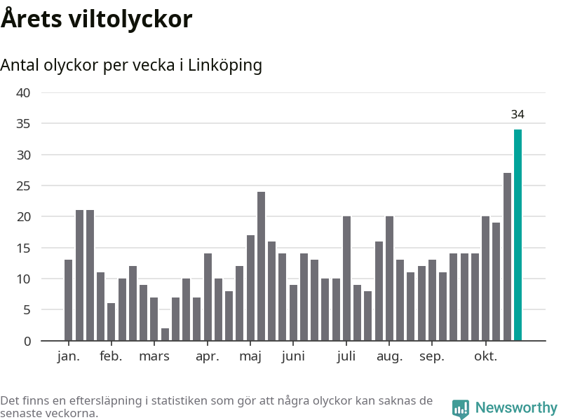 Under vecka 44 rapporterades 34 viltolyckor in i Linköpings kommun. Det är det största antalet på en enskild vecka hittills i år.