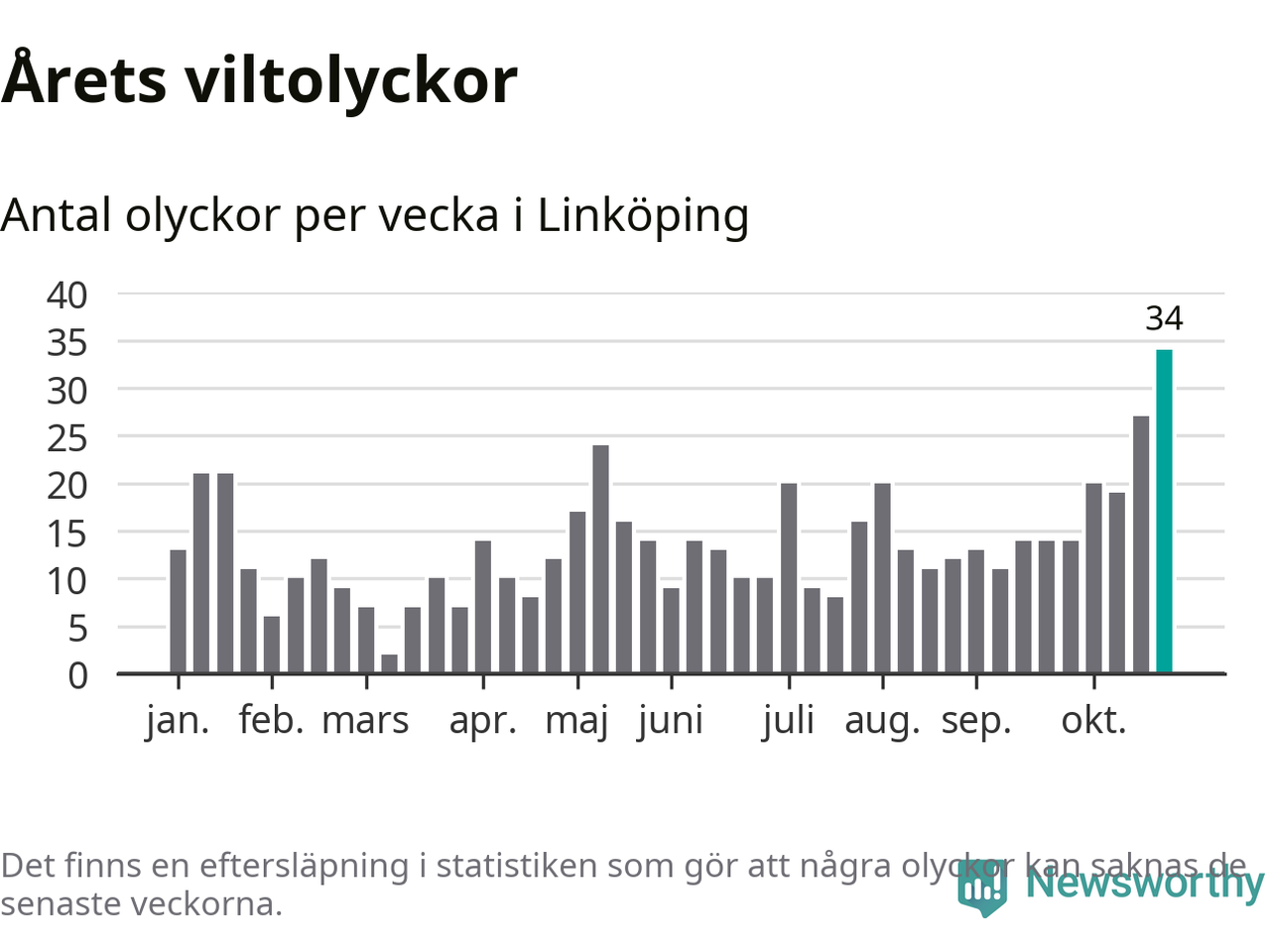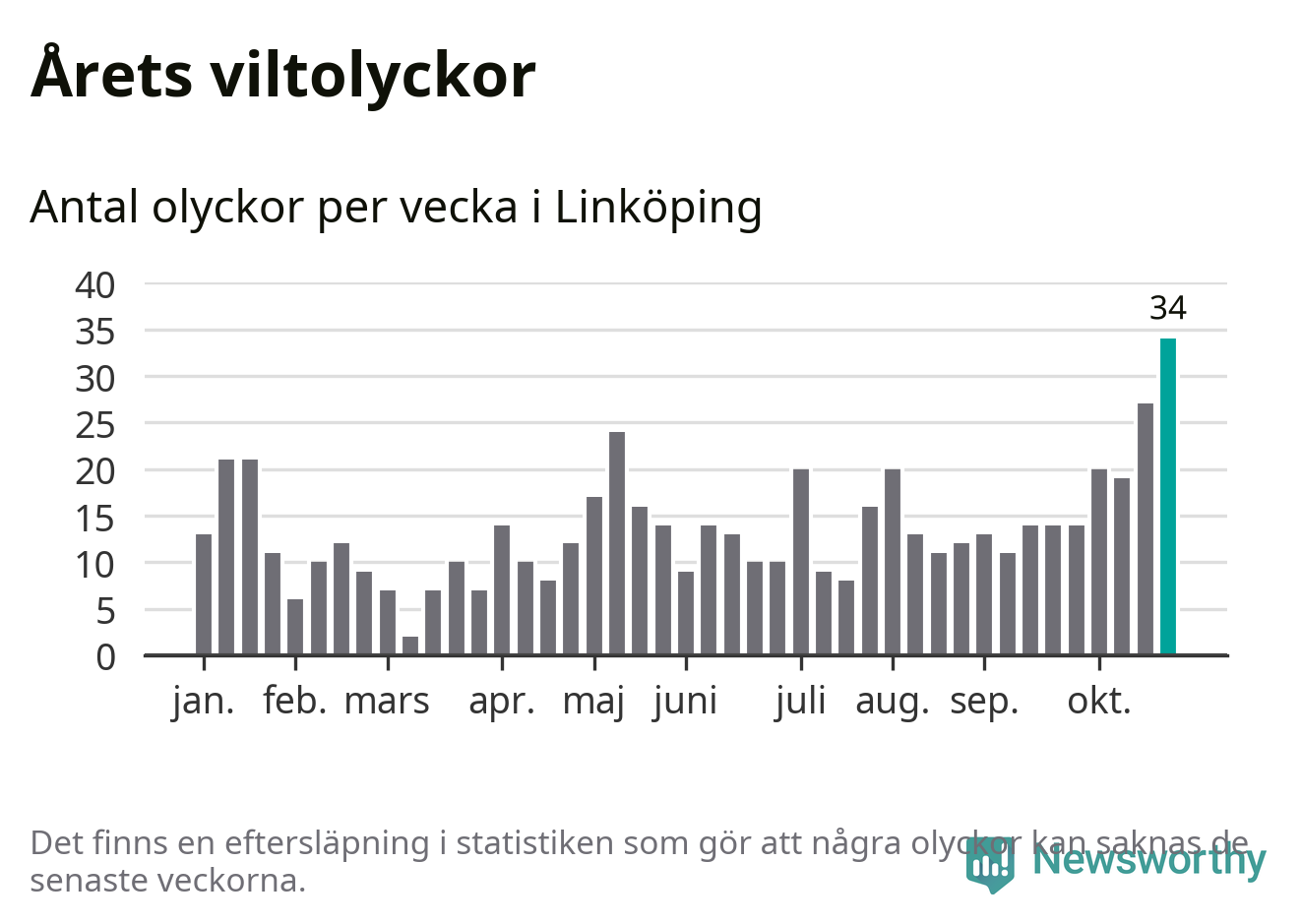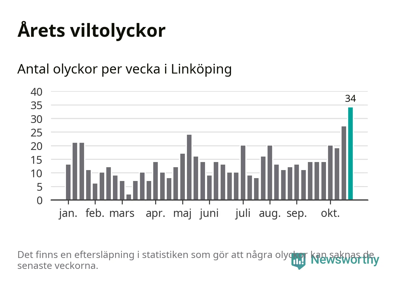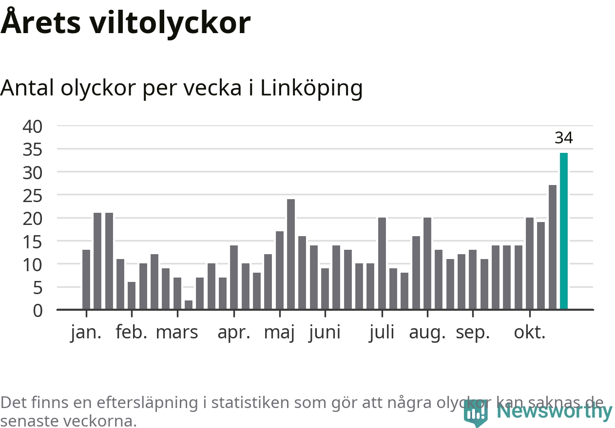 Under vecka 44 rapporterades 34 viltolyckor in i Linköpings kommun. Det är det största antalet på en enskild vecka hittills i år.