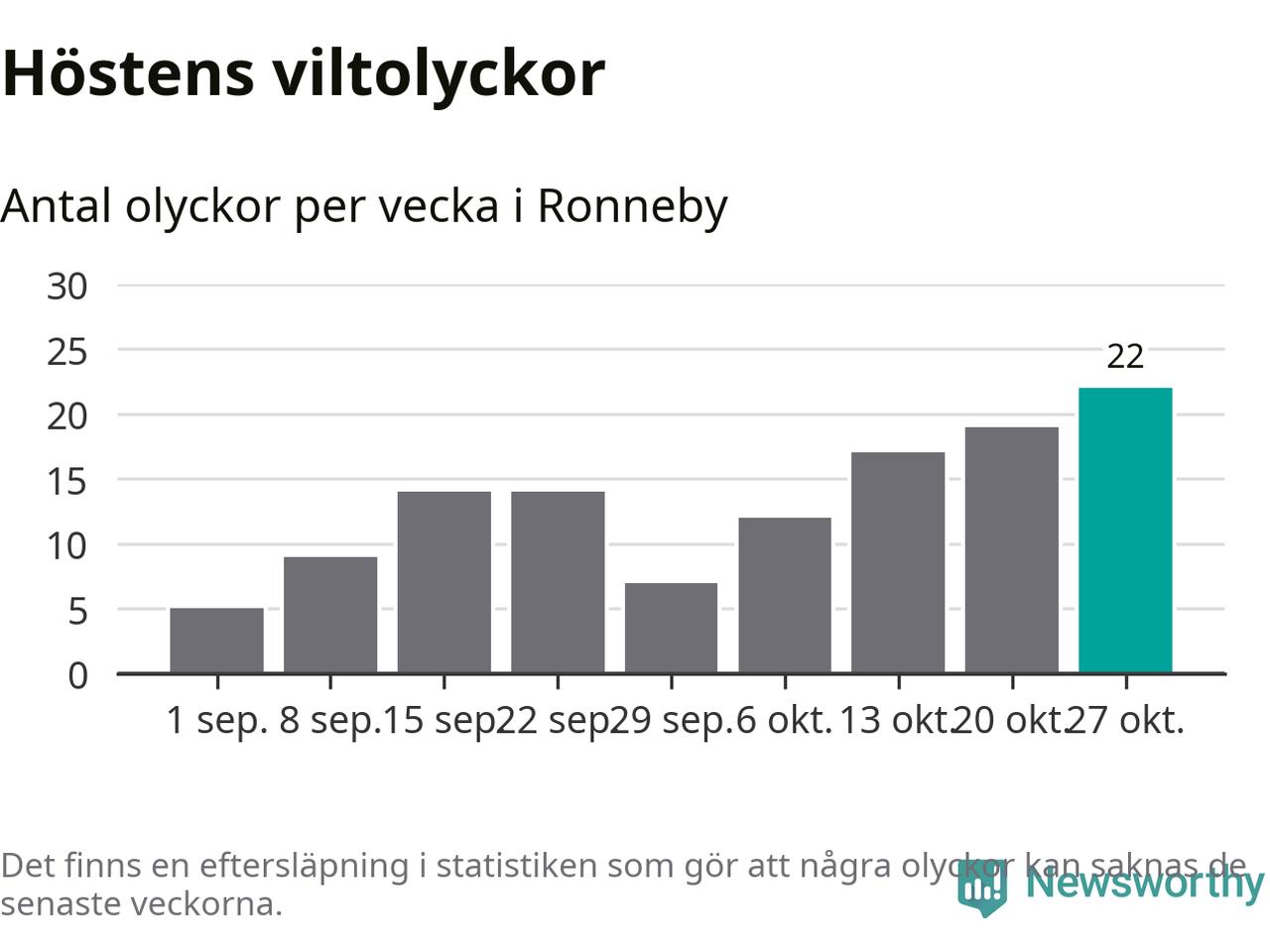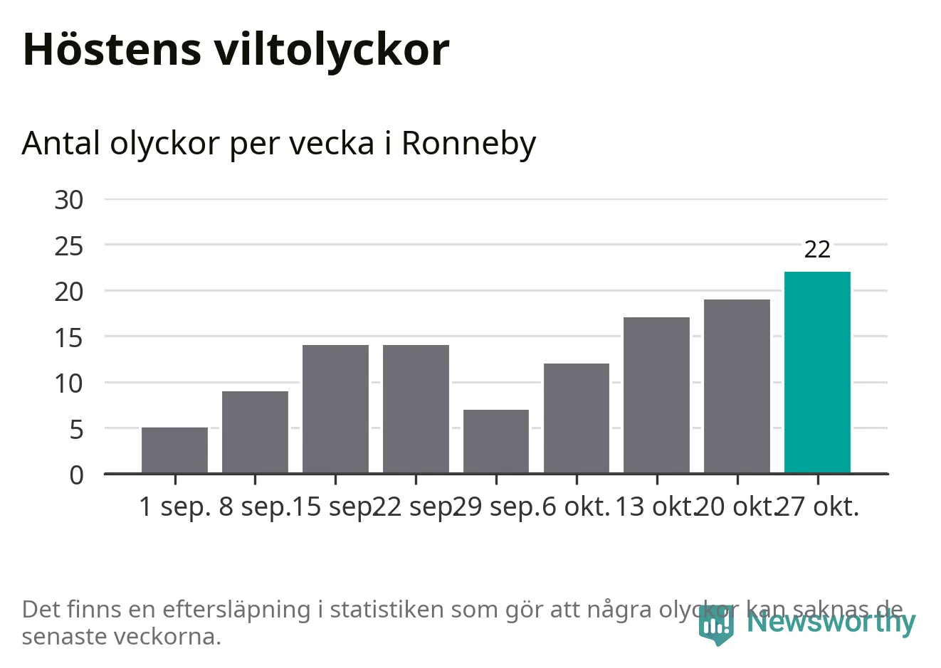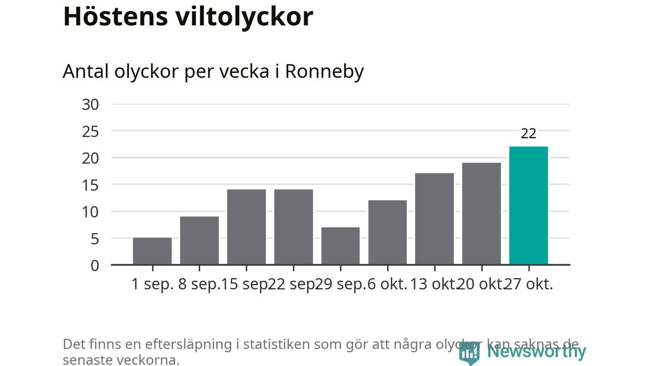 Hittills har 22 viltolyckor rapporterats in i Ronneby kommun från vecka 44. Det är en av de högsta höstsiffrorna för en enskild vecka på över tio år.