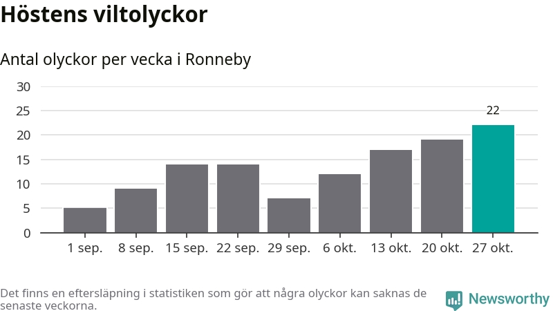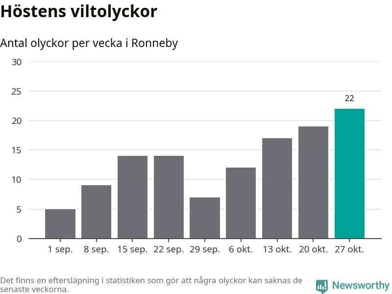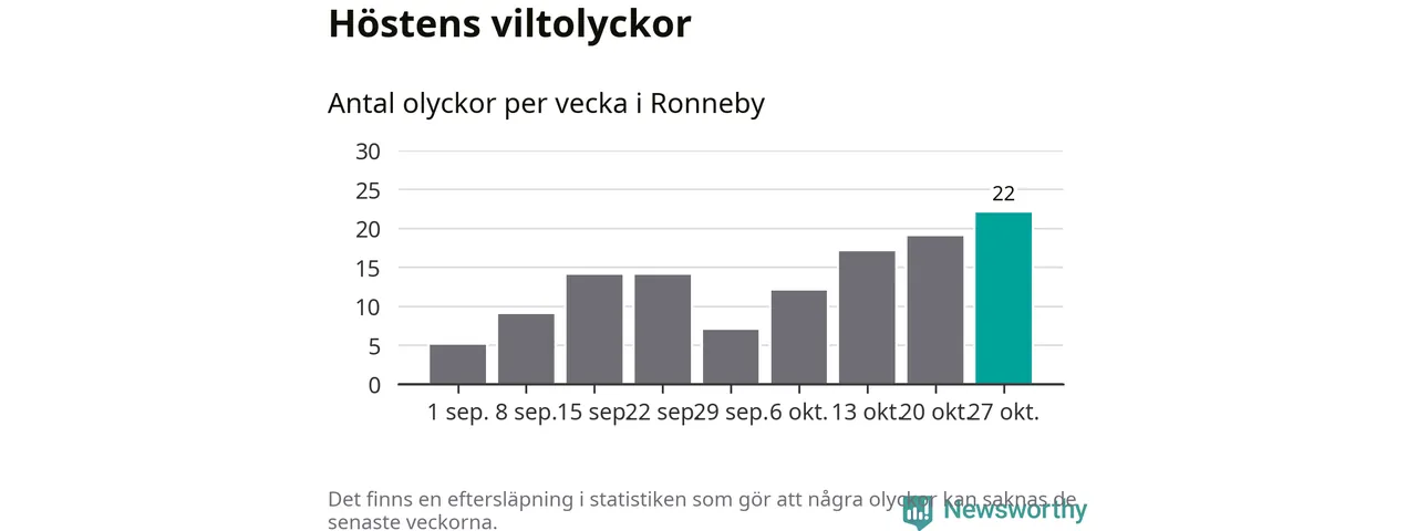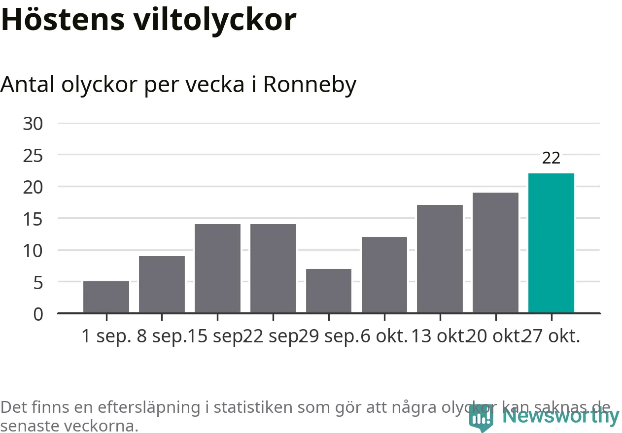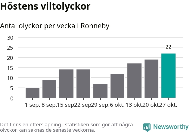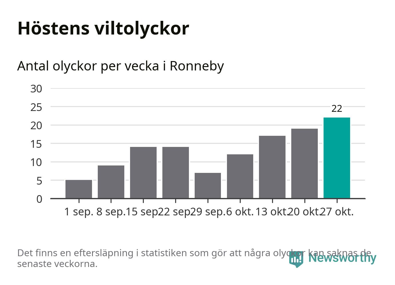 Hittills har 22 viltolyckor rapporterats in i Ronneby kommun från vecka 44. Det är en av de högsta höstsiffrorna för en enskild vecka på över tio år.