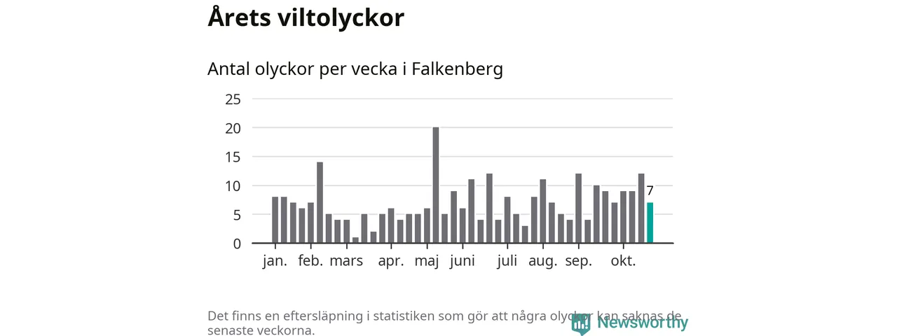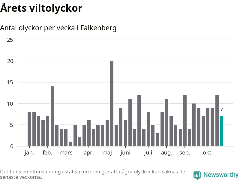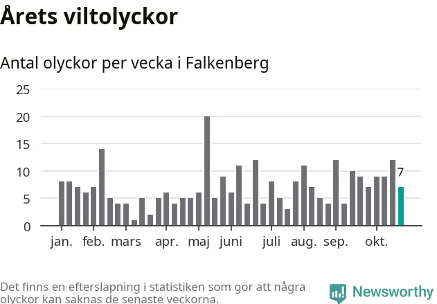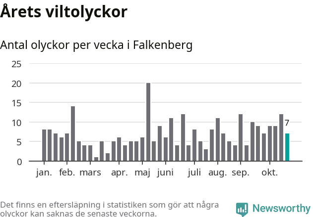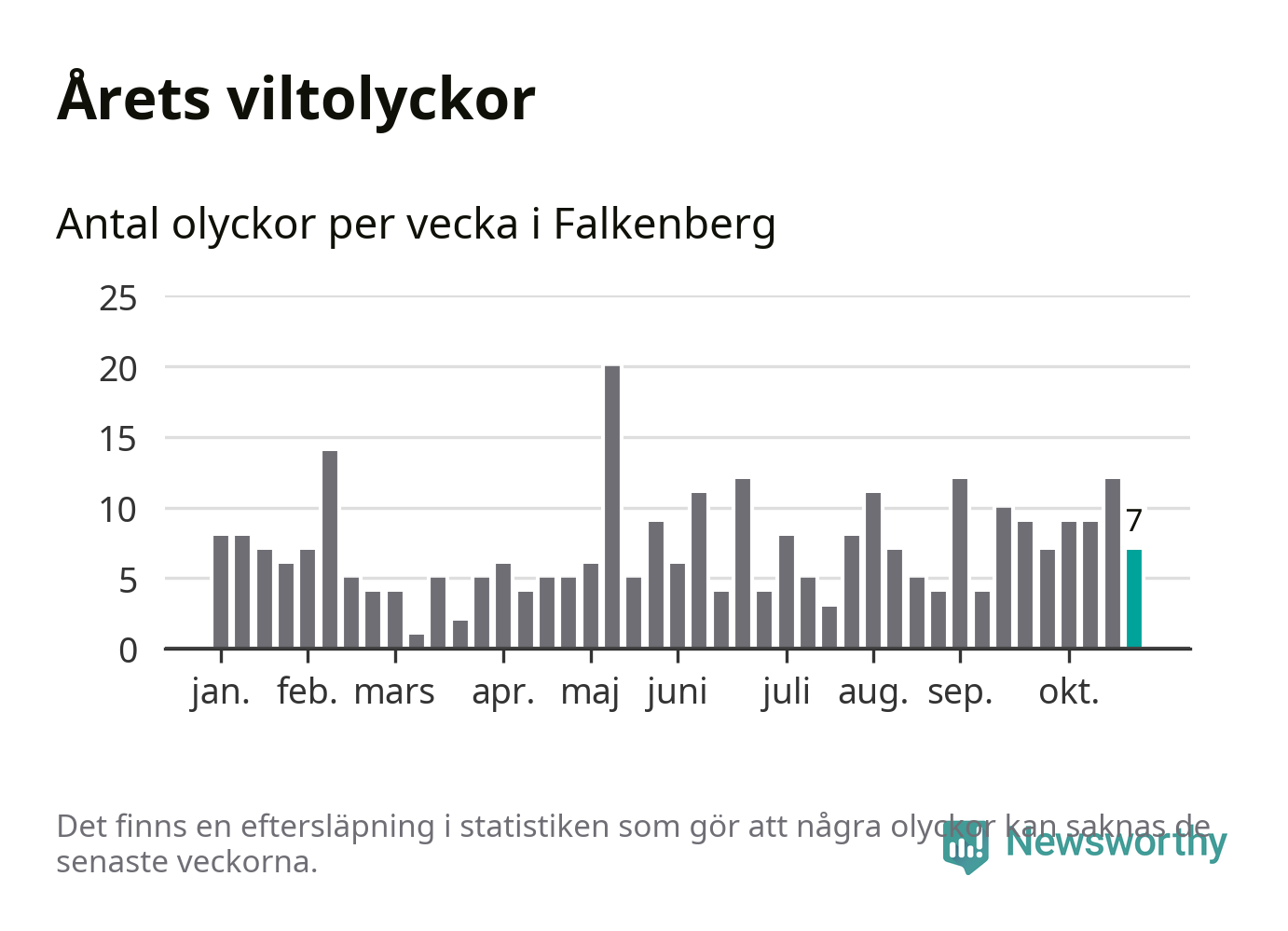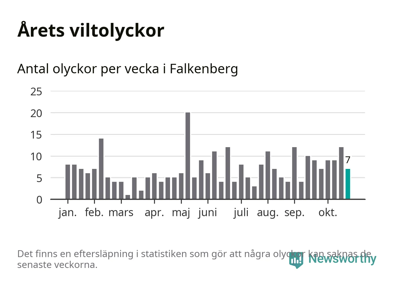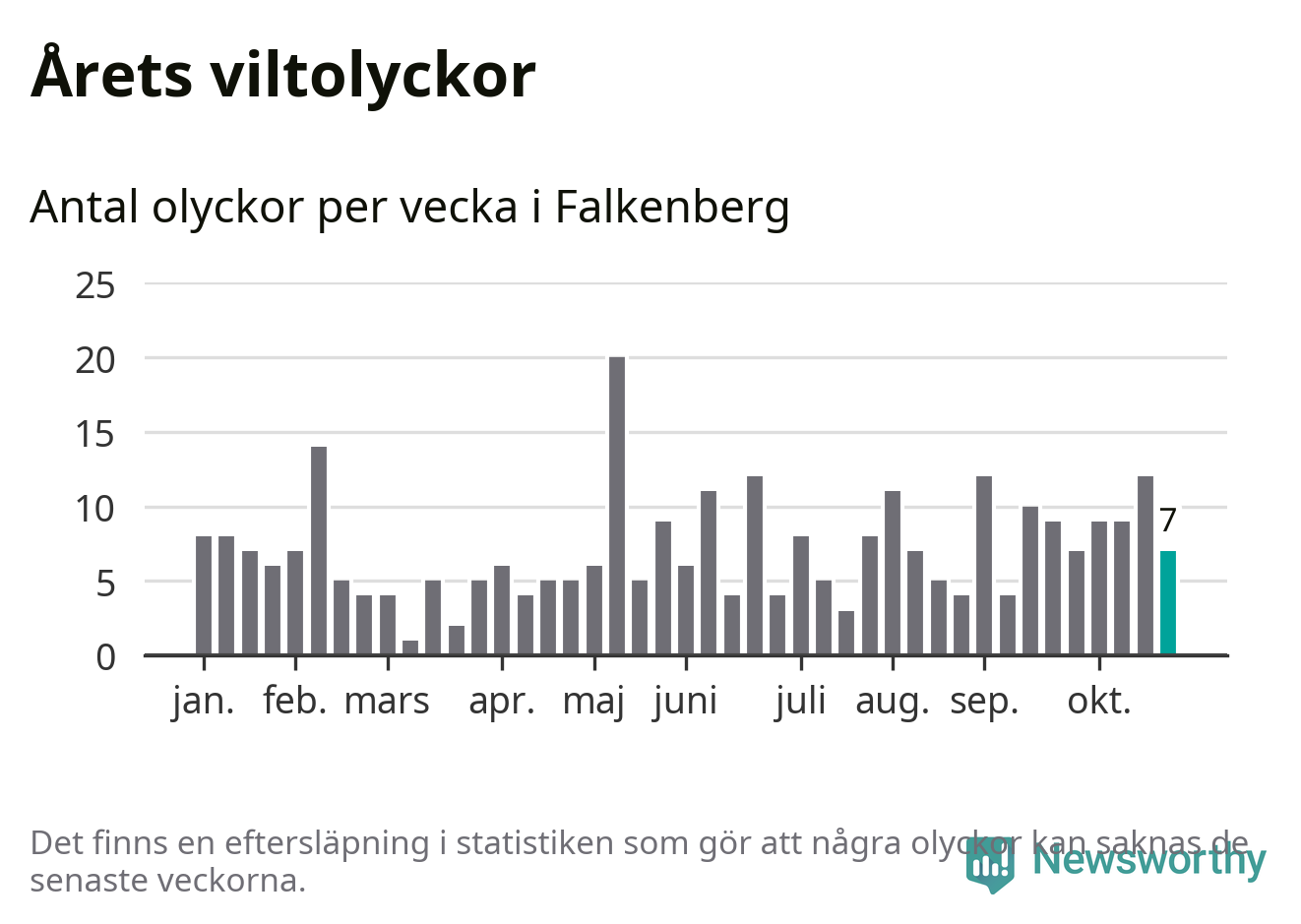 Hittills har sju viltolyckor rapporterats in i Falkenbergs kommun från vecka 44. Se listan här.