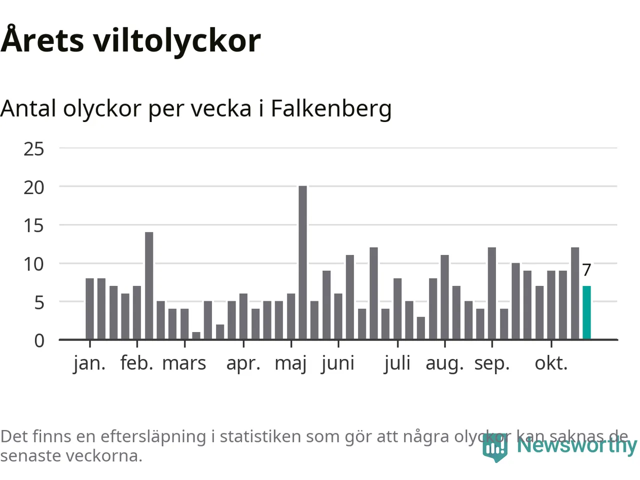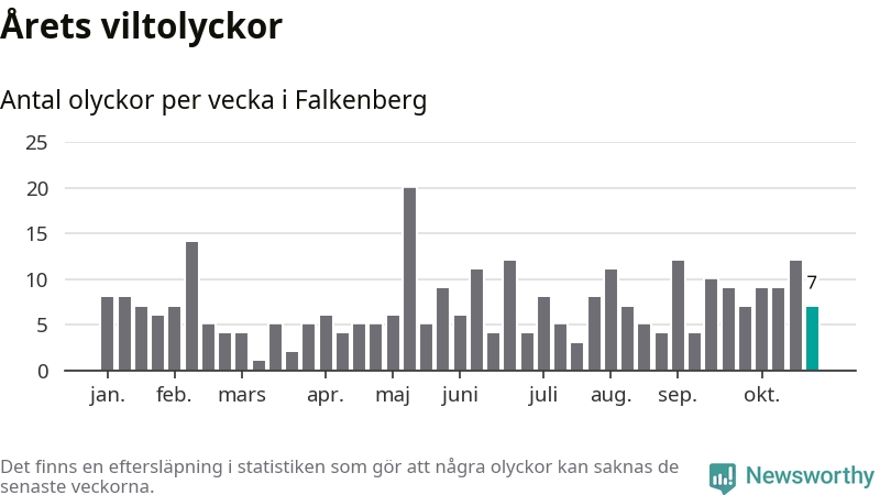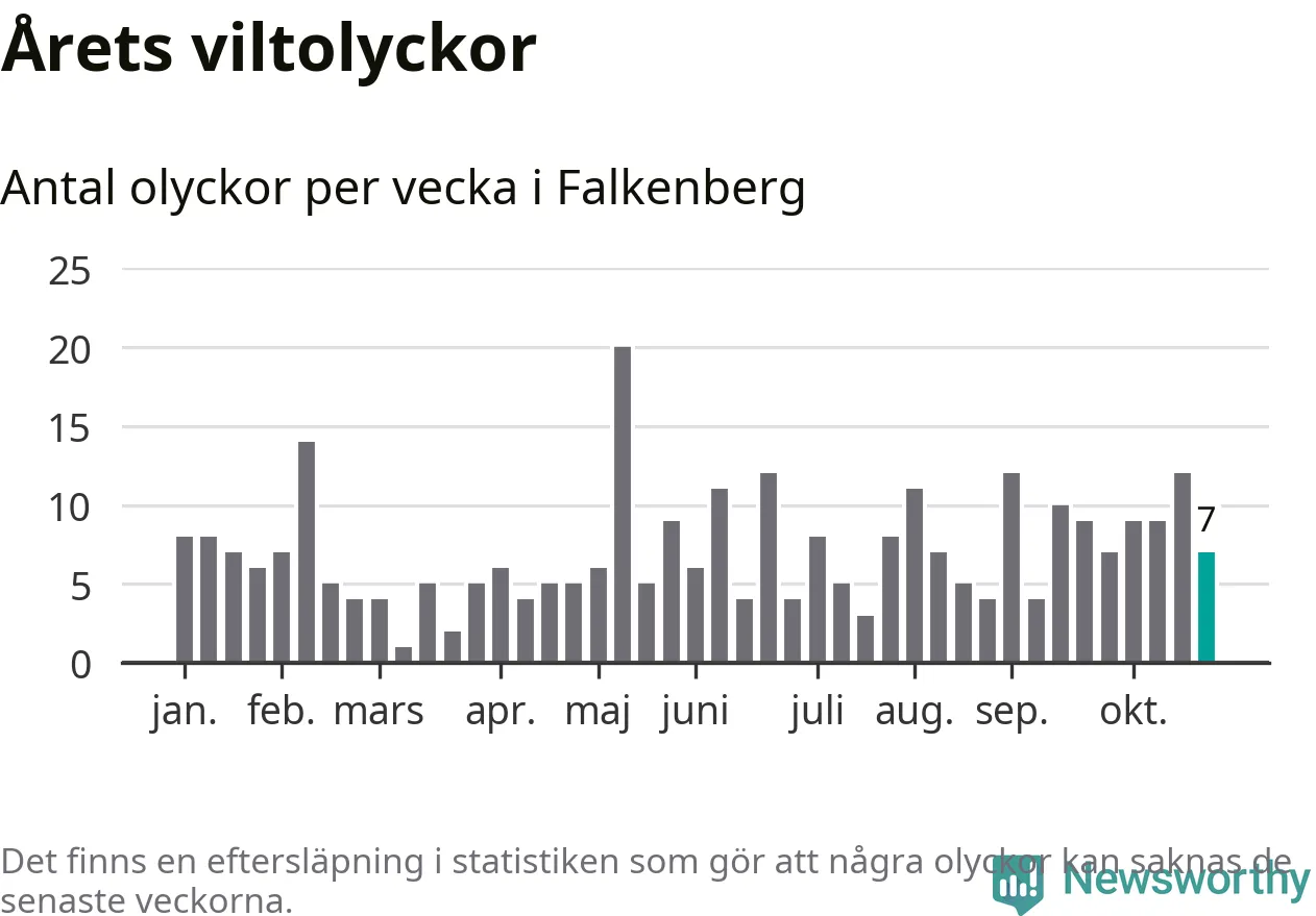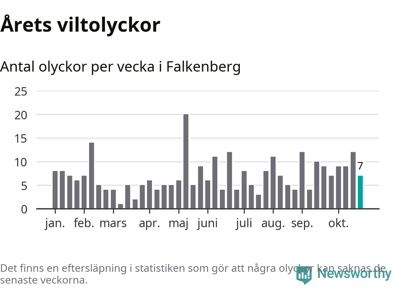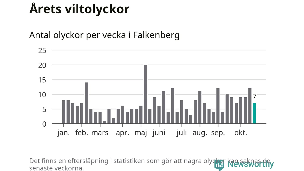 Hittills har sju viltolyckor rapporterats in i Falkenbergs kommun från vecka 44. Se listan här.