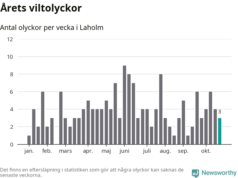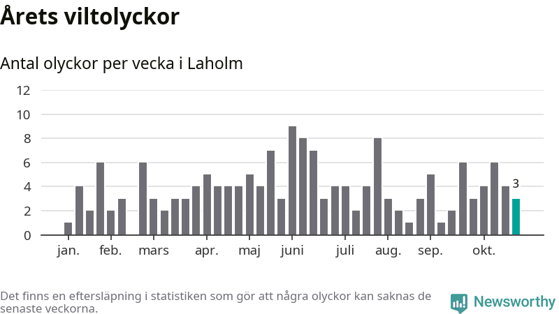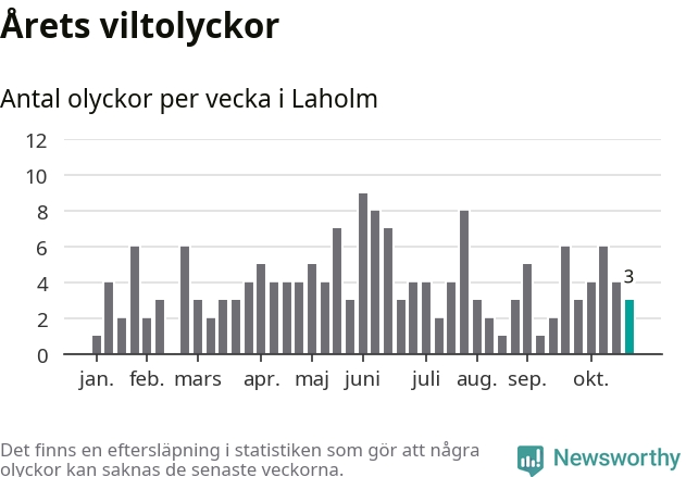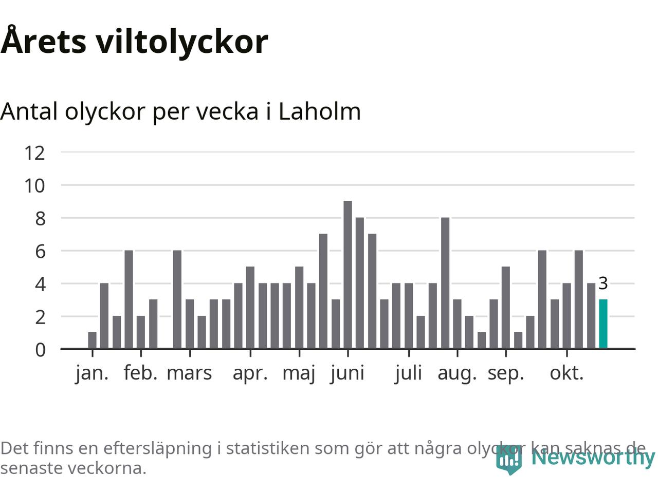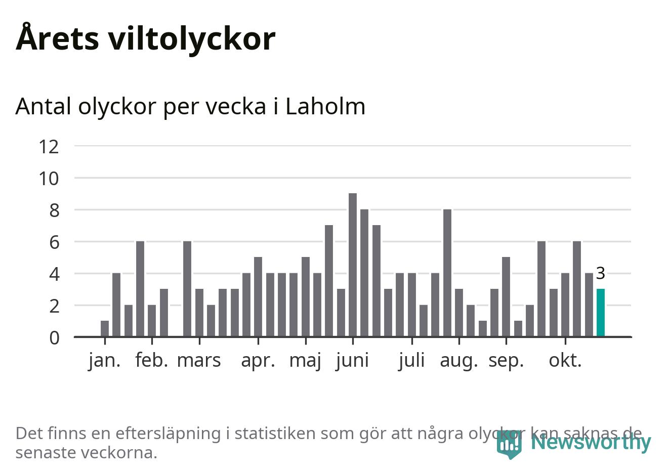 Hittills har tre viltolyckor rapporterats in i Laholms kommun från vecka 44. Se listan här.