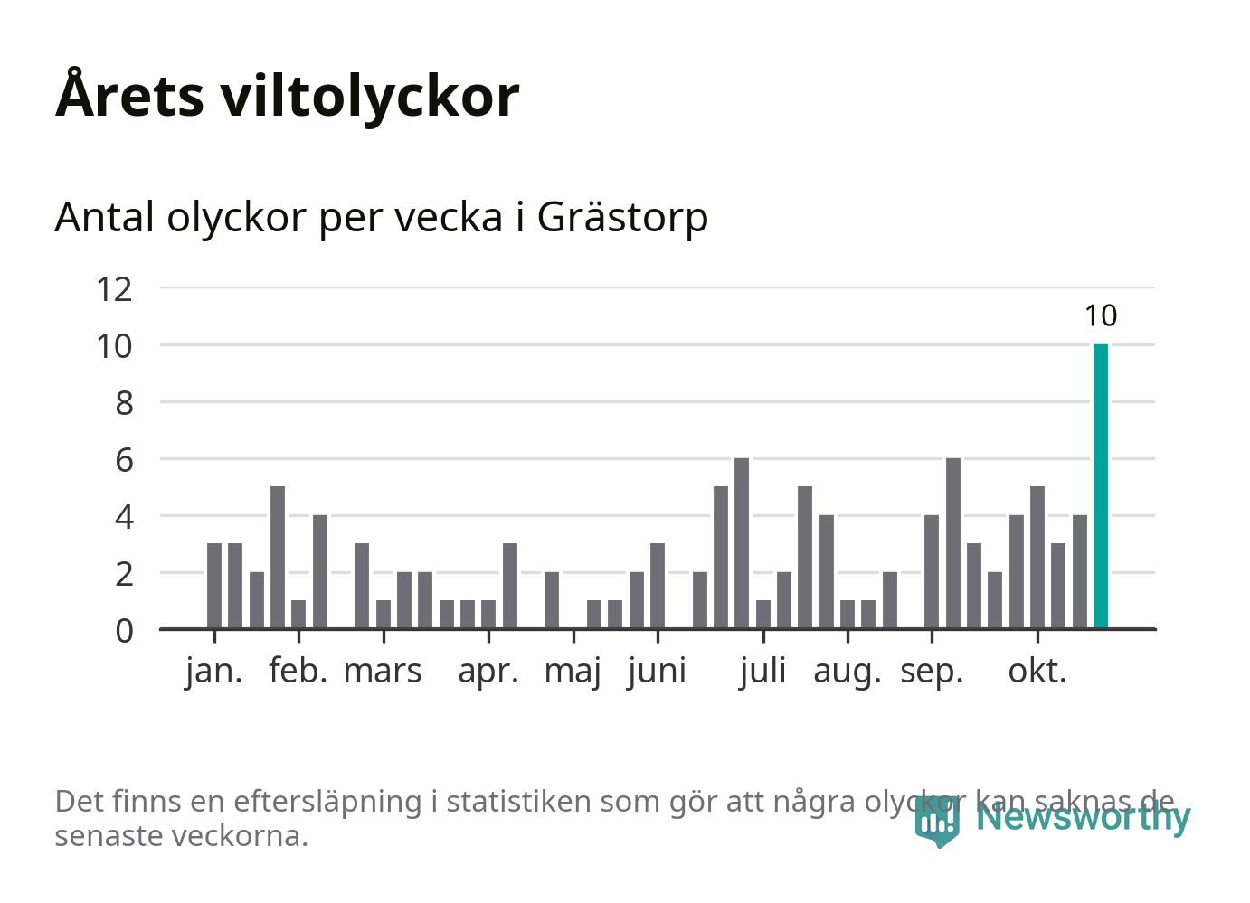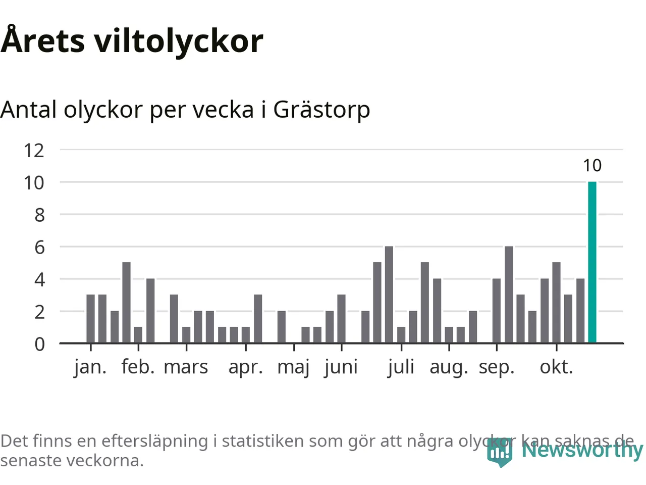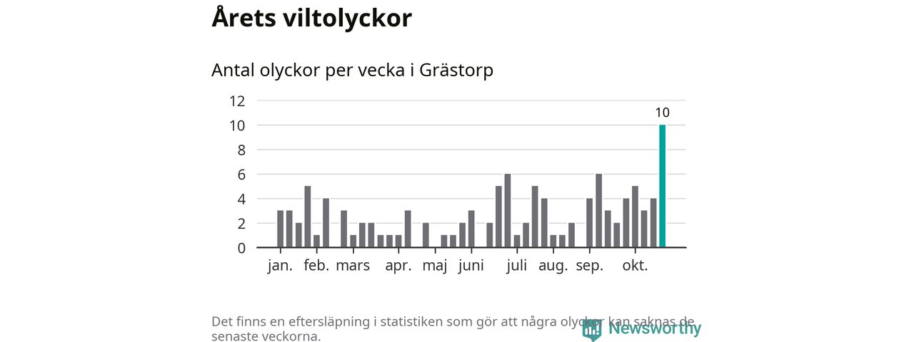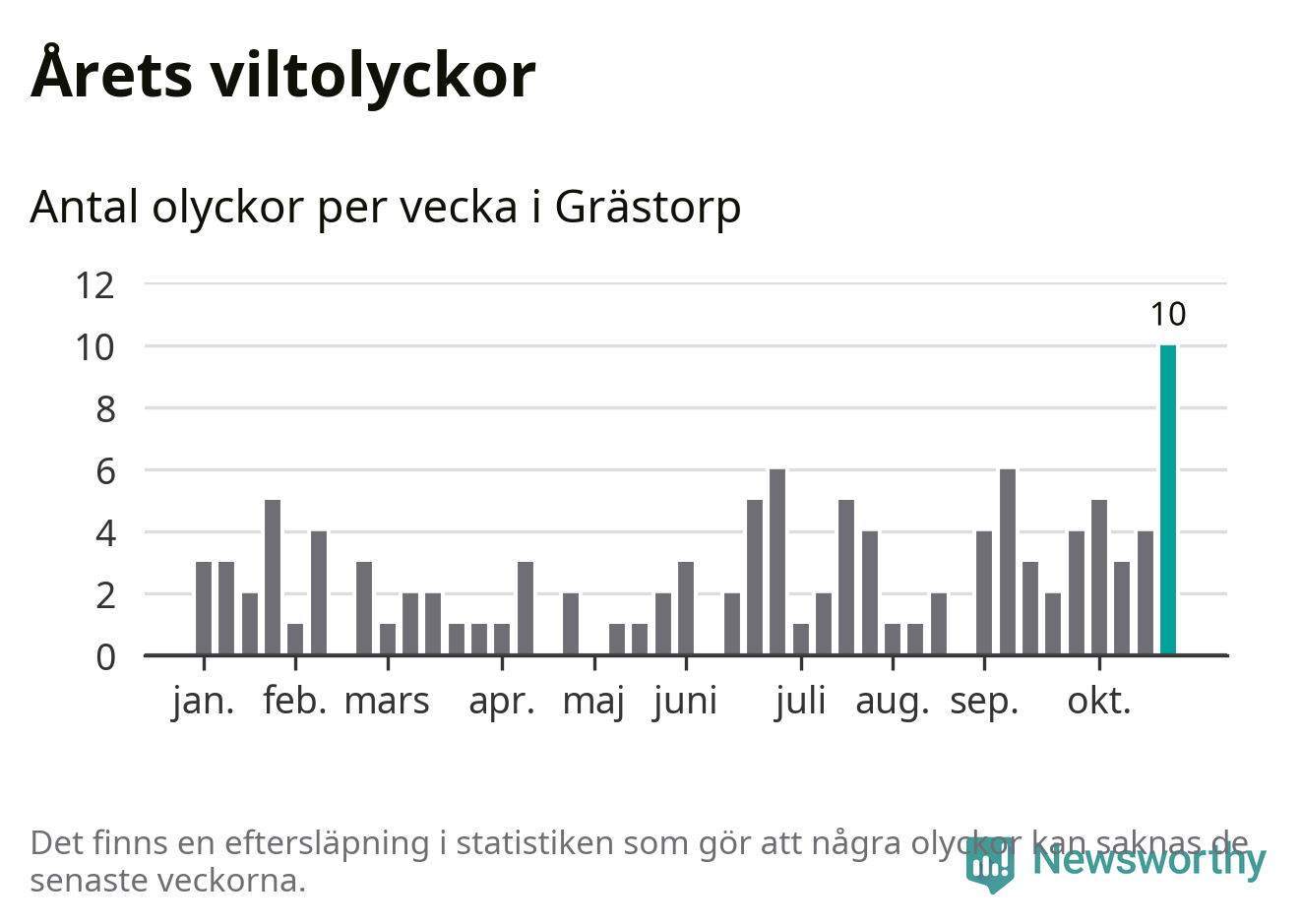 Under vecka 44 rapporterades tio viltolyckor in i Grästorps kommun. Det är det största antalet på en enskild vecka hittills i år.