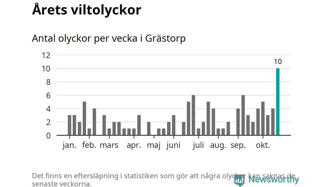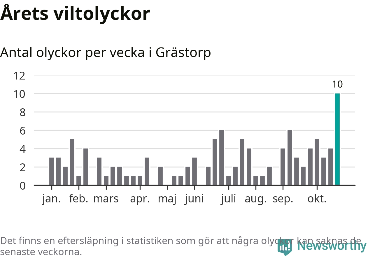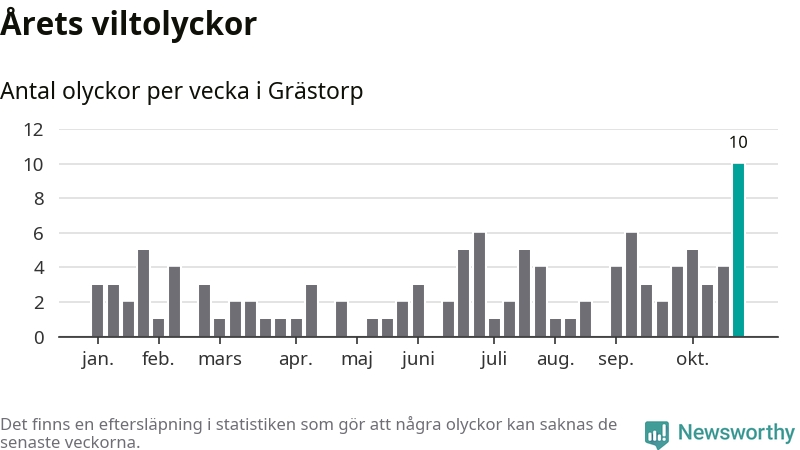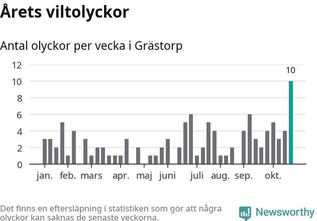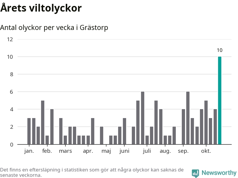 Under vecka 44 rapporterades tio viltolyckor in i Grästorps kommun. Det är det största antalet på en enskild vecka hittills i år.