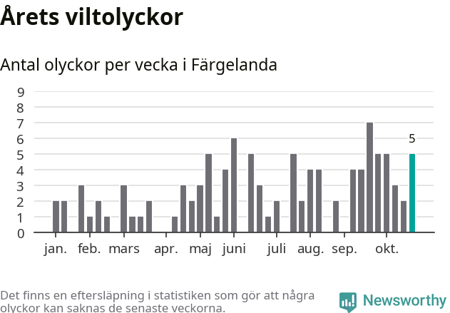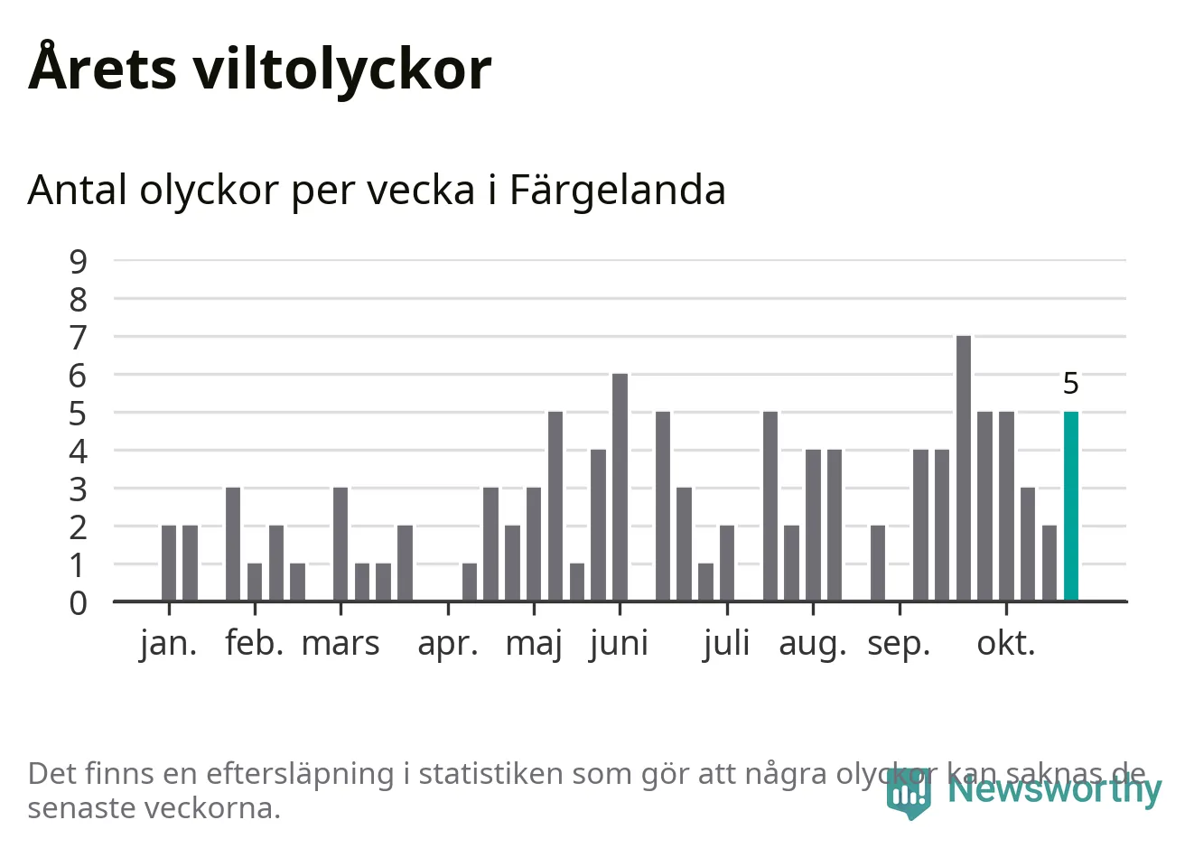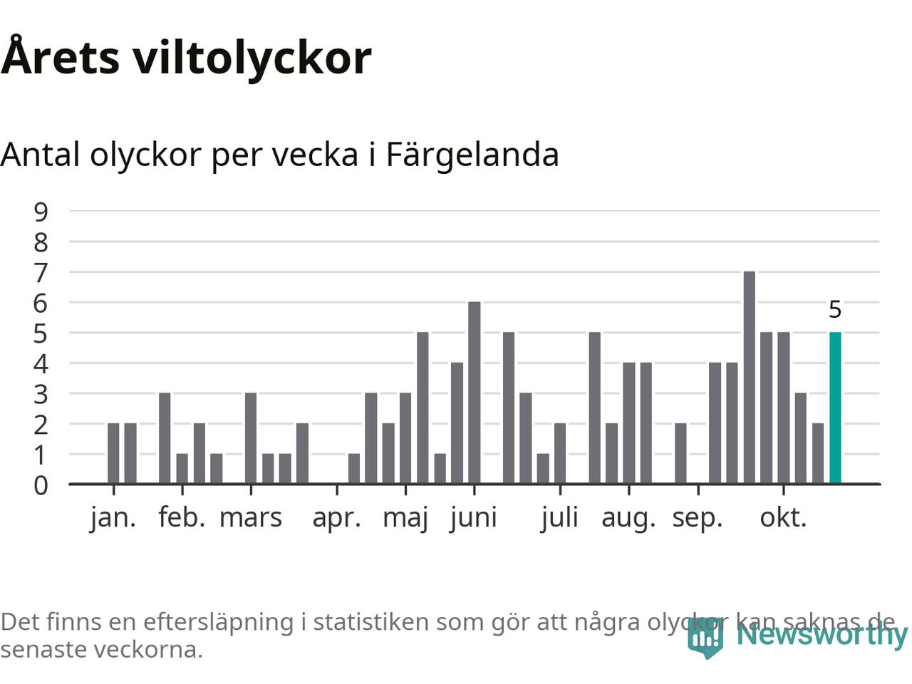 Hittills har fem viltolyckor rapporterats in i Färgelanda kommun från vecka 44. Se listan här.