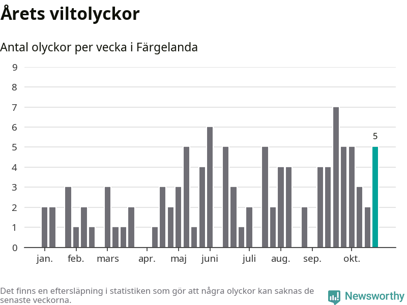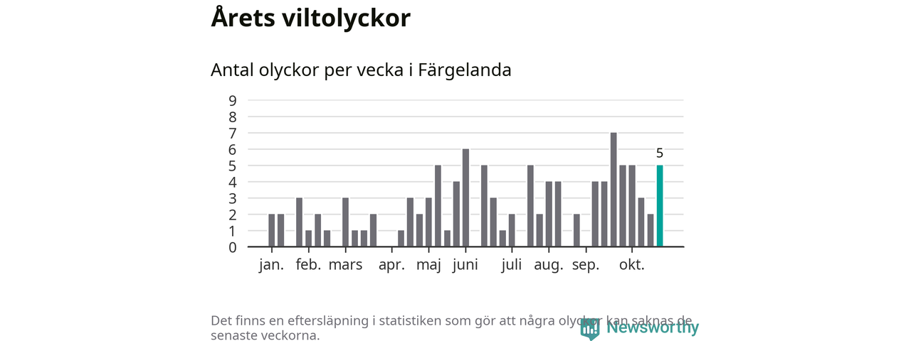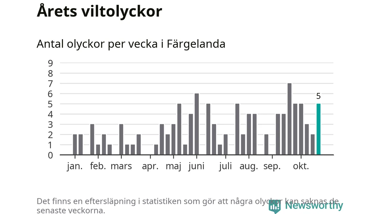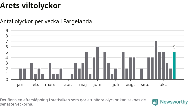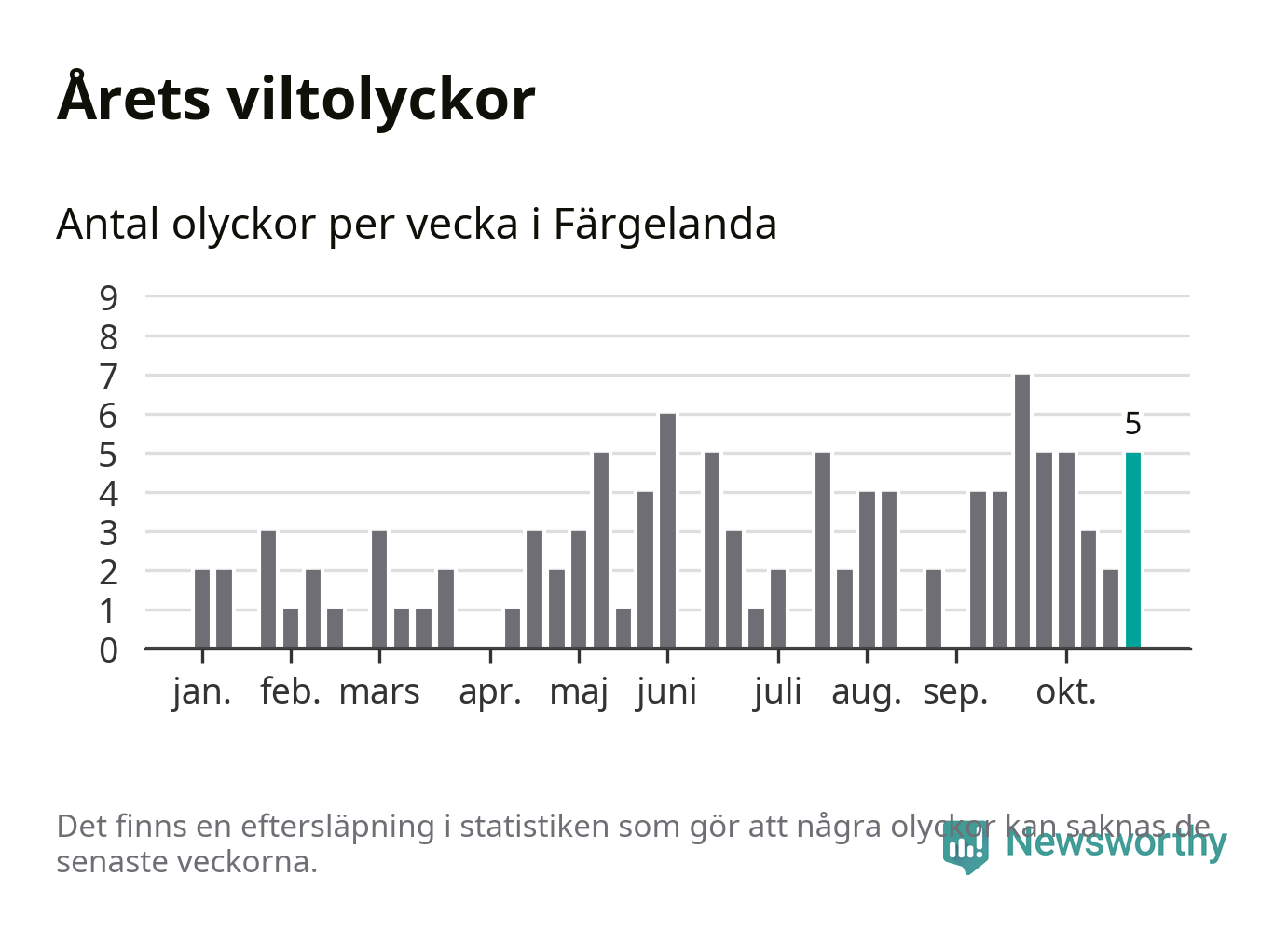 Hittills har fem viltolyckor rapporterats in i Färgelanda kommun från vecka 44. Se listan här.