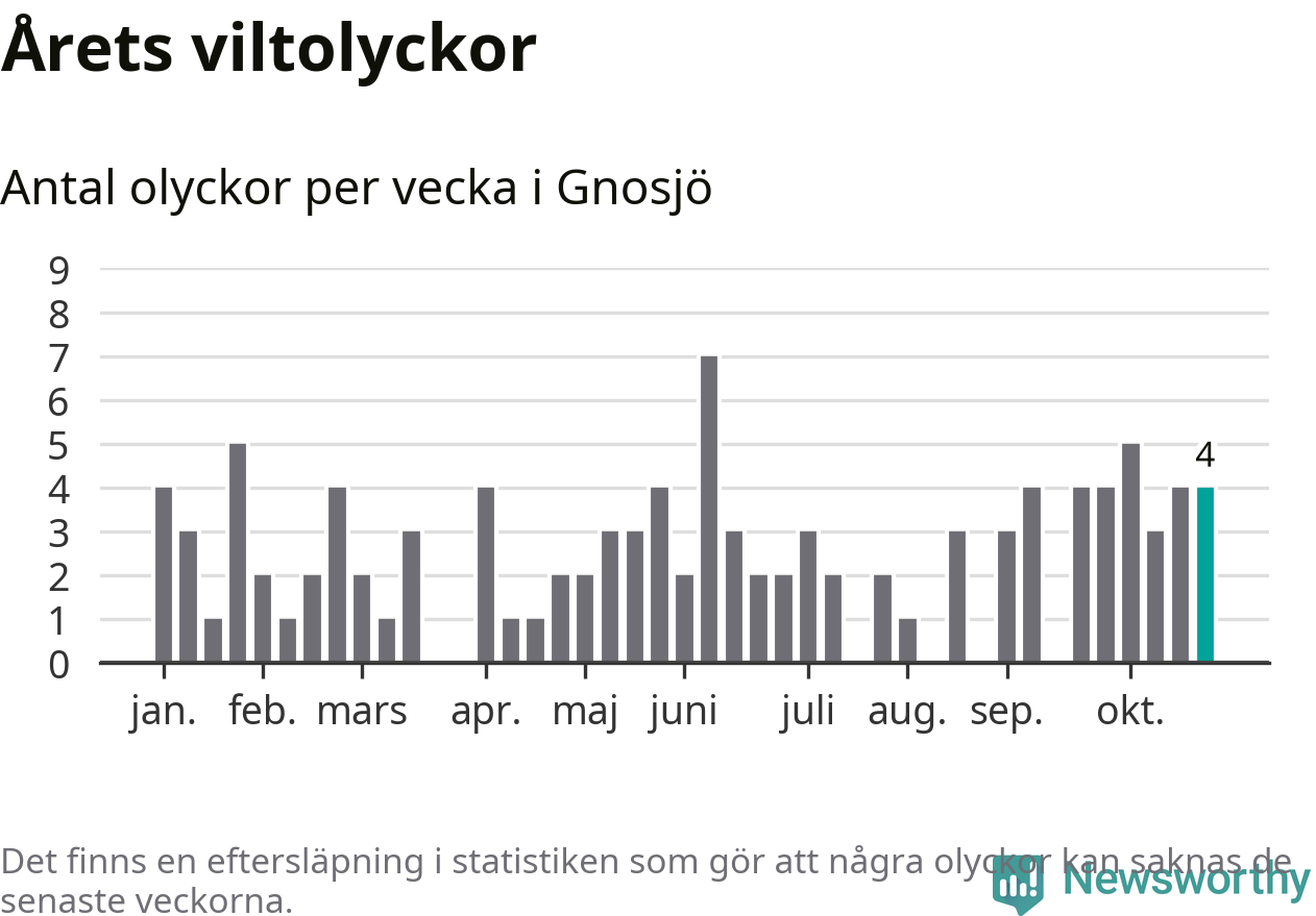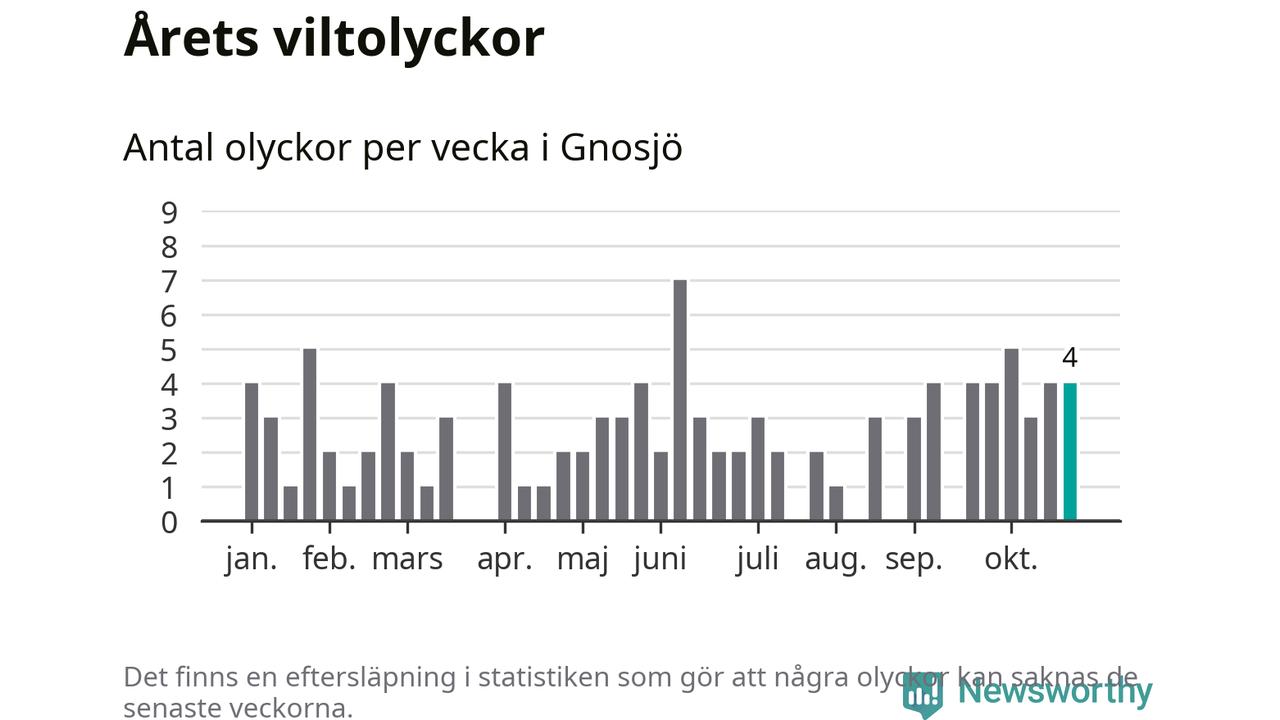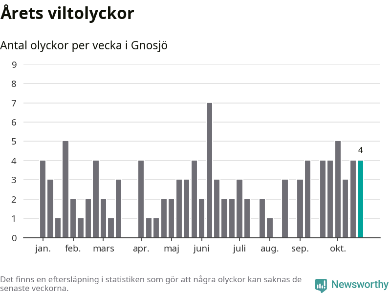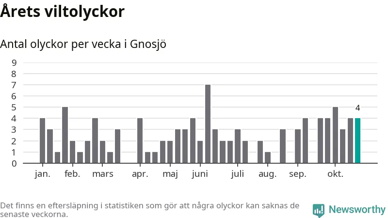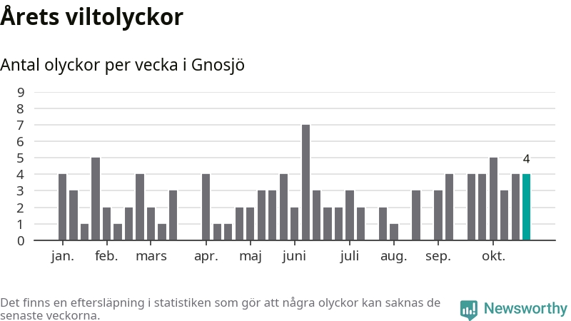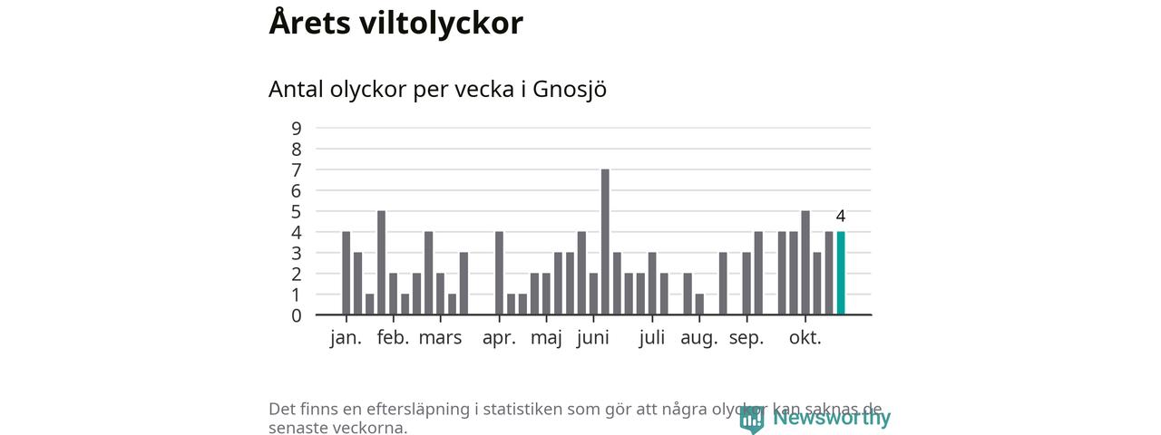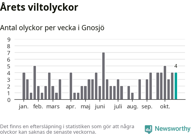Hittills har fyra viltolyckor rapporterats in i Gnosjö kommun från vecka 44. Se listan här.