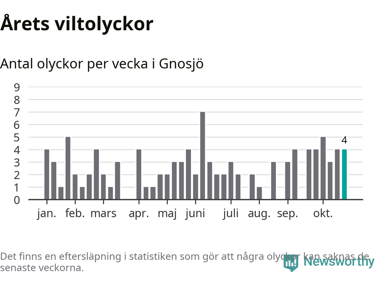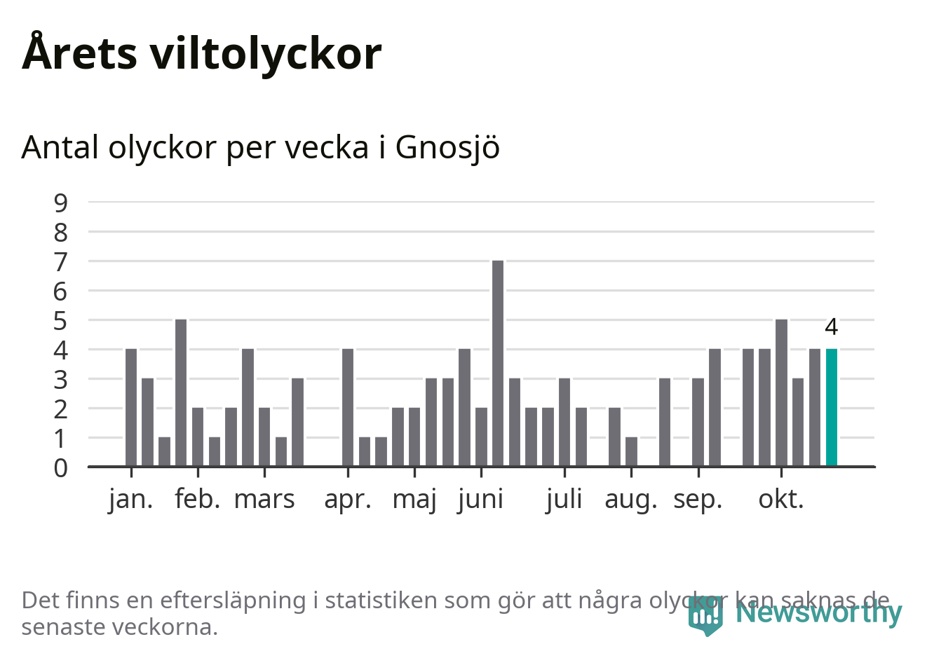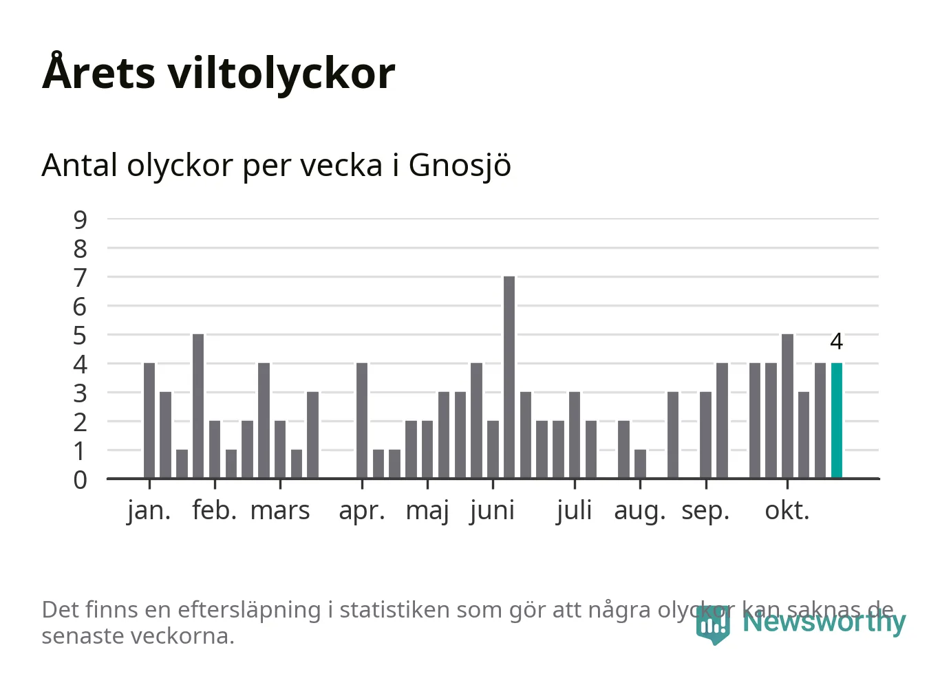 Hittills har fyra viltolyckor rapporterats in i Gnosjö kommun från vecka 44. Se listan här.