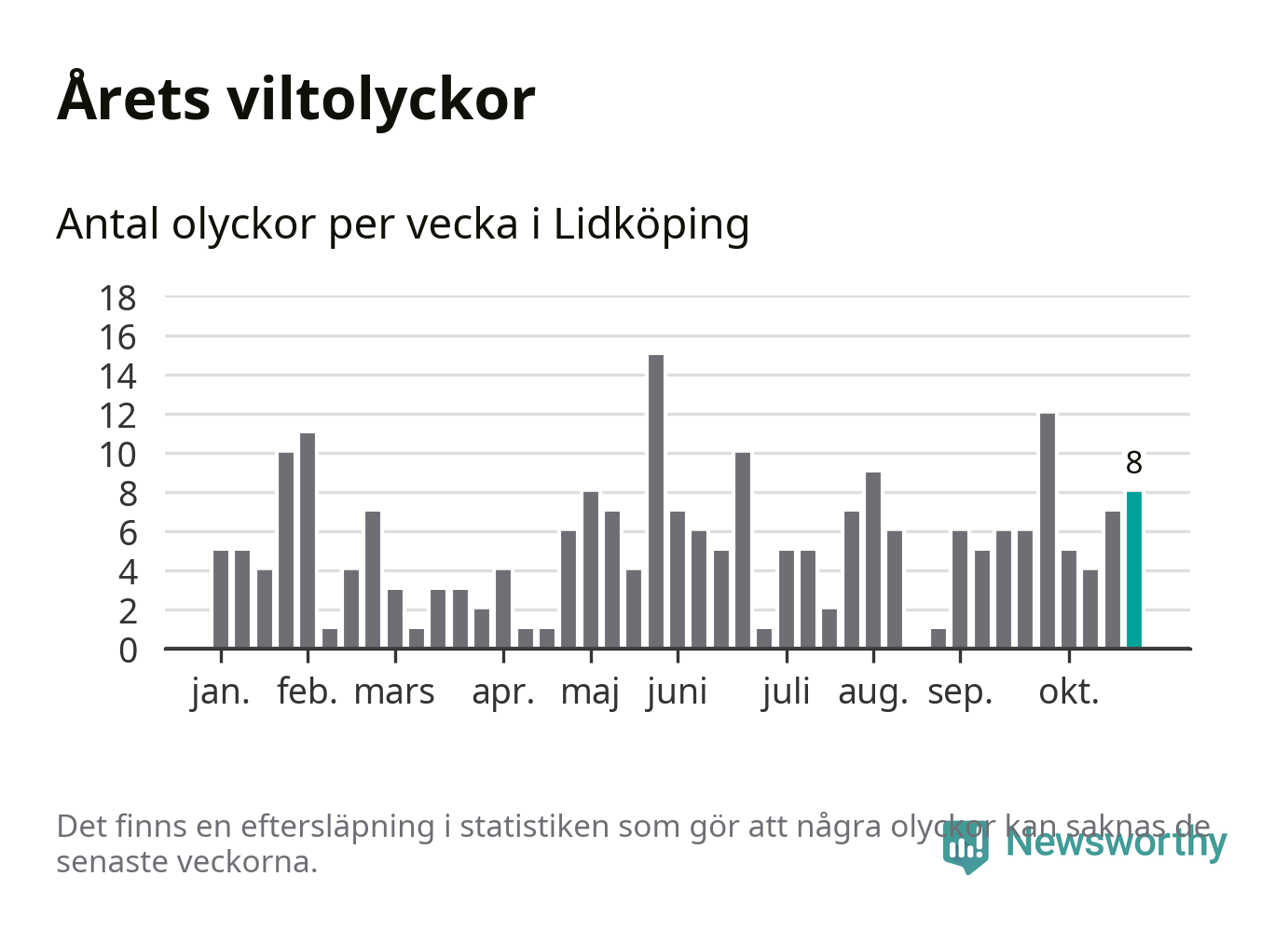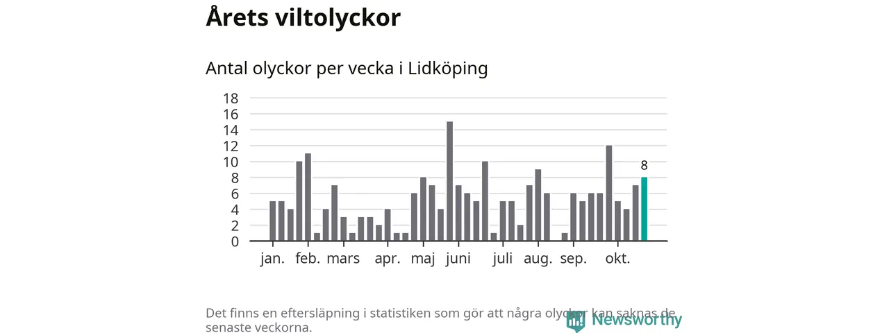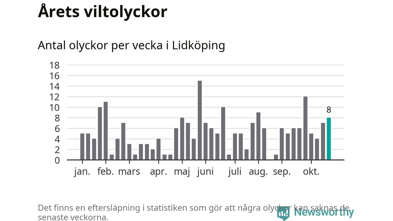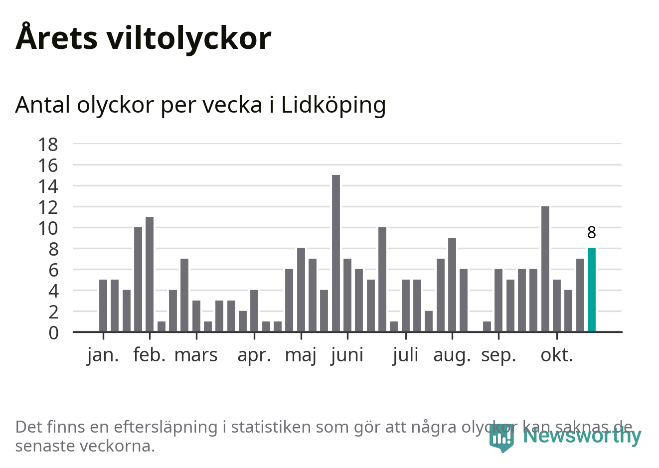 Hittills har åtta viltolyckor rapporterats in i Lidköpings kommun från vecka 44. Se listan här.