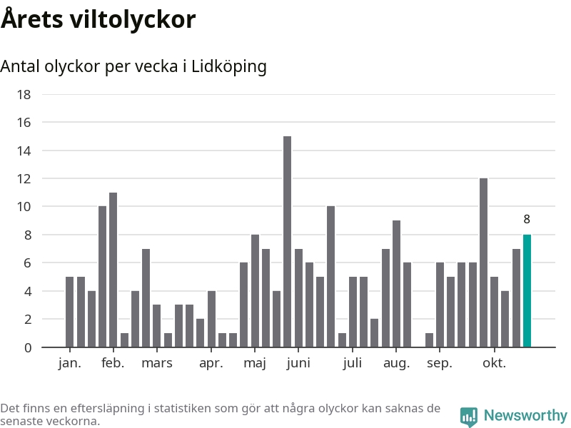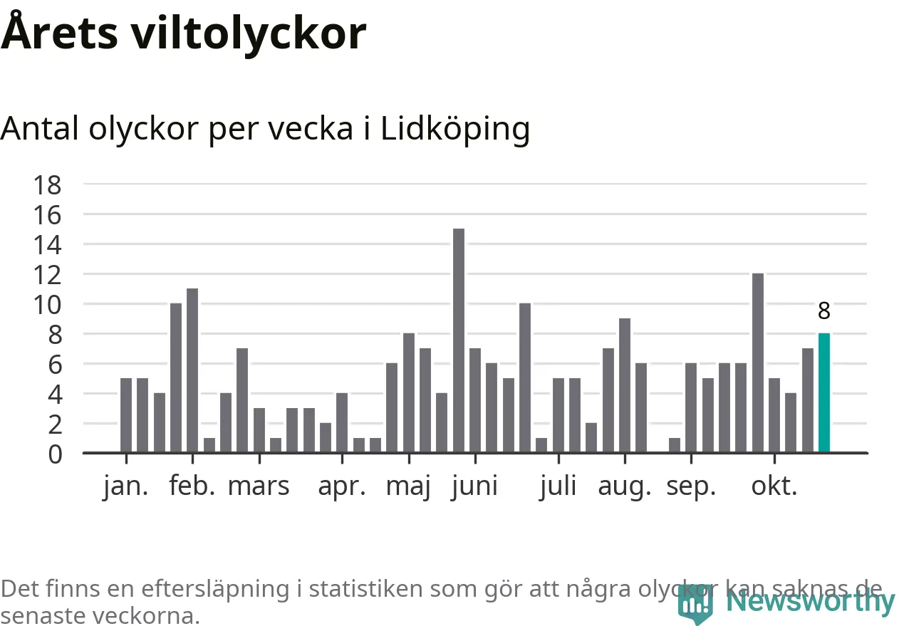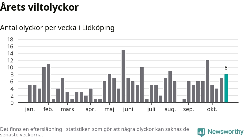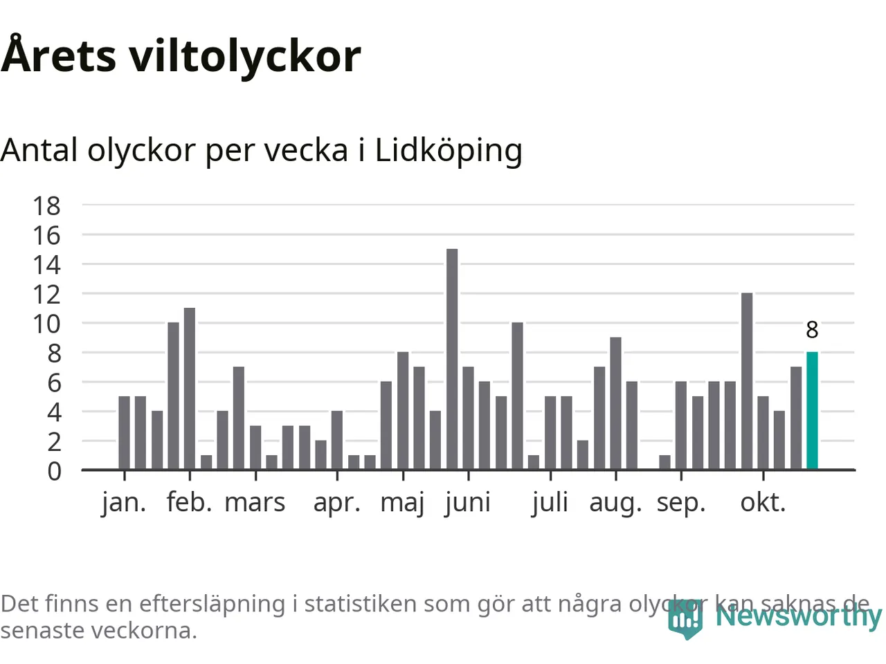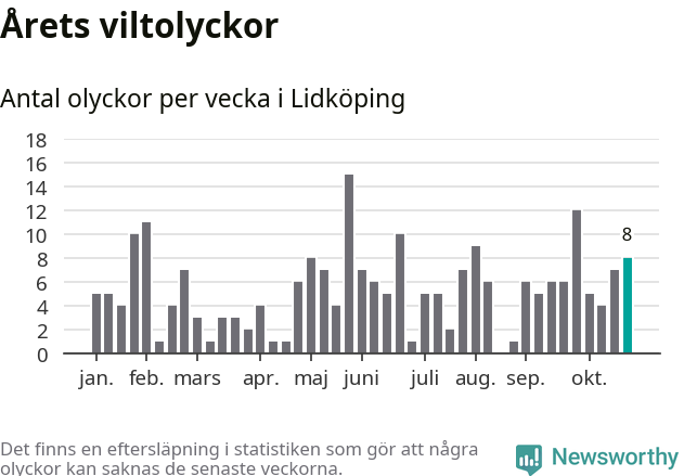 Hittills har åtta viltolyckor rapporterats in i Lidköpings kommun från vecka 44. Se listan här.