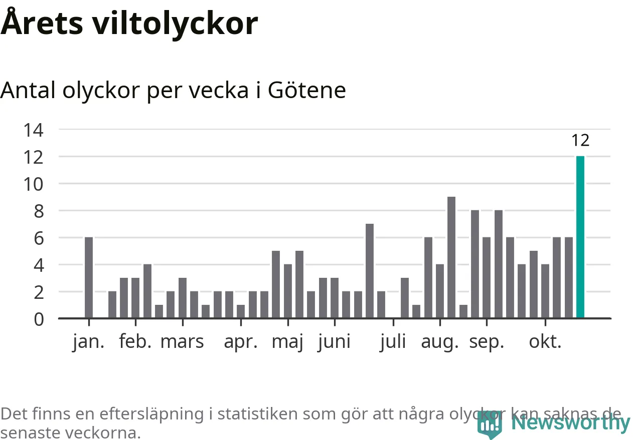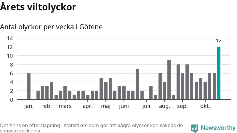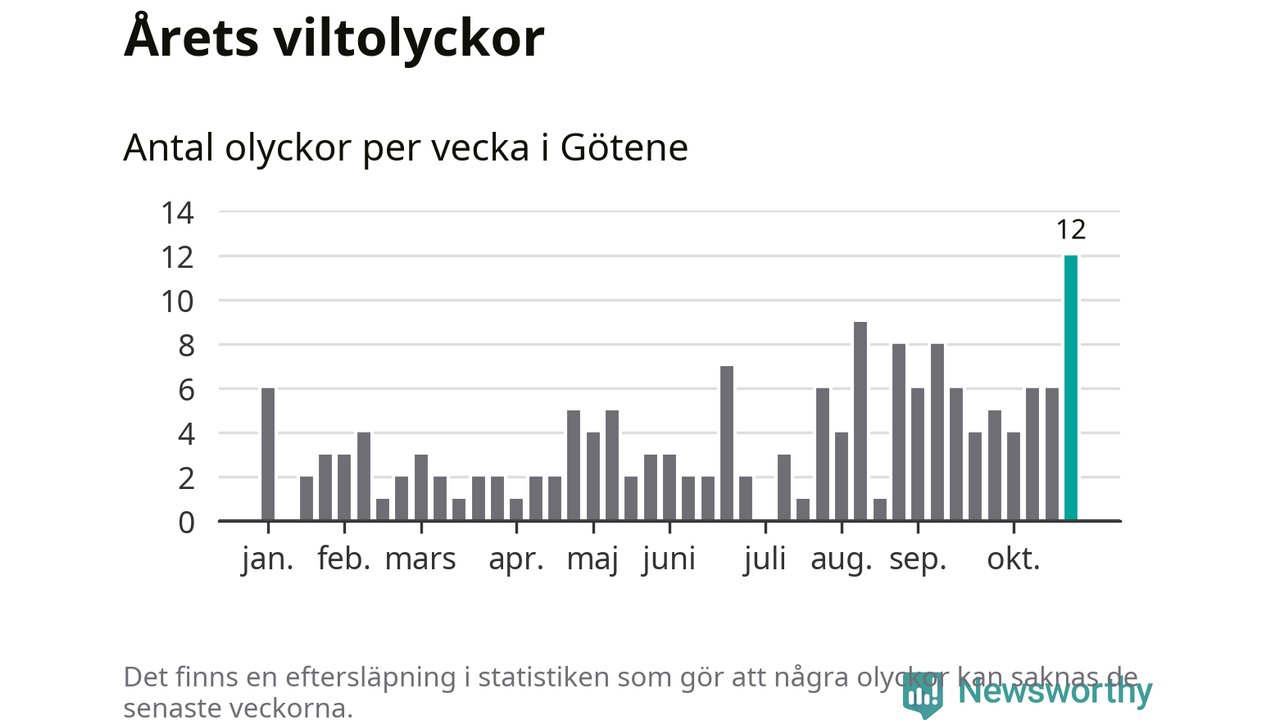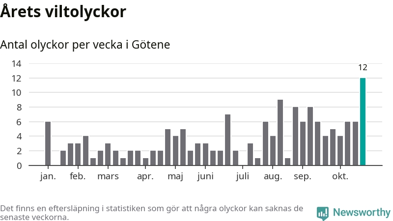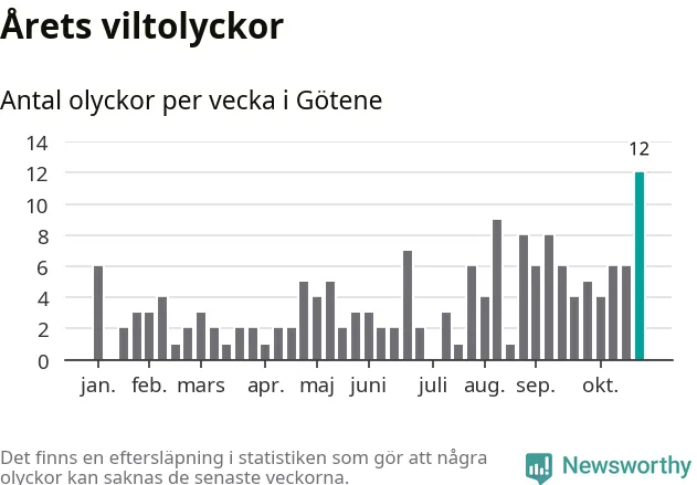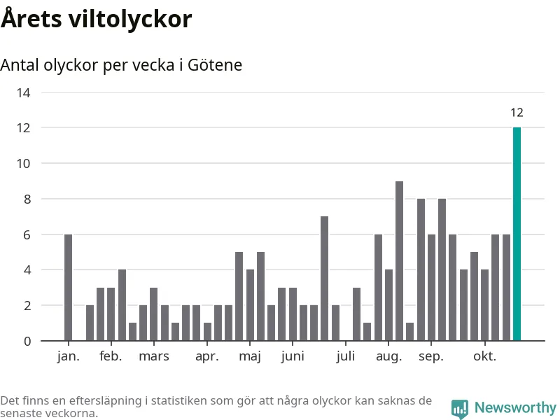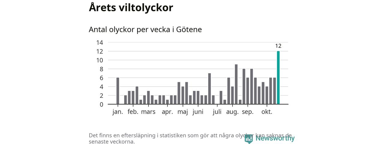 Under vecka 44 rapporterades tolv viltolyckor in i Götene kommun. Det är det största antalet på en enskild vecka hittills i år.