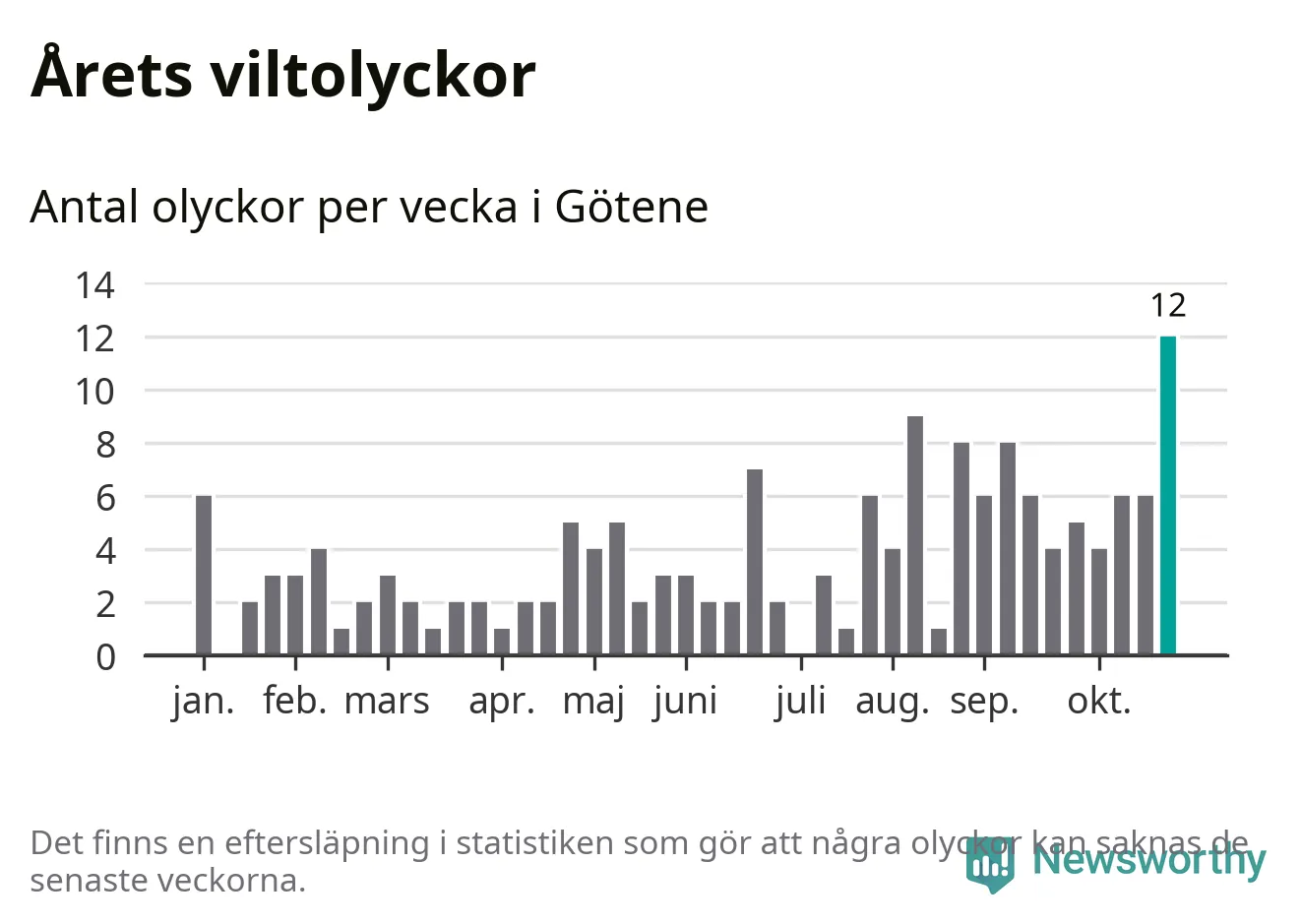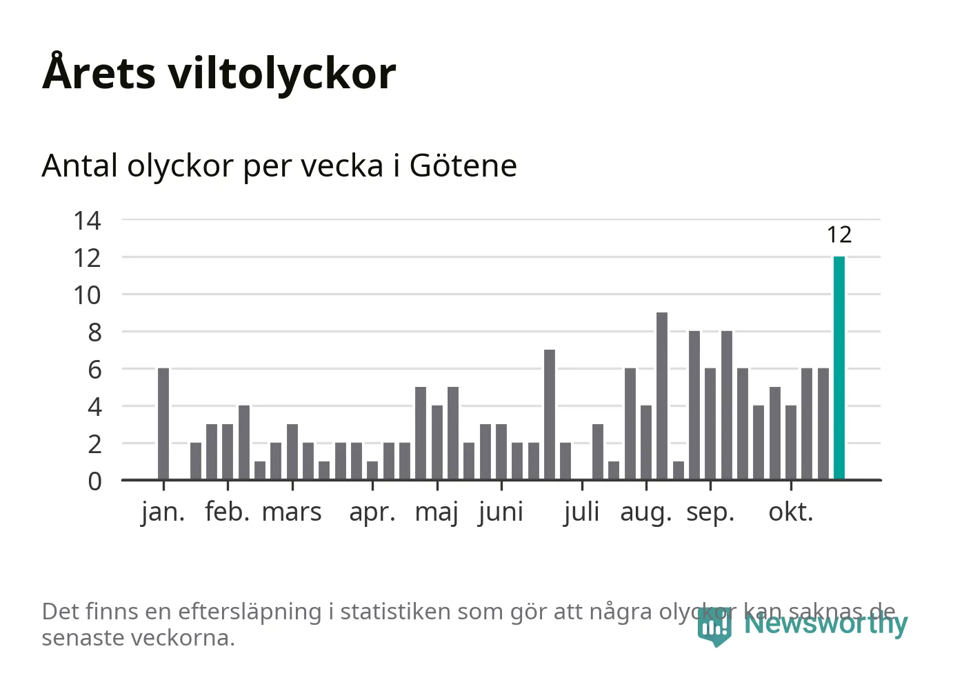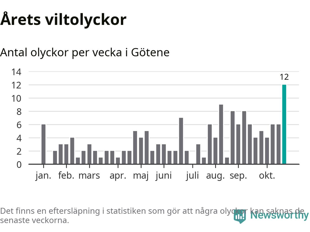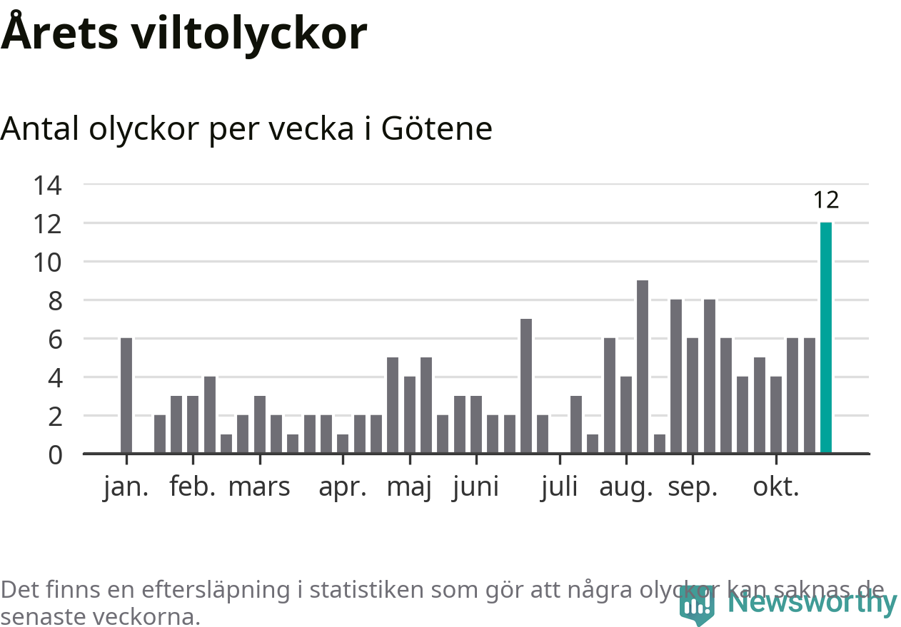 Under vecka 44 rapporterades tolv viltolyckor in i Götene kommun. Det är det största antalet på en enskild vecka hittills i år.