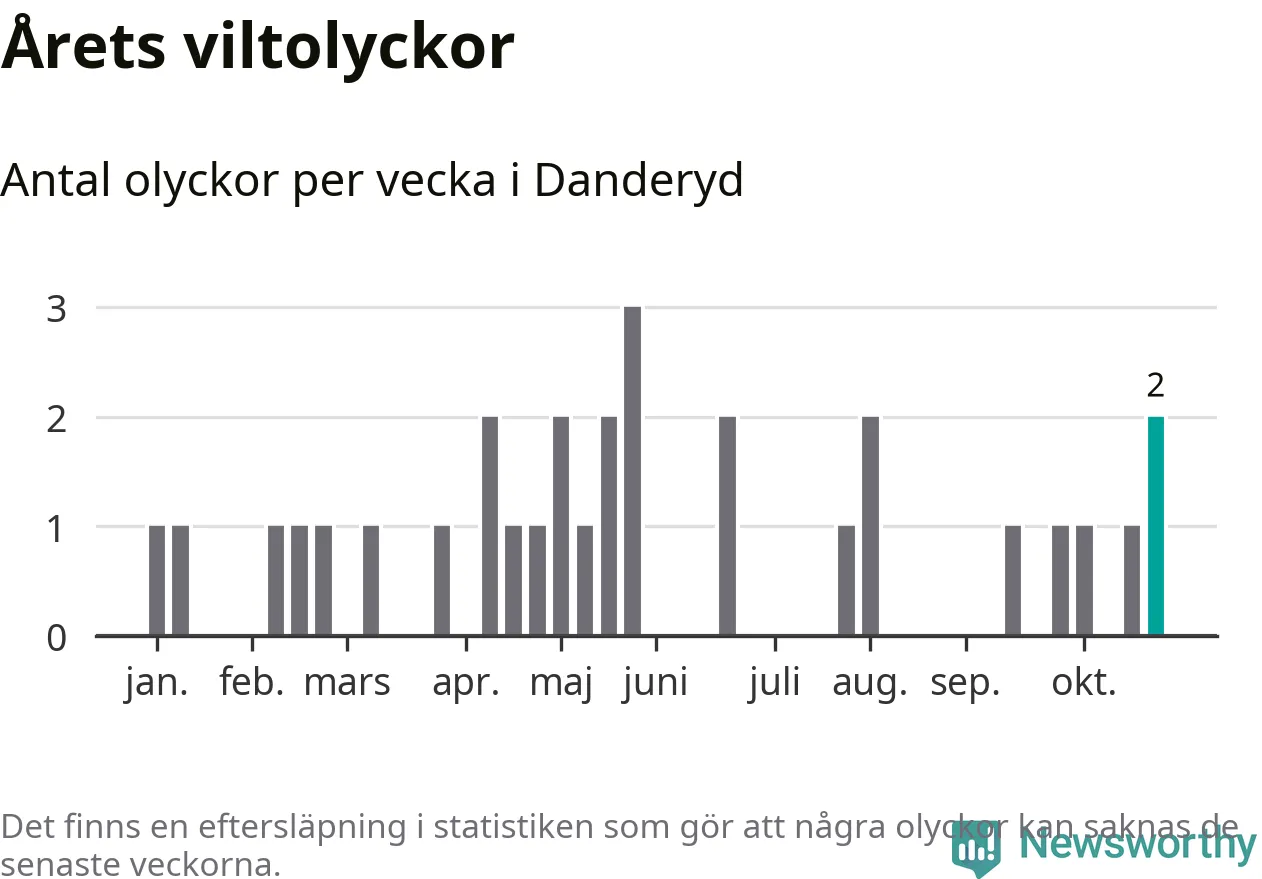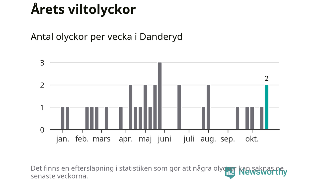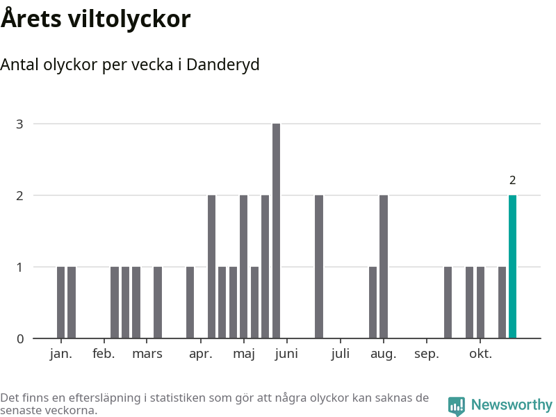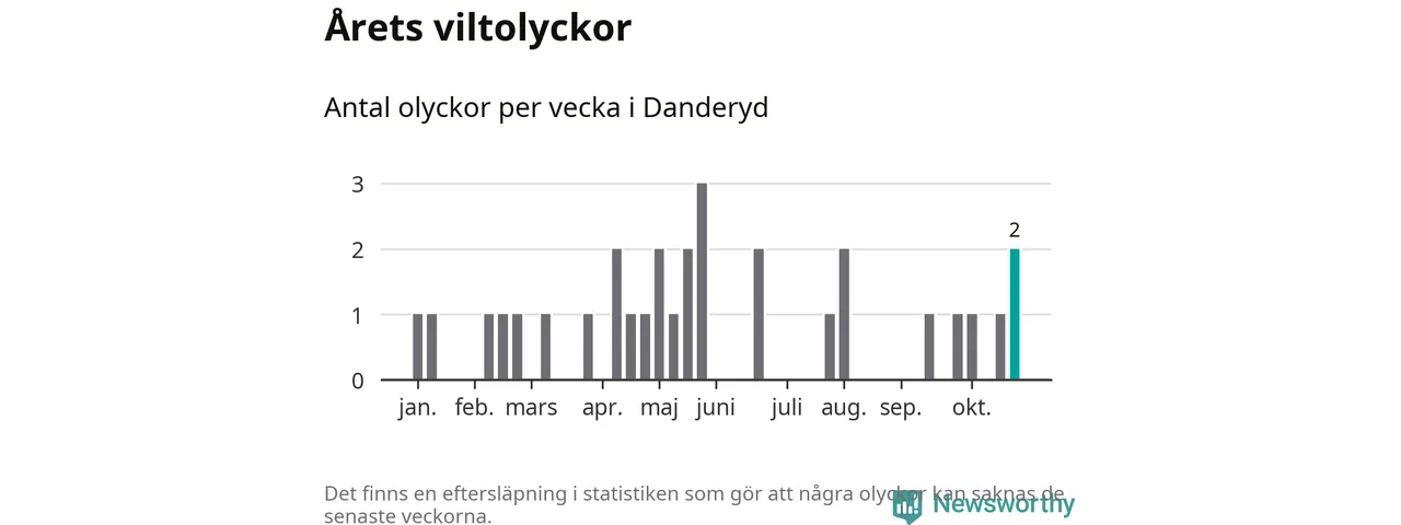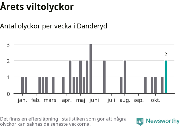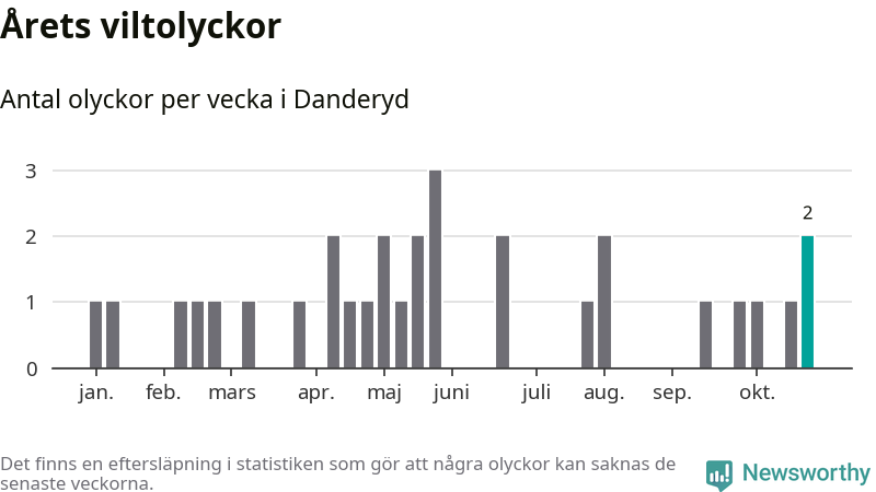 Totalt det här året har det inträffat 31 viltolyckor i kommunen. Det är mer än genomsnittet för motsvarande period (omkring 22) de senaste tio åren.