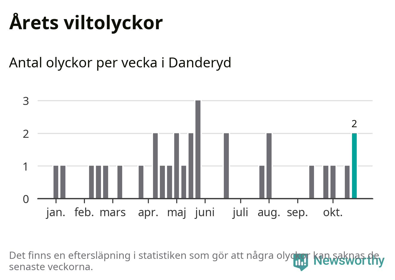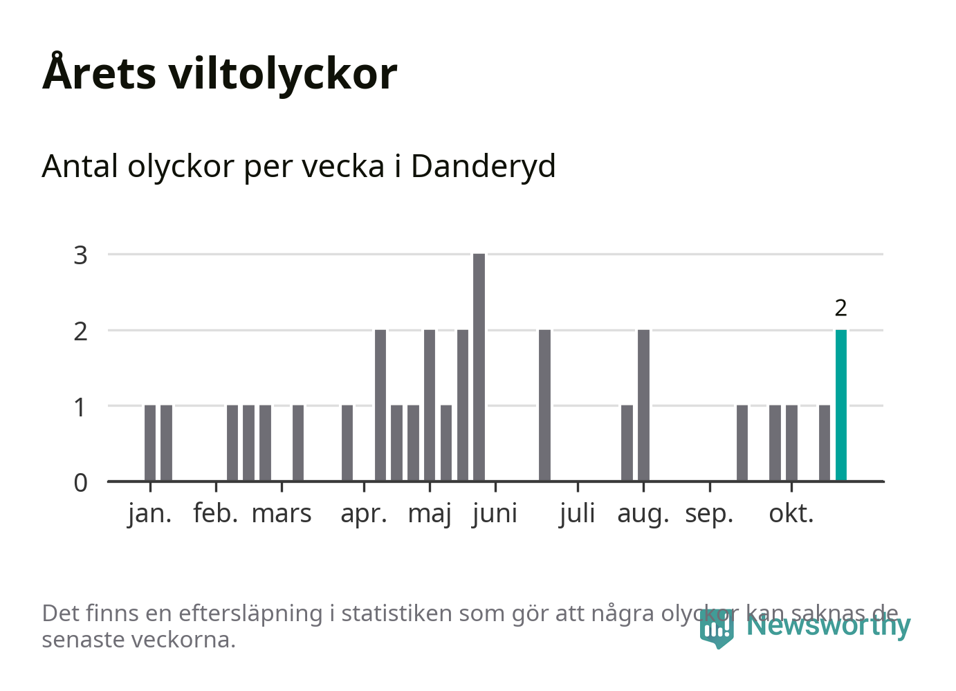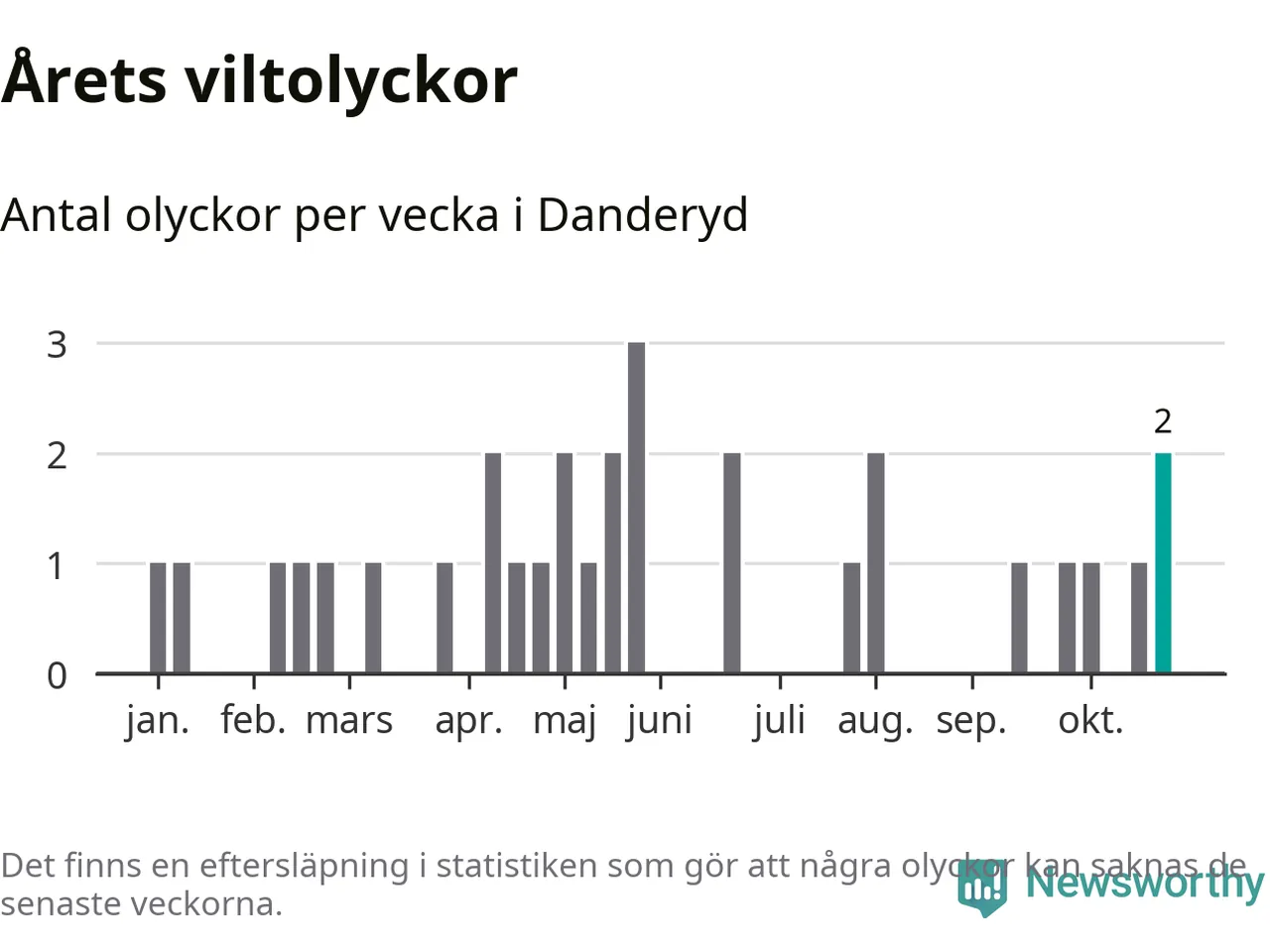 Totalt det här året har det inträffat 31 viltolyckor i kommunen. Det är mer än genomsnittet för motsvarande period (omkring 22) de senaste tio åren.