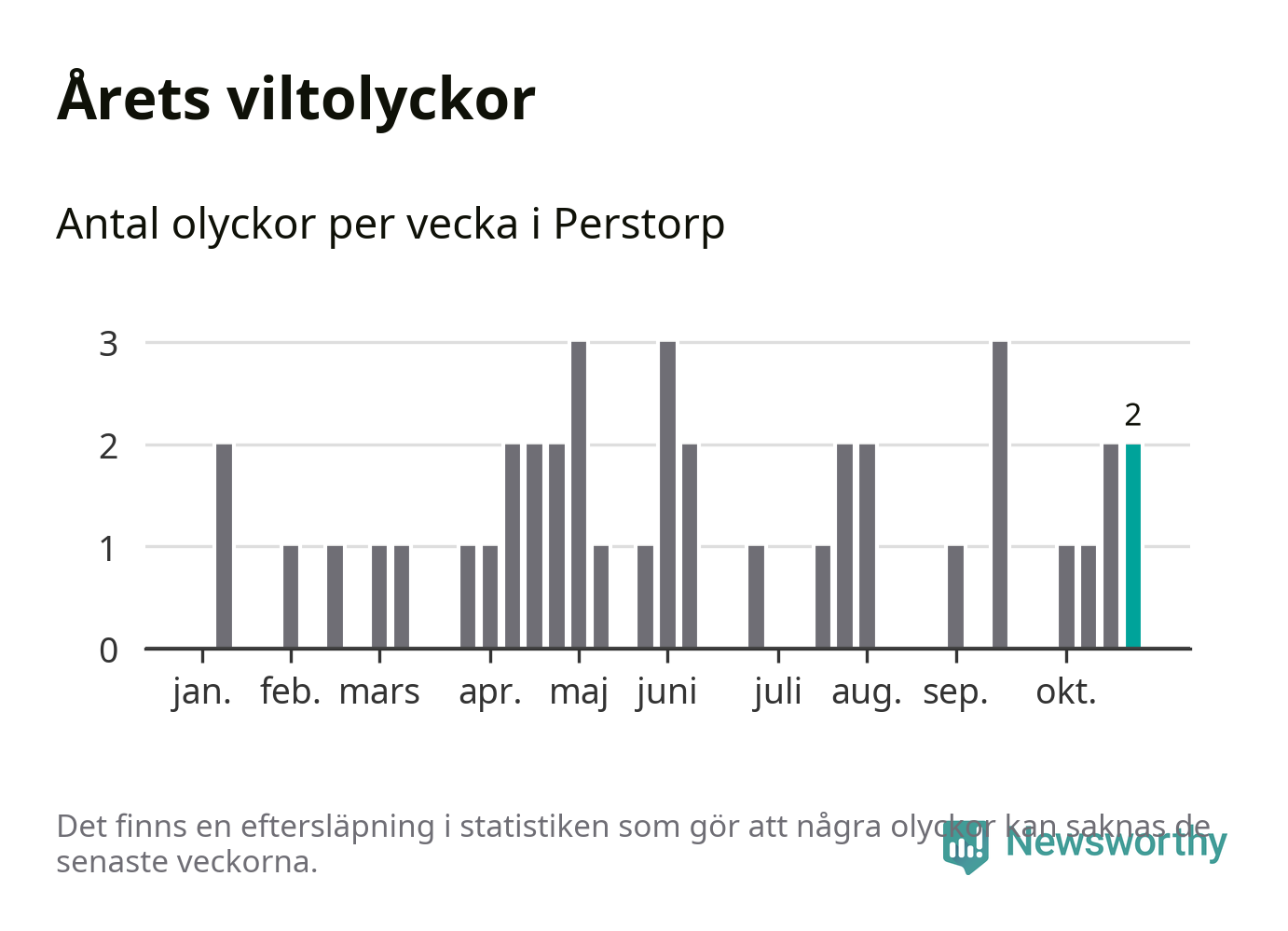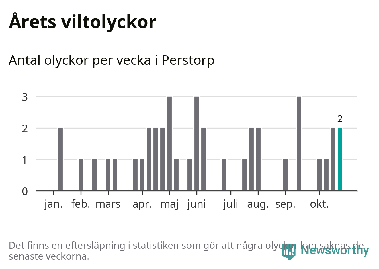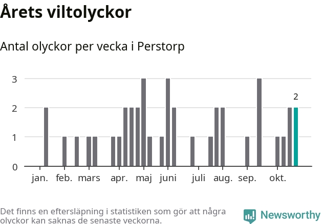 Hittills har två viltolyckor rapporterats in i Perstorps kommun från vecka 44. Se listan här.