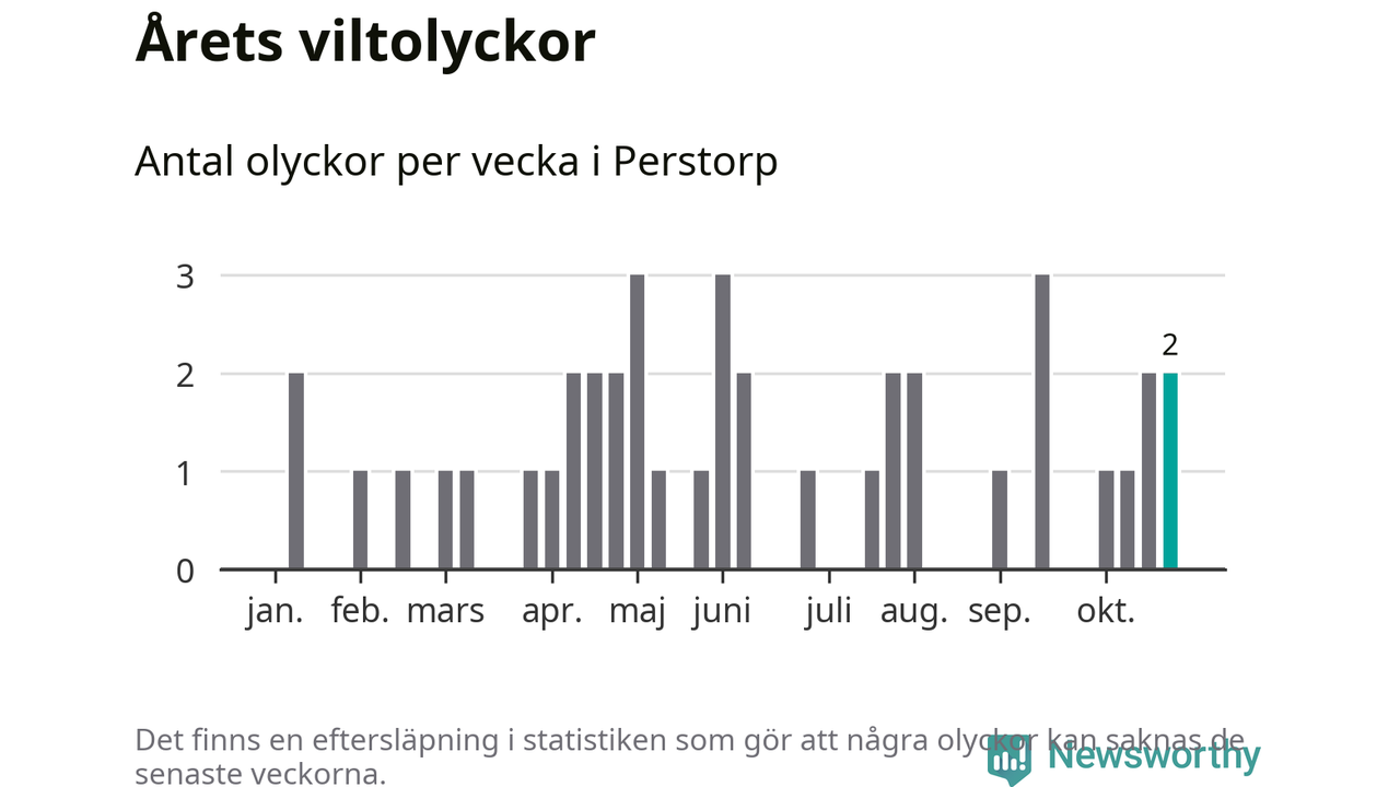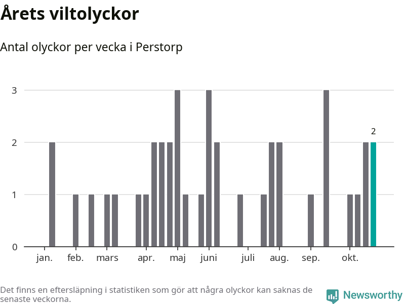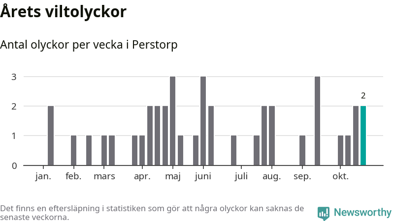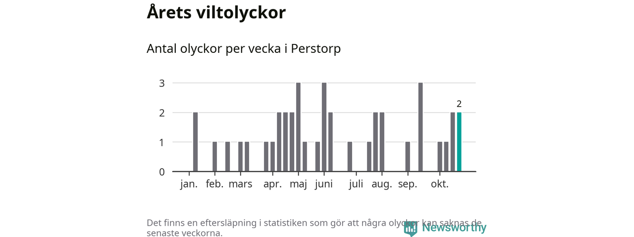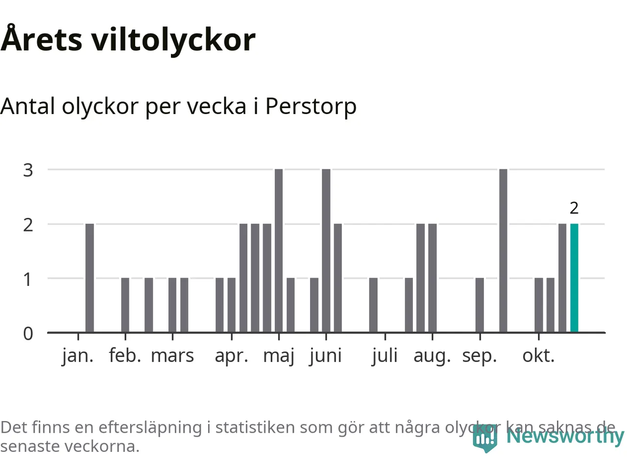 Hittills har två viltolyckor rapporterats in i Perstorps kommun från vecka 44. Se listan här.