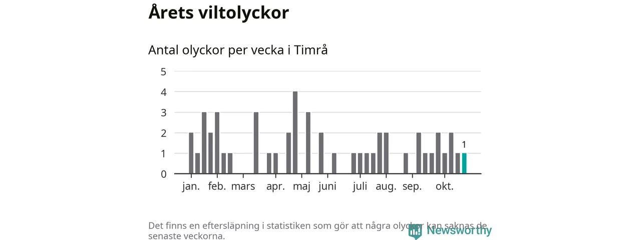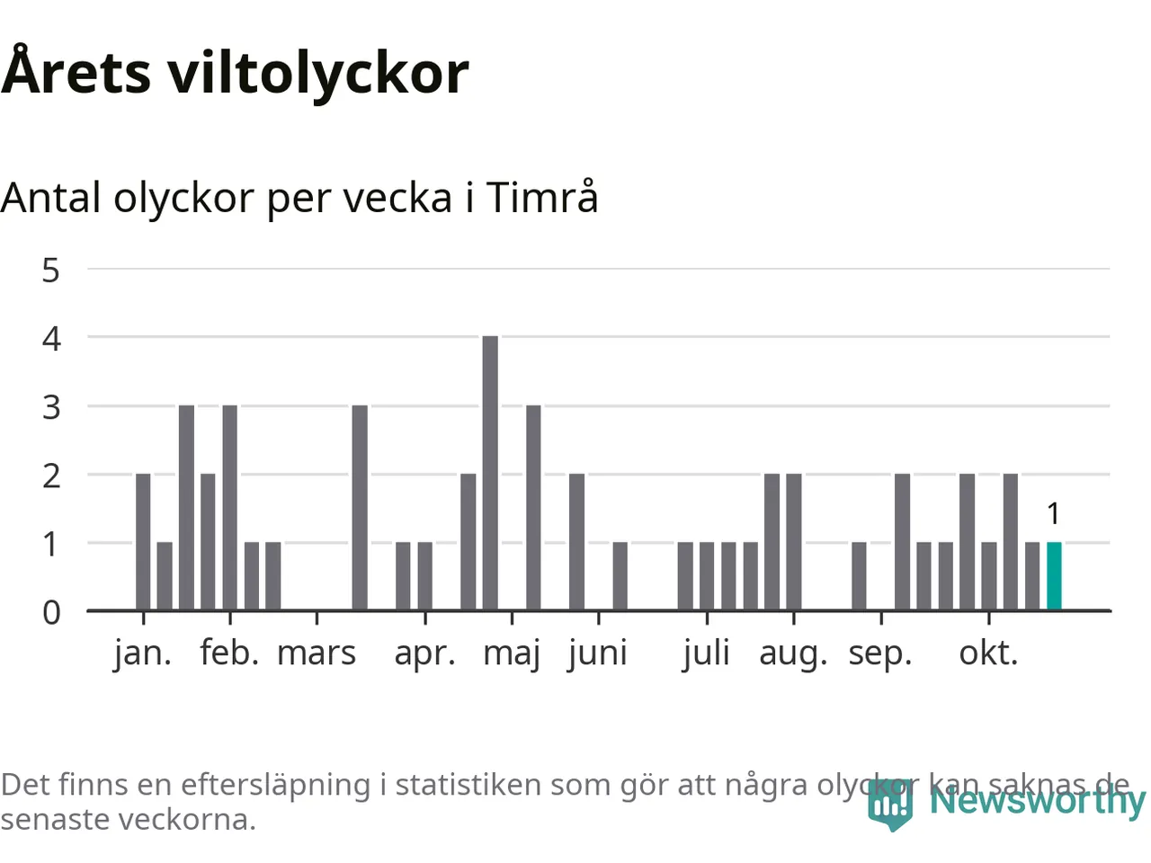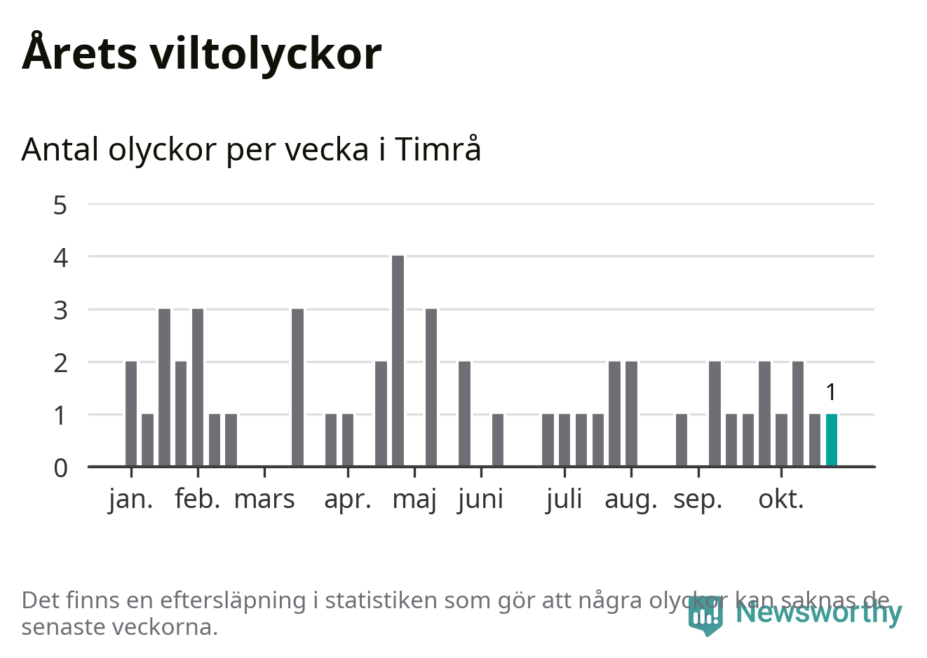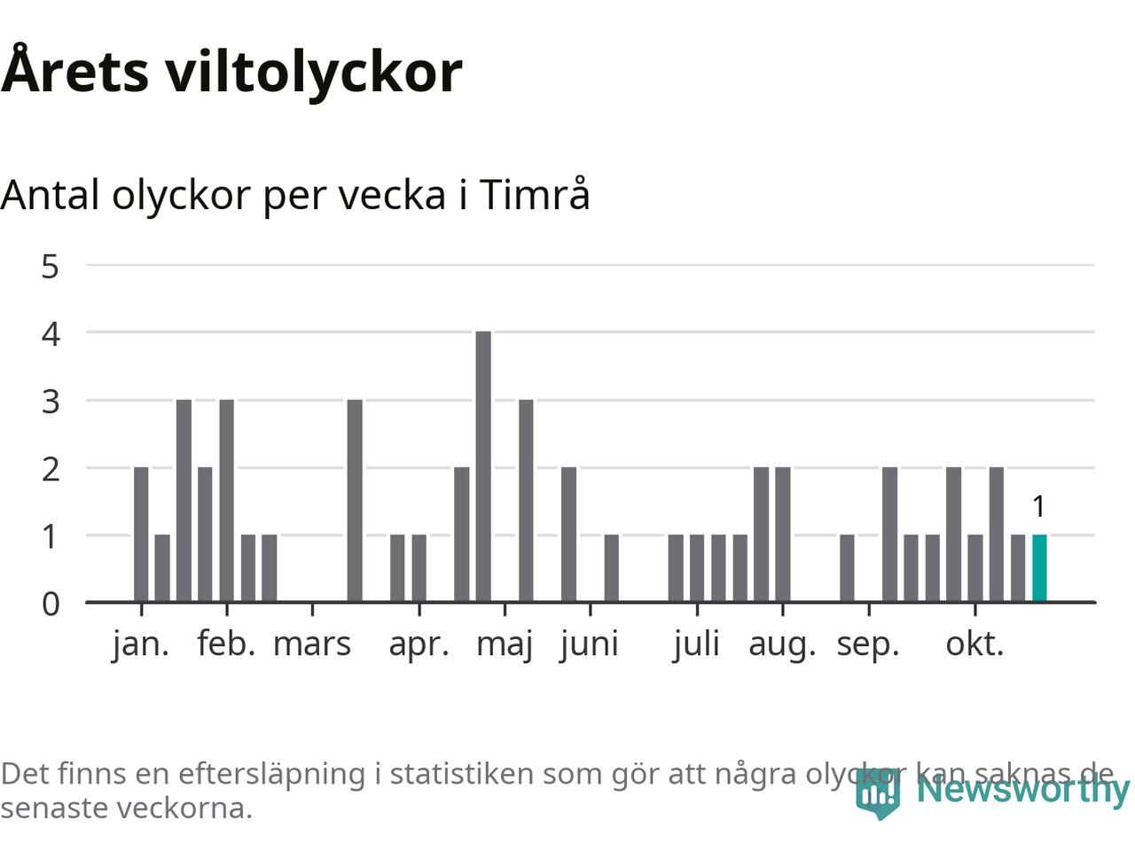 Från förra veckan (vecka 44) har hittills en viltolycka rapporterats in i Timrå kommun.