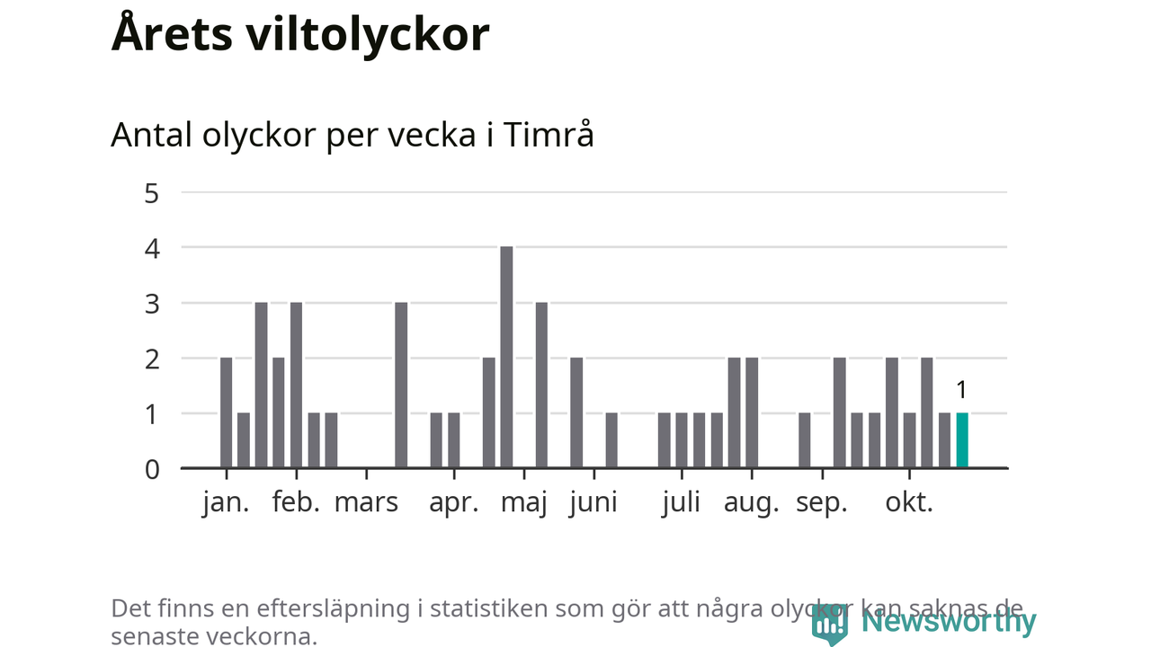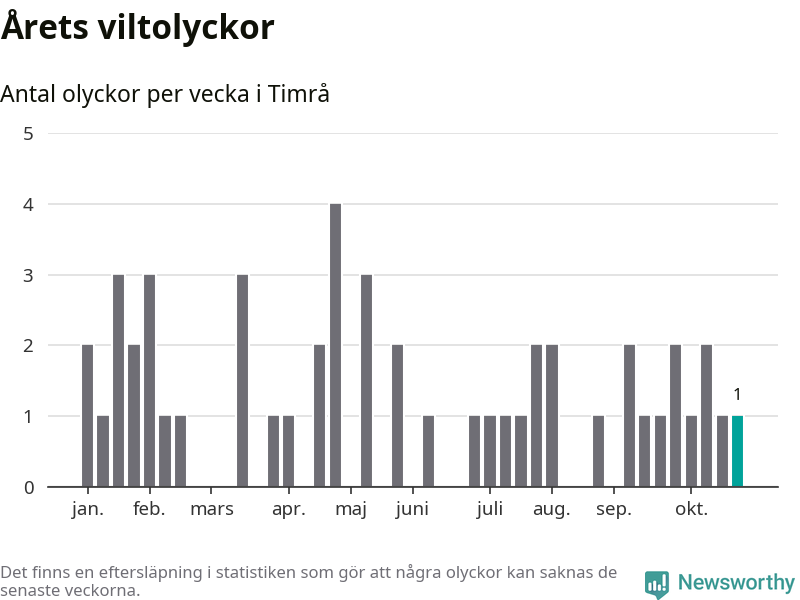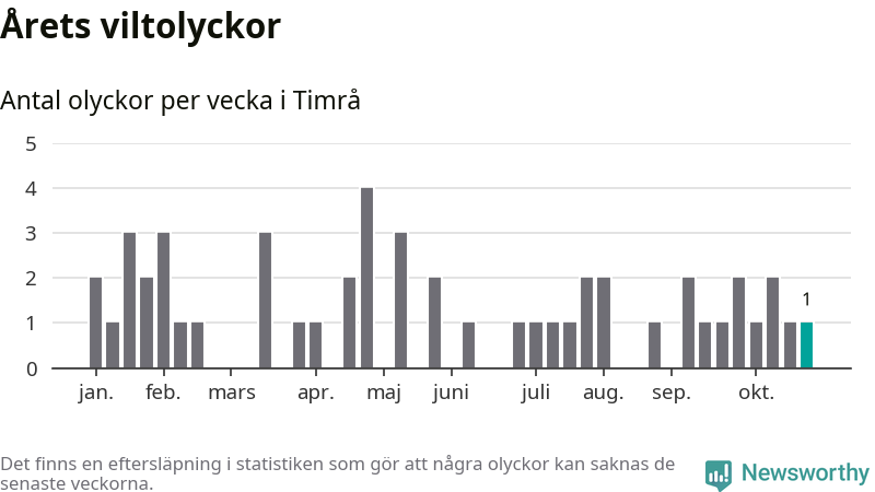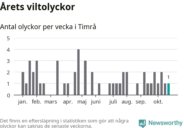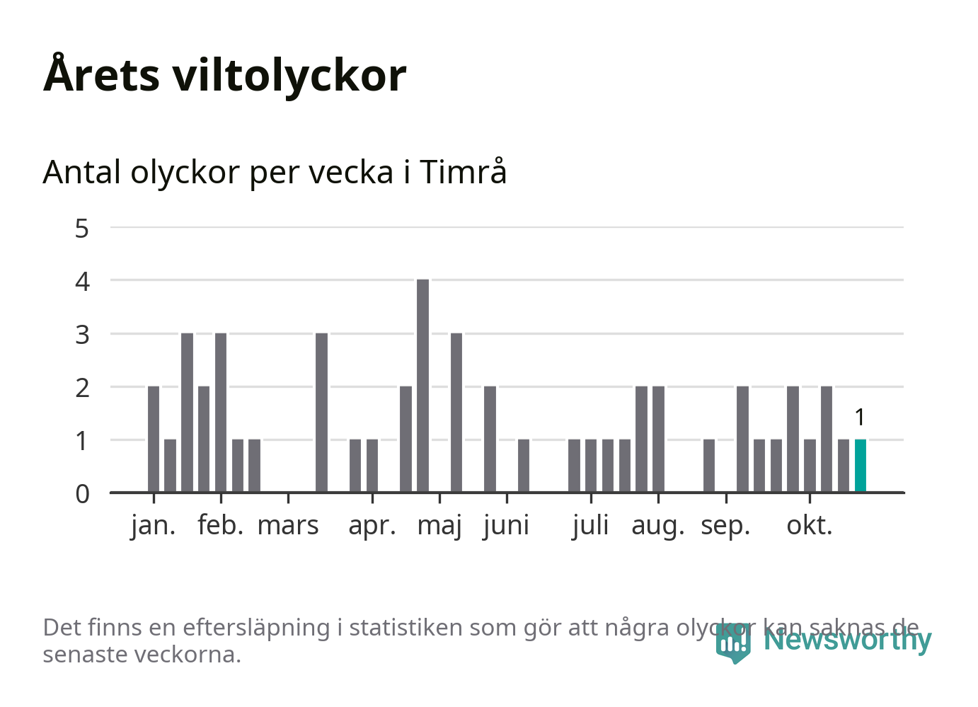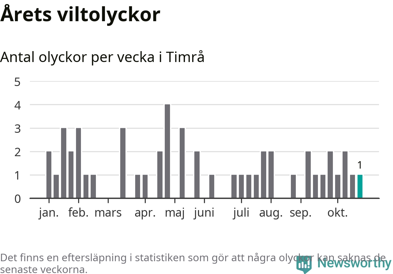 Från förra veckan (vecka 44) har hittills en viltolycka rapporterats in i Timrå kommun.