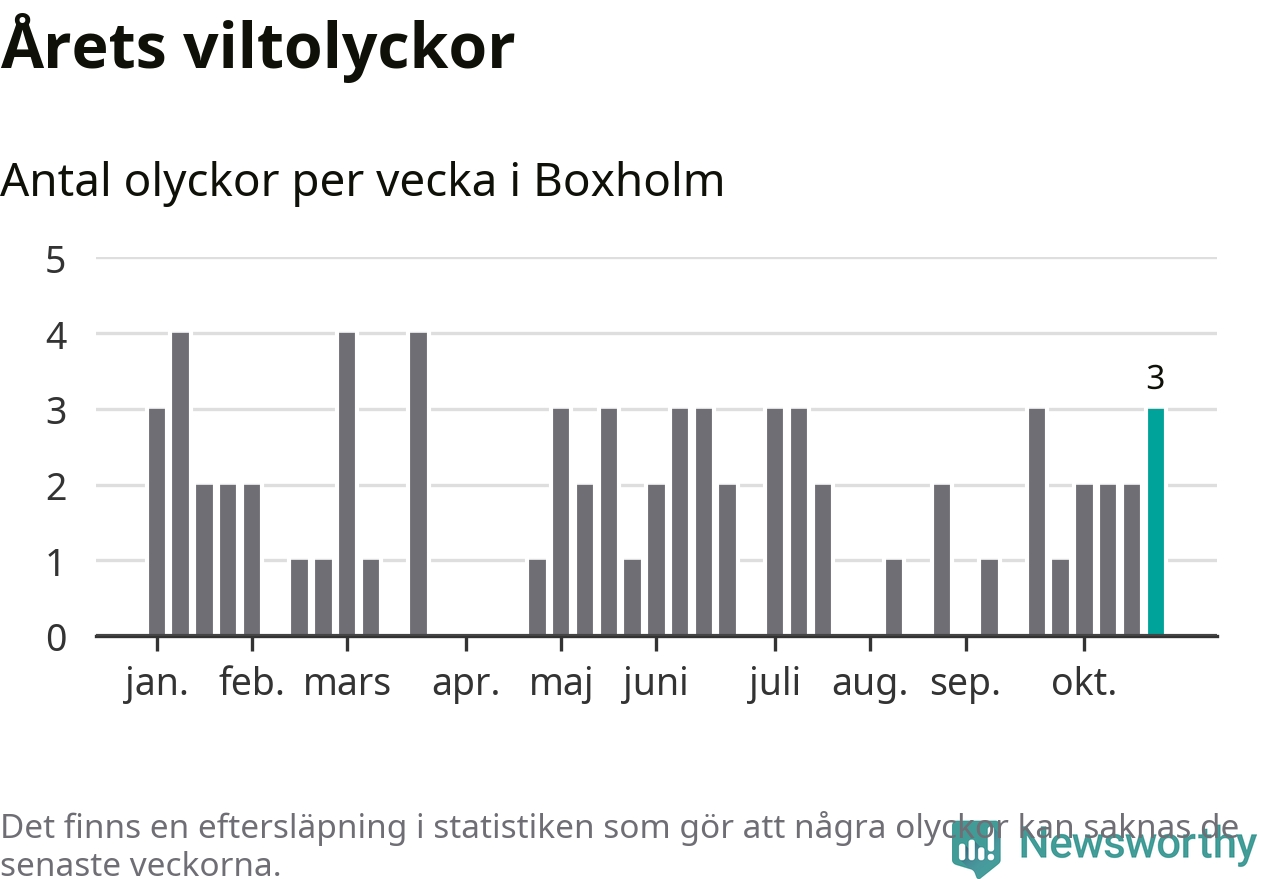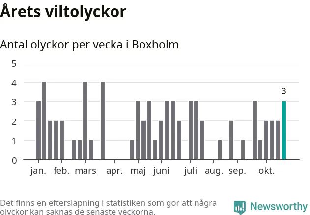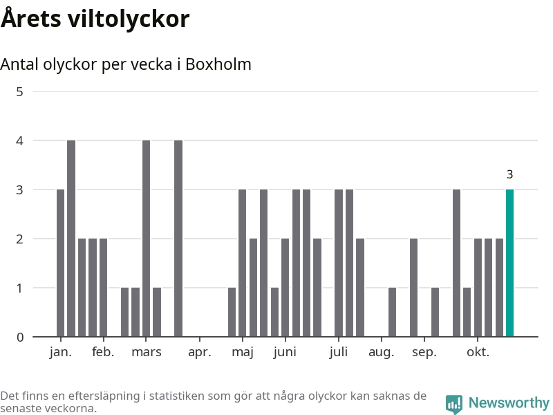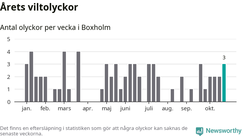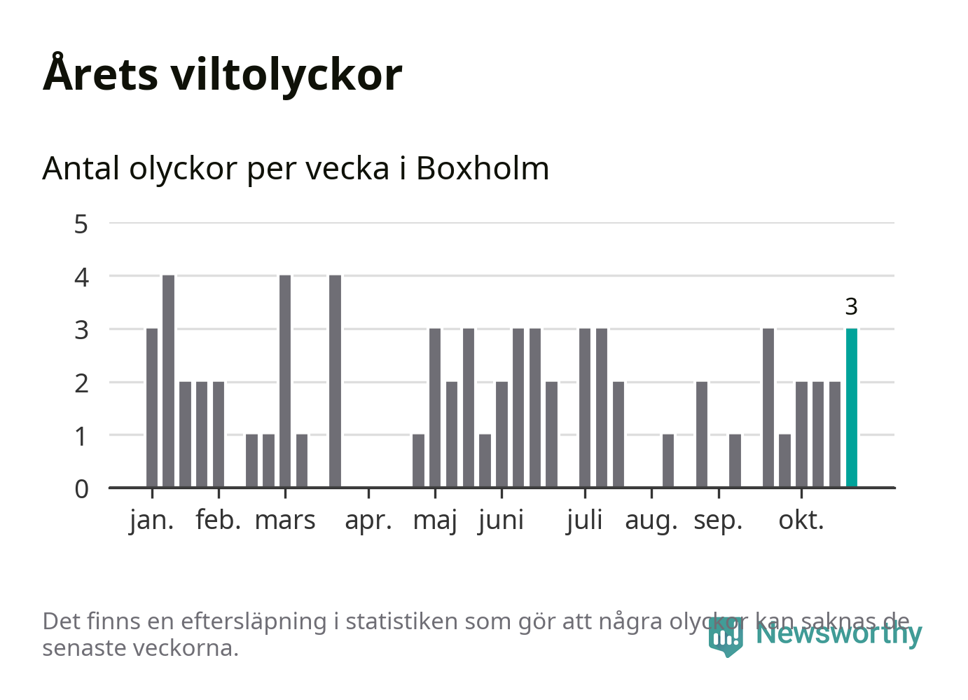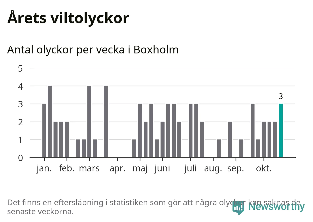 Hittills har tre viltolyckor rapporterats in i Boxholms kommun från vecka 44. Se listan här.