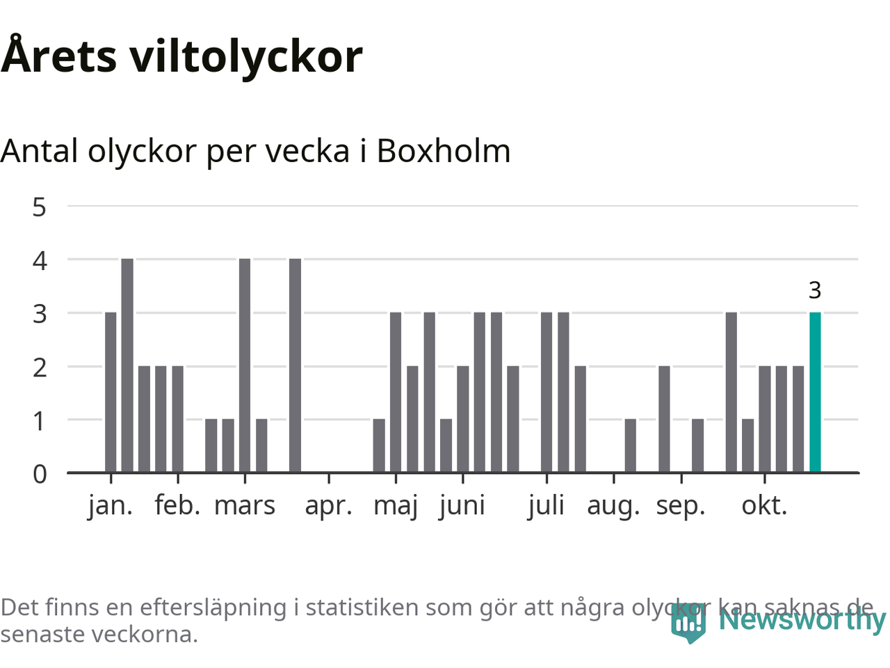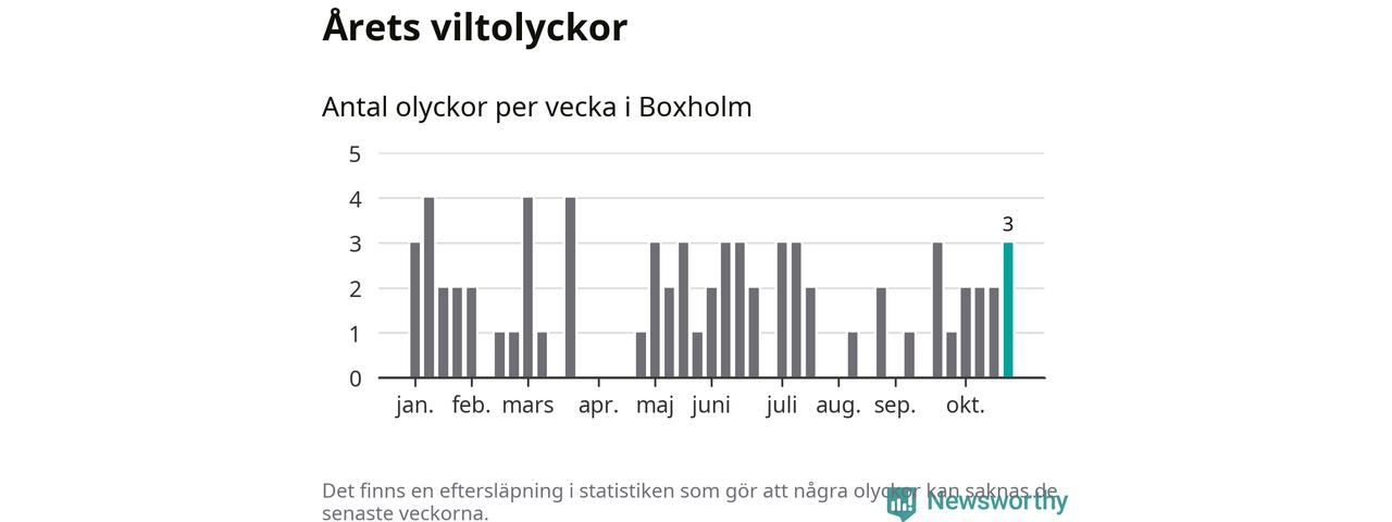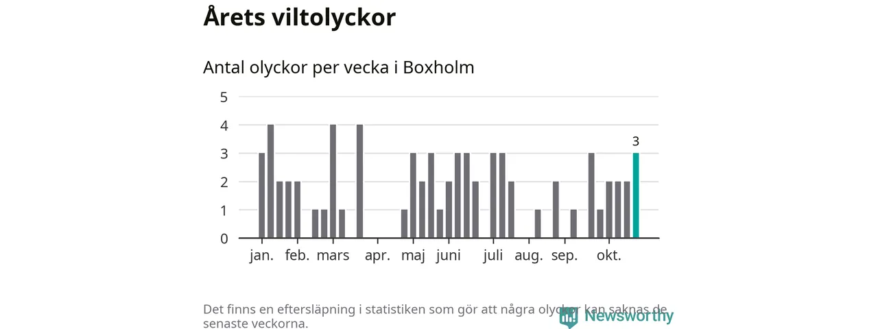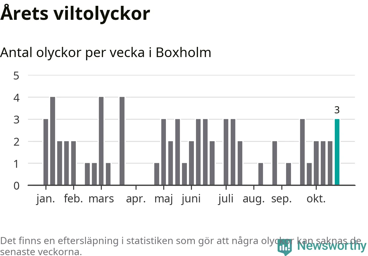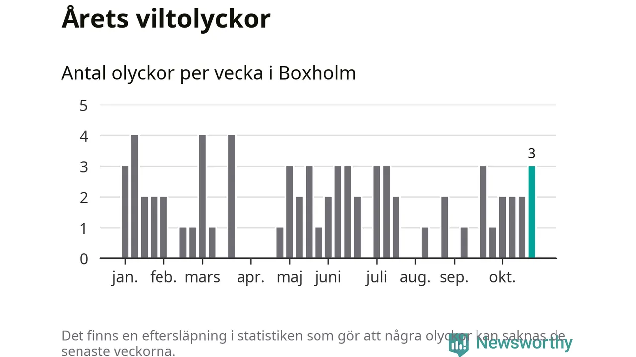 Hittills har tre viltolyckor rapporterats in i Boxholms kommun från vecka 44. Se listan här.