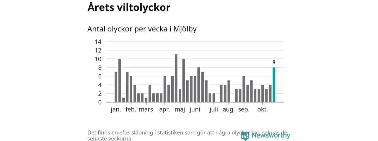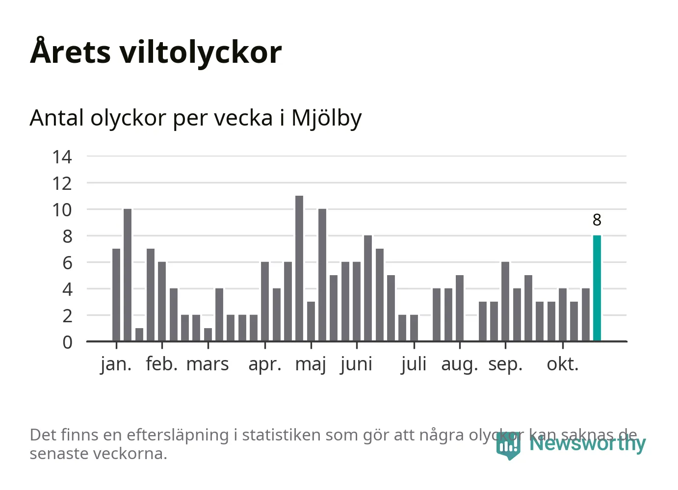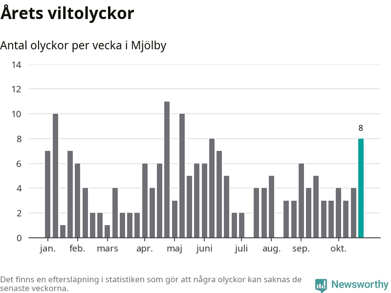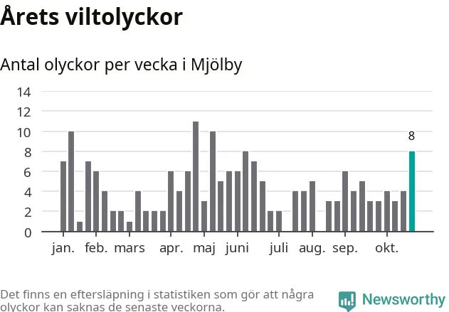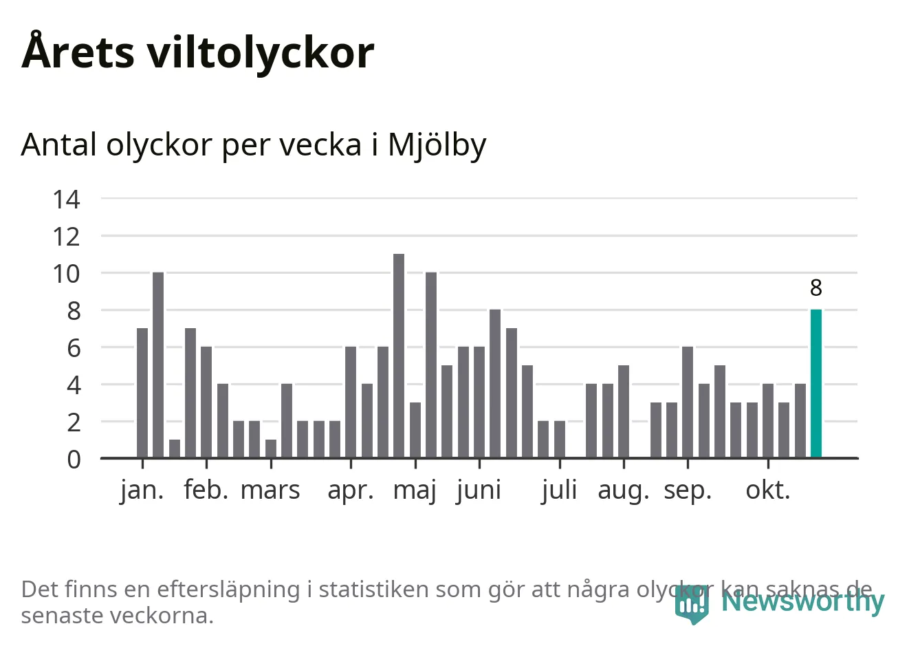 Hittills har åtta viltolyckor rapporterats in i Mjölby kommun från vecka 44. Se listan här.
