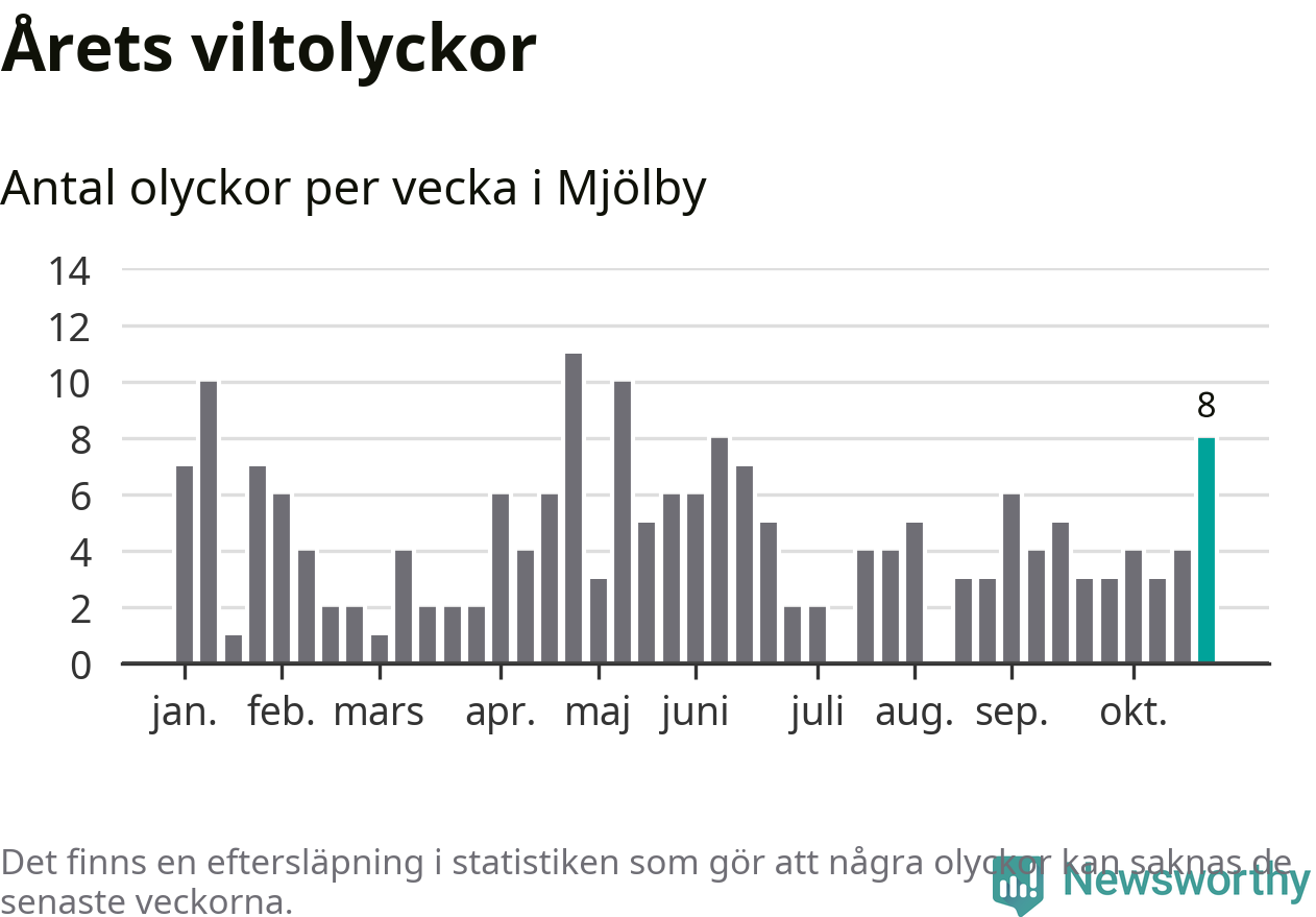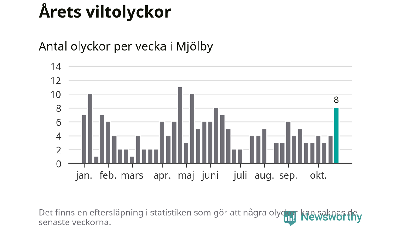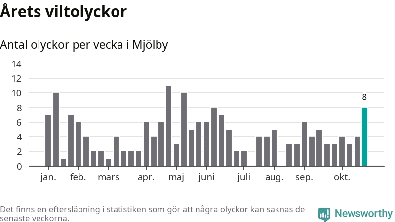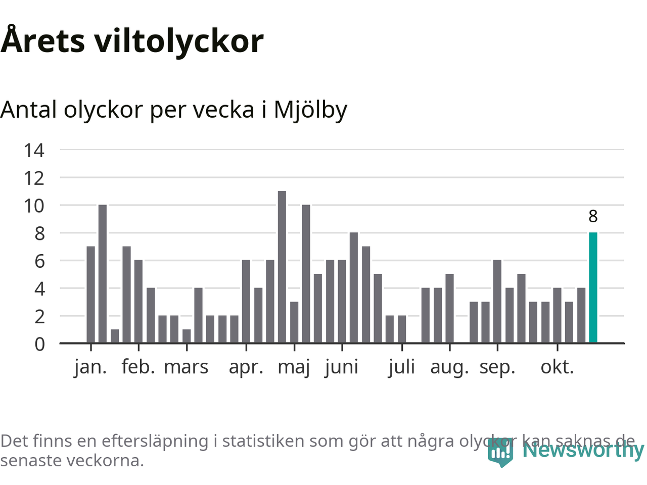 Hittills har åtta viltolyckor rapporterats in i Mjölby kommun från vecka 44. Se listan här.