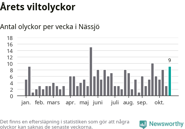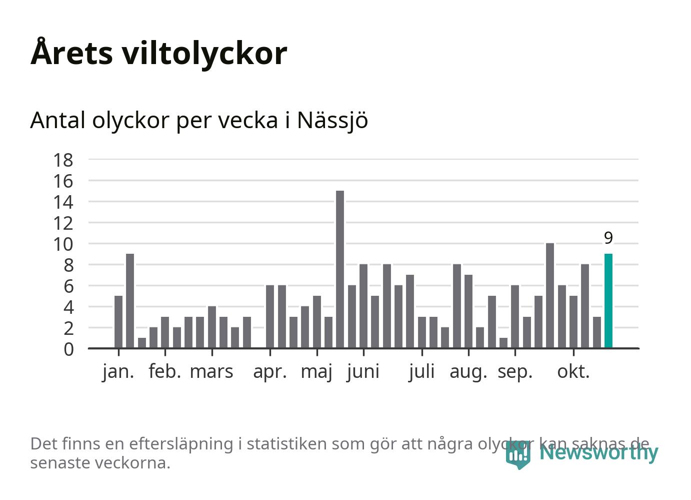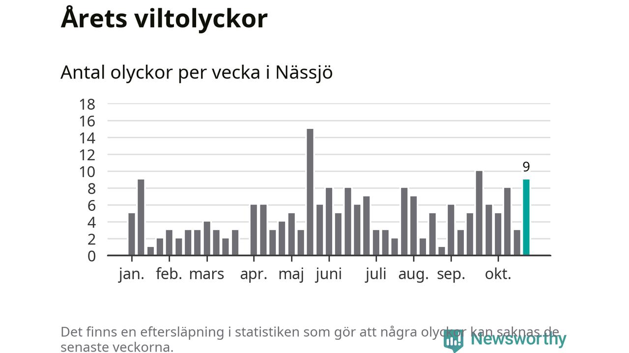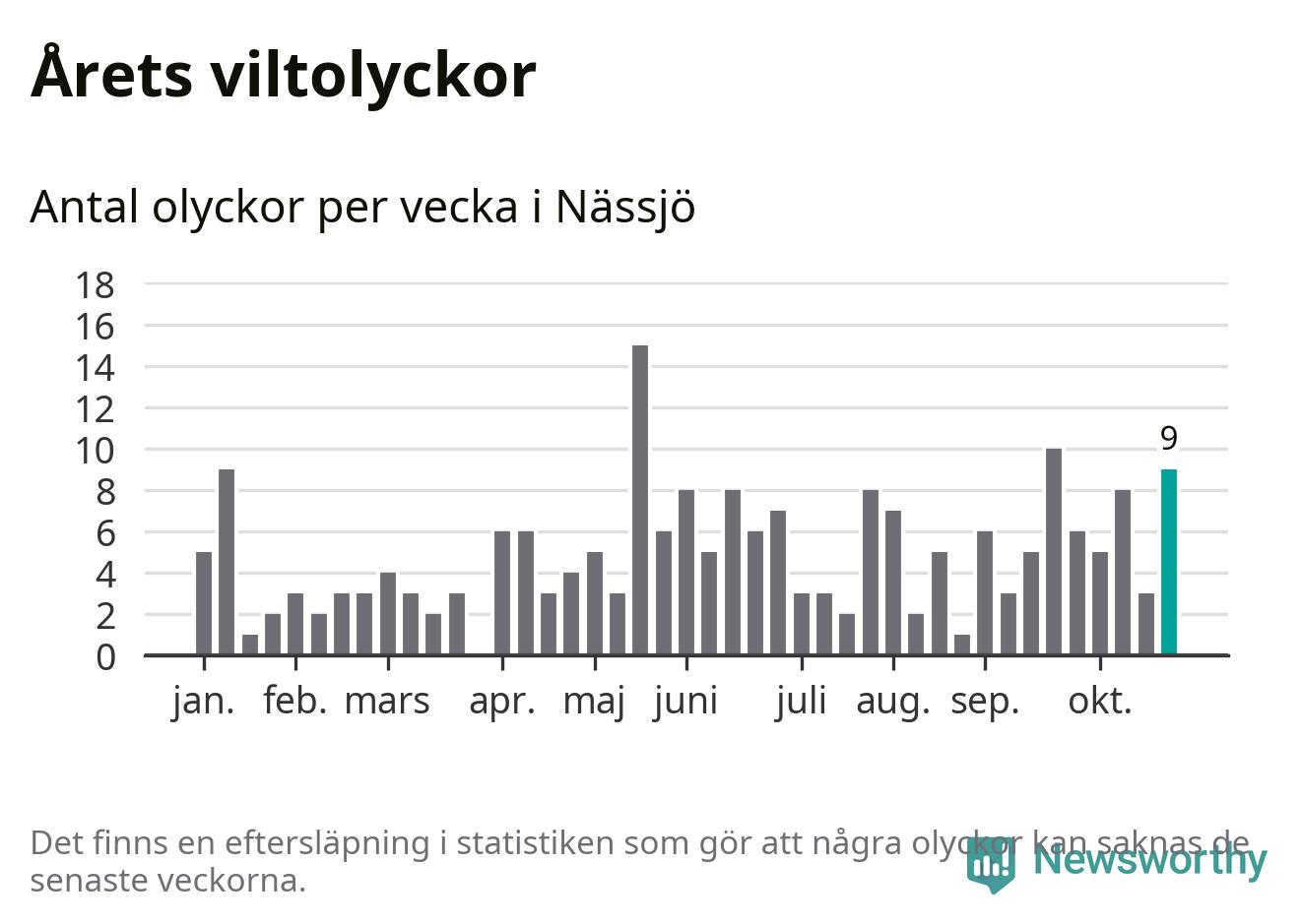 Hittills har nio viltolyckor rapporterats in i Nässjö kommun från vecka 44. Se listan här.
