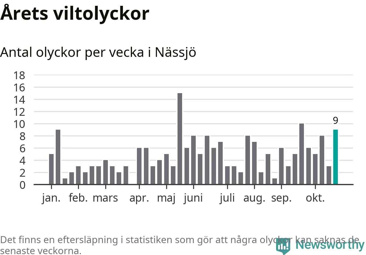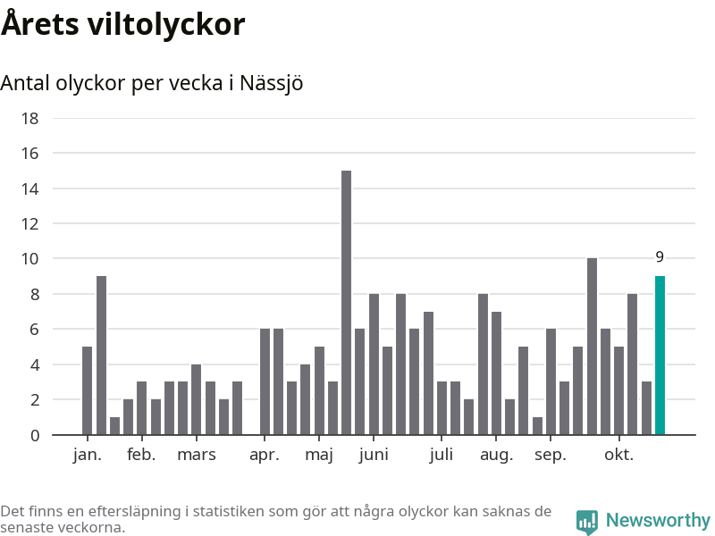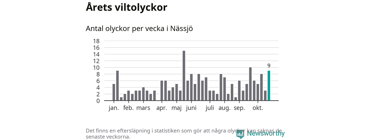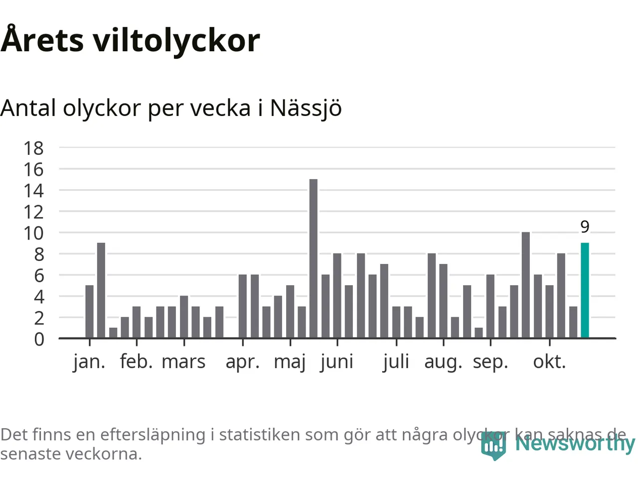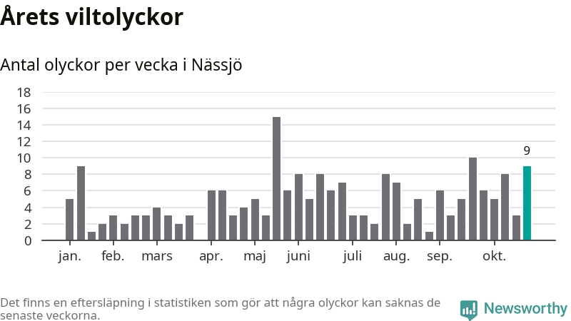 Hittills har nio viltolyckor rapporterats in i Nässjö kommun från vecka 44. Se listan här.