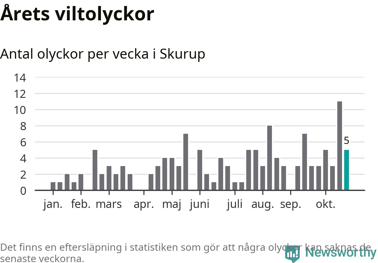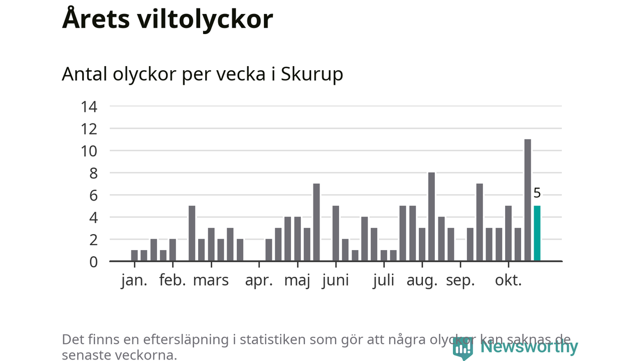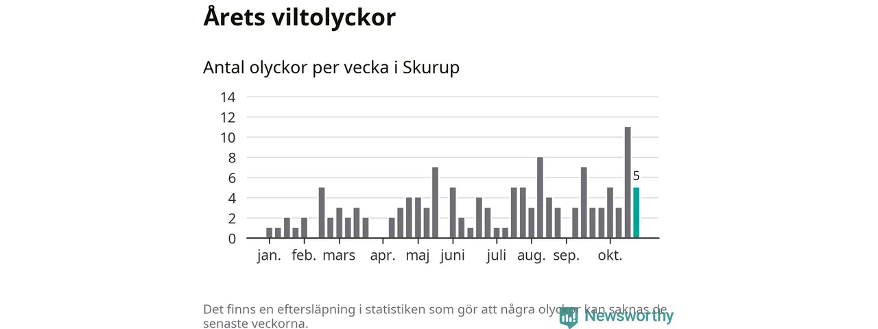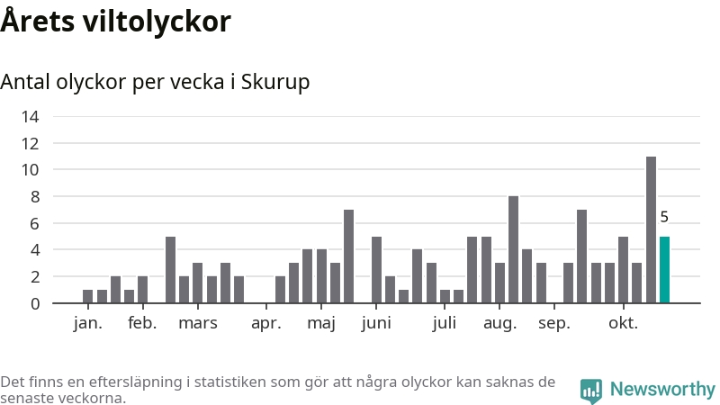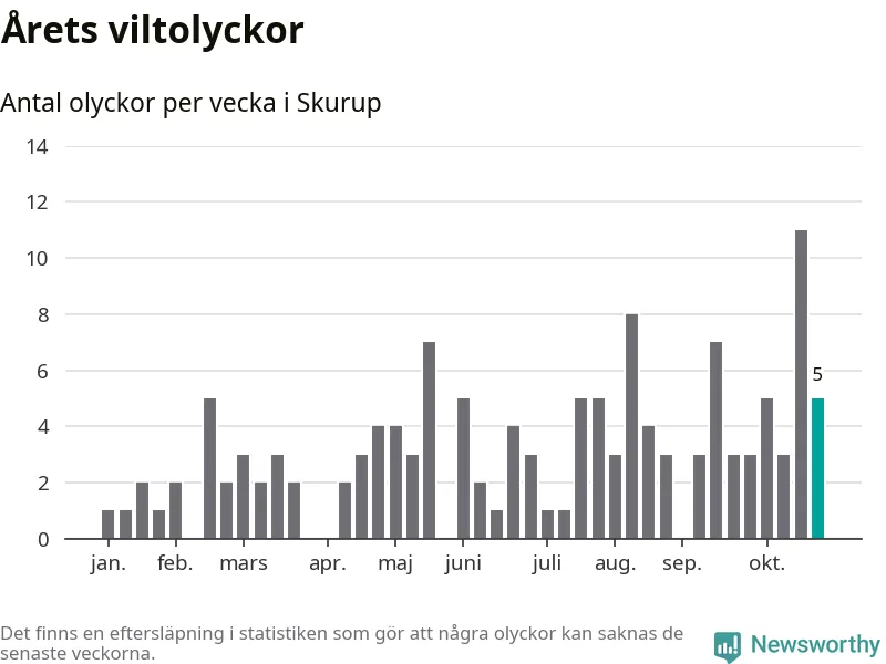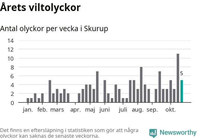 Hittills har fem viltolyckor rapporterats in i Skurups kommun från vecka 44. Se listan här.