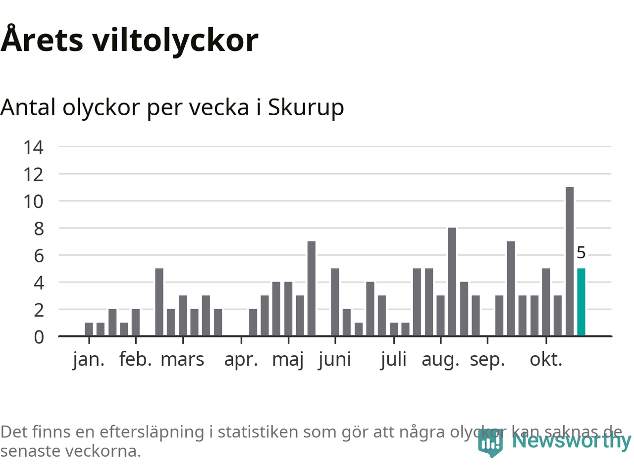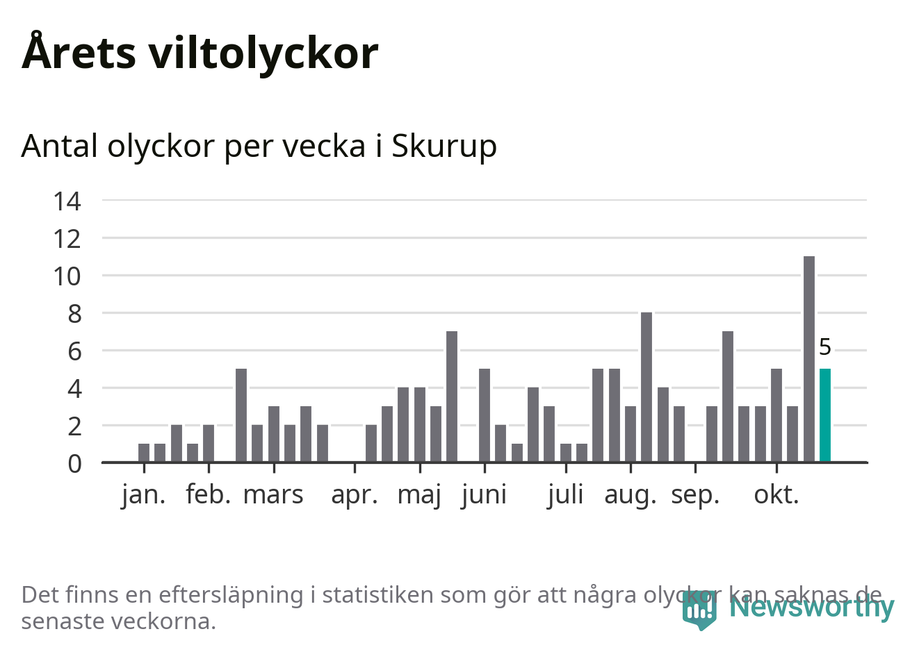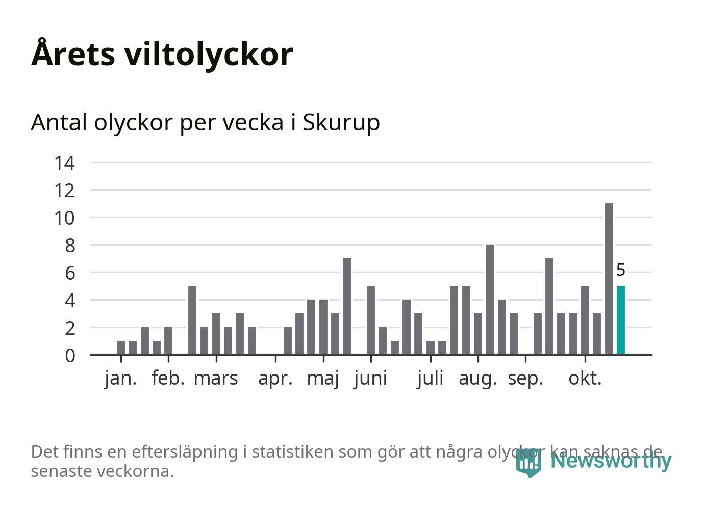 Hittills har fem viltolyckor rapporterats in i Skurups kommun från vecka 44. Se listan här.