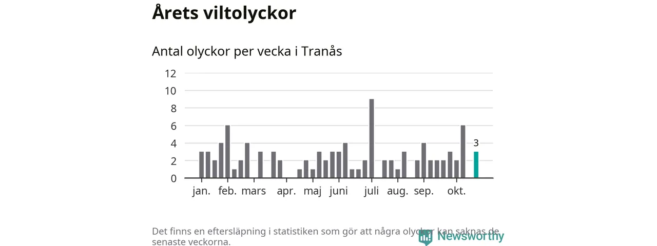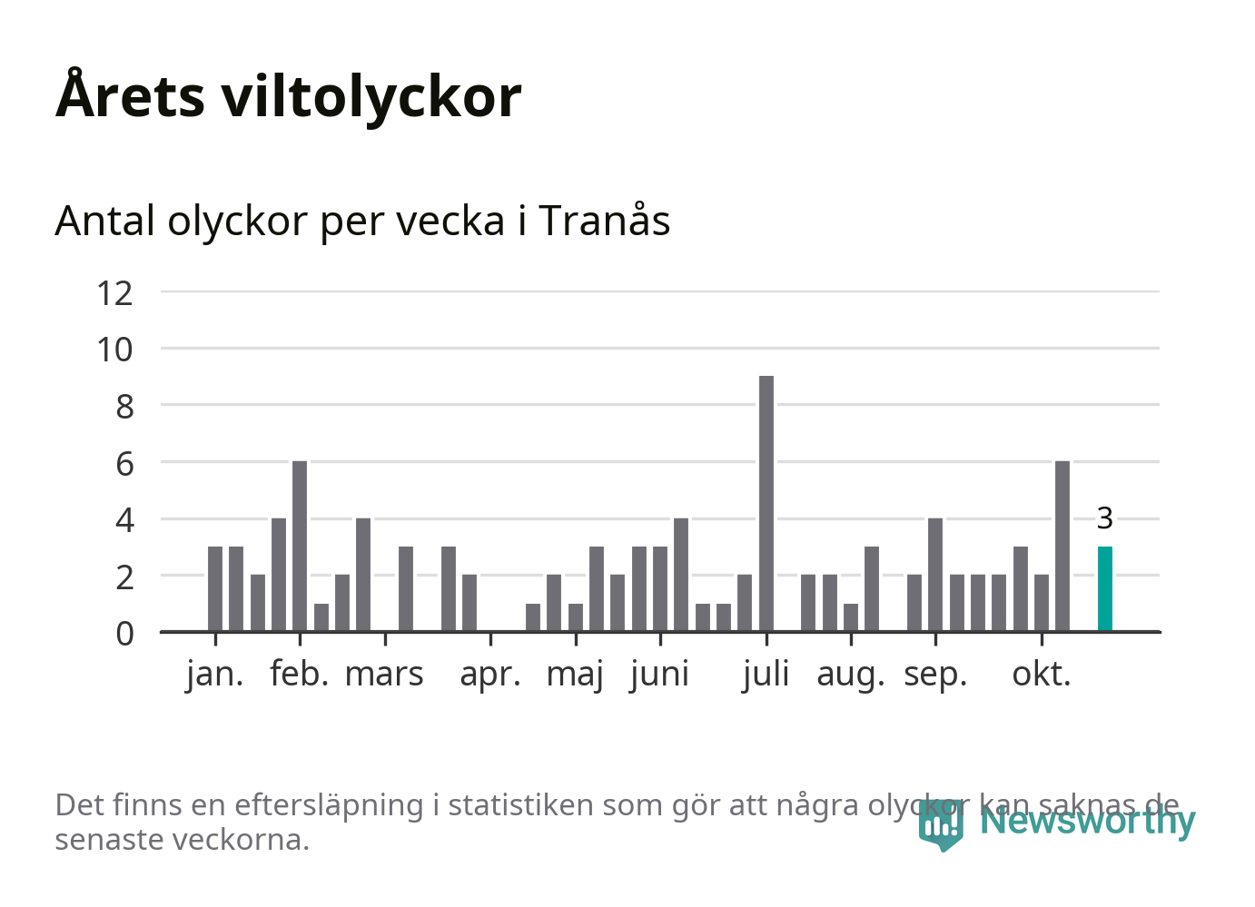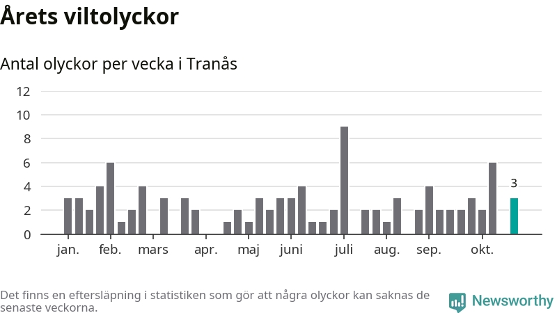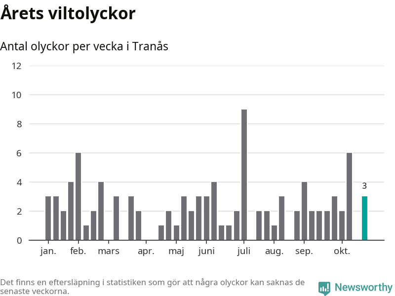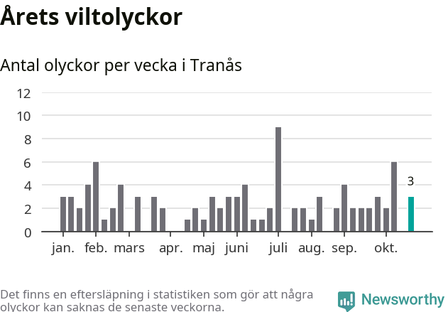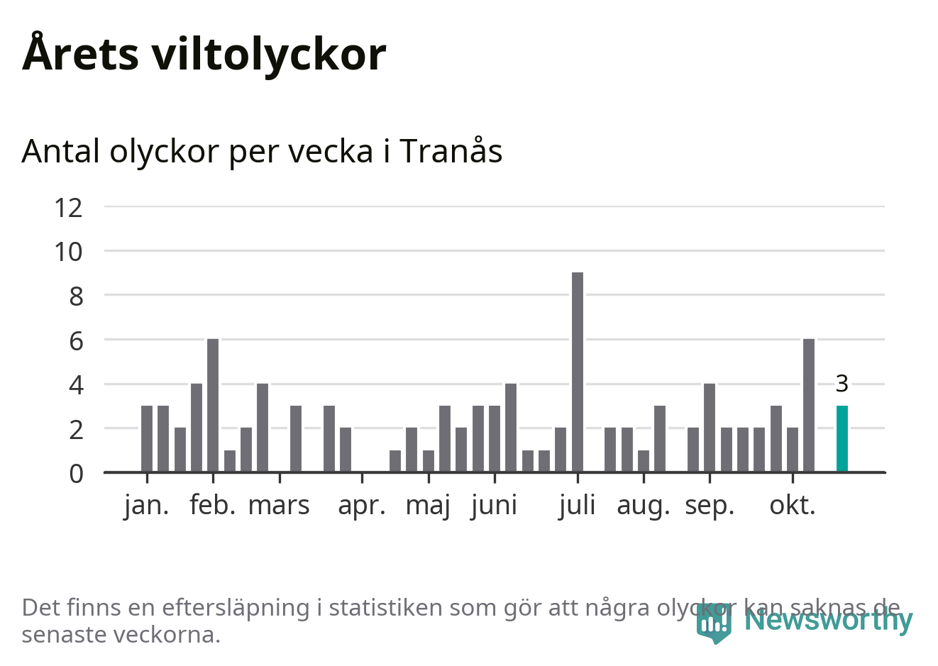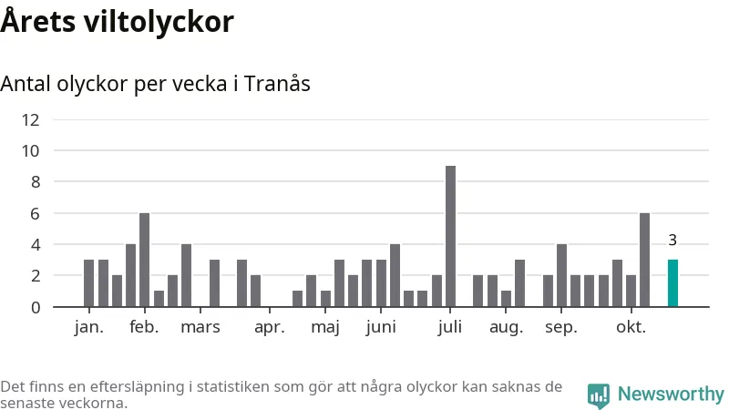 Hittills har tre viltolyckor rapporterats in i Tranås kommun från vecka 44. Se listan här.