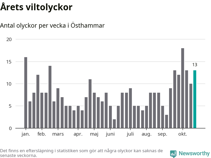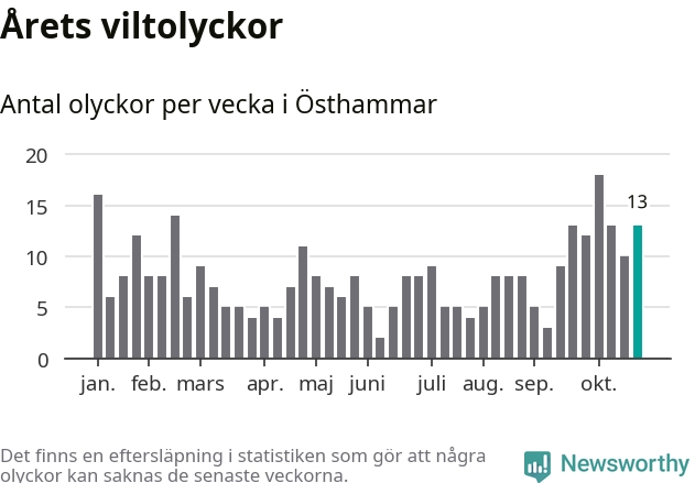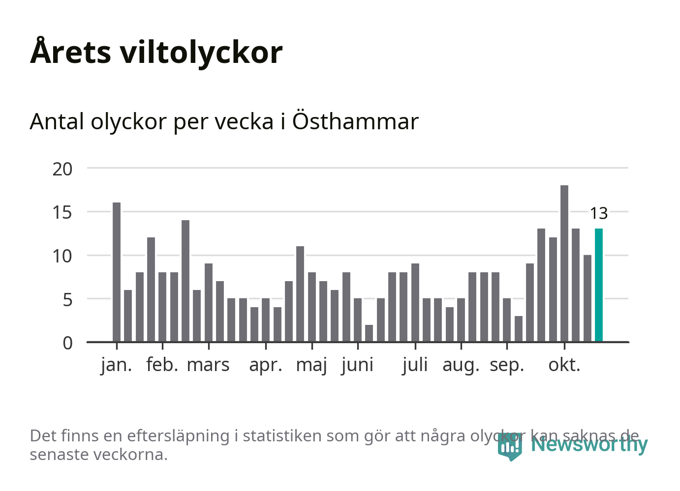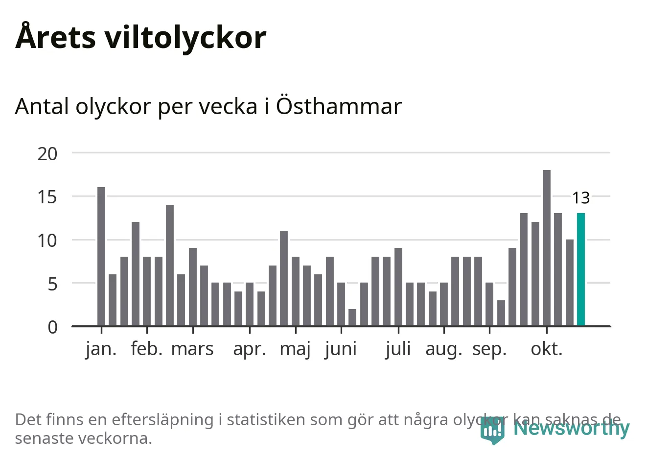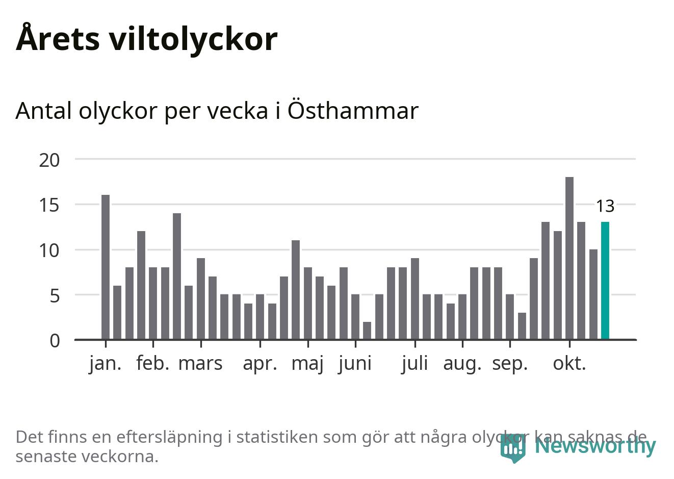 Hittills har 13 viltolyckor rapporterats in i Östhammars kommun från vecka 44. Se listan här.