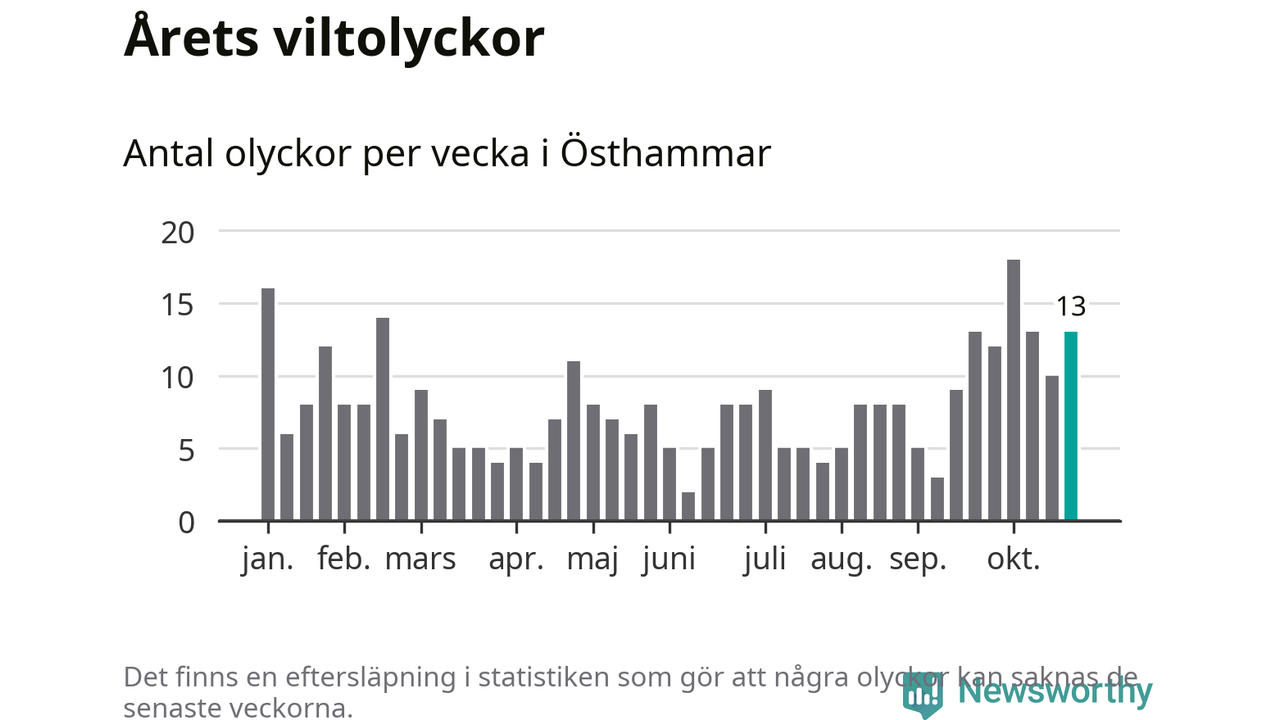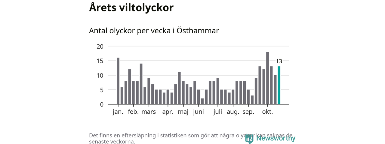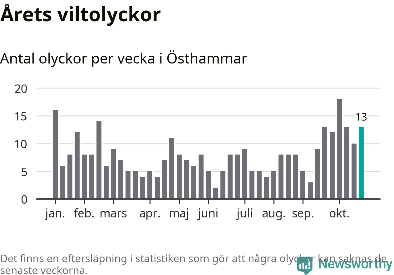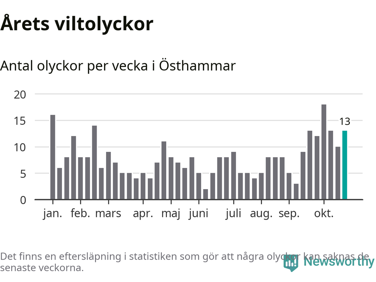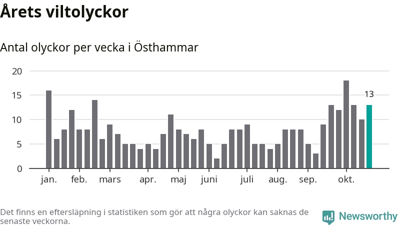Hittills har 13 viltolyckor rapporterats in i Östhammars kommun från vecka 44. Se listan här.