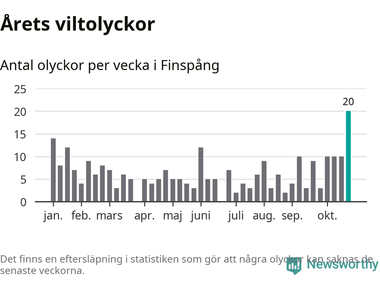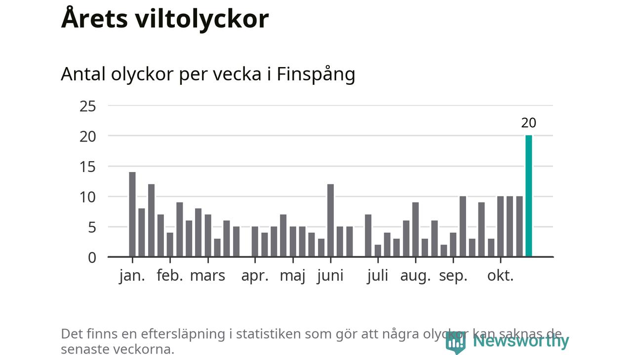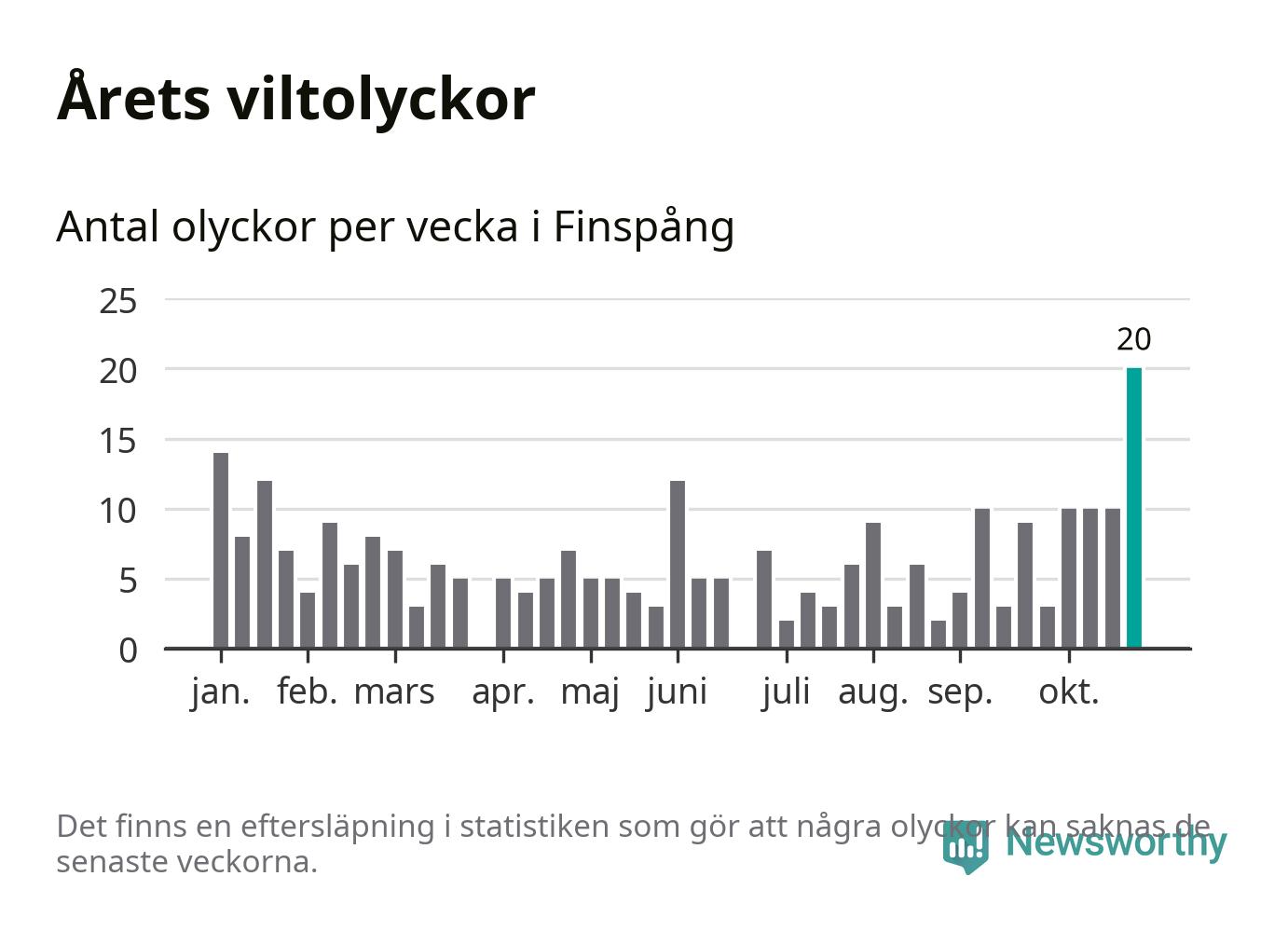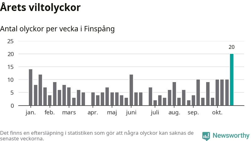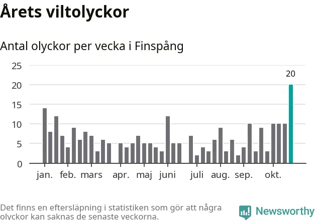 Under vecka 44 rapporterades 20 viltolyckor in i Finspångs kommun. Det är det största antalet på en enskild vecka hittills i år.